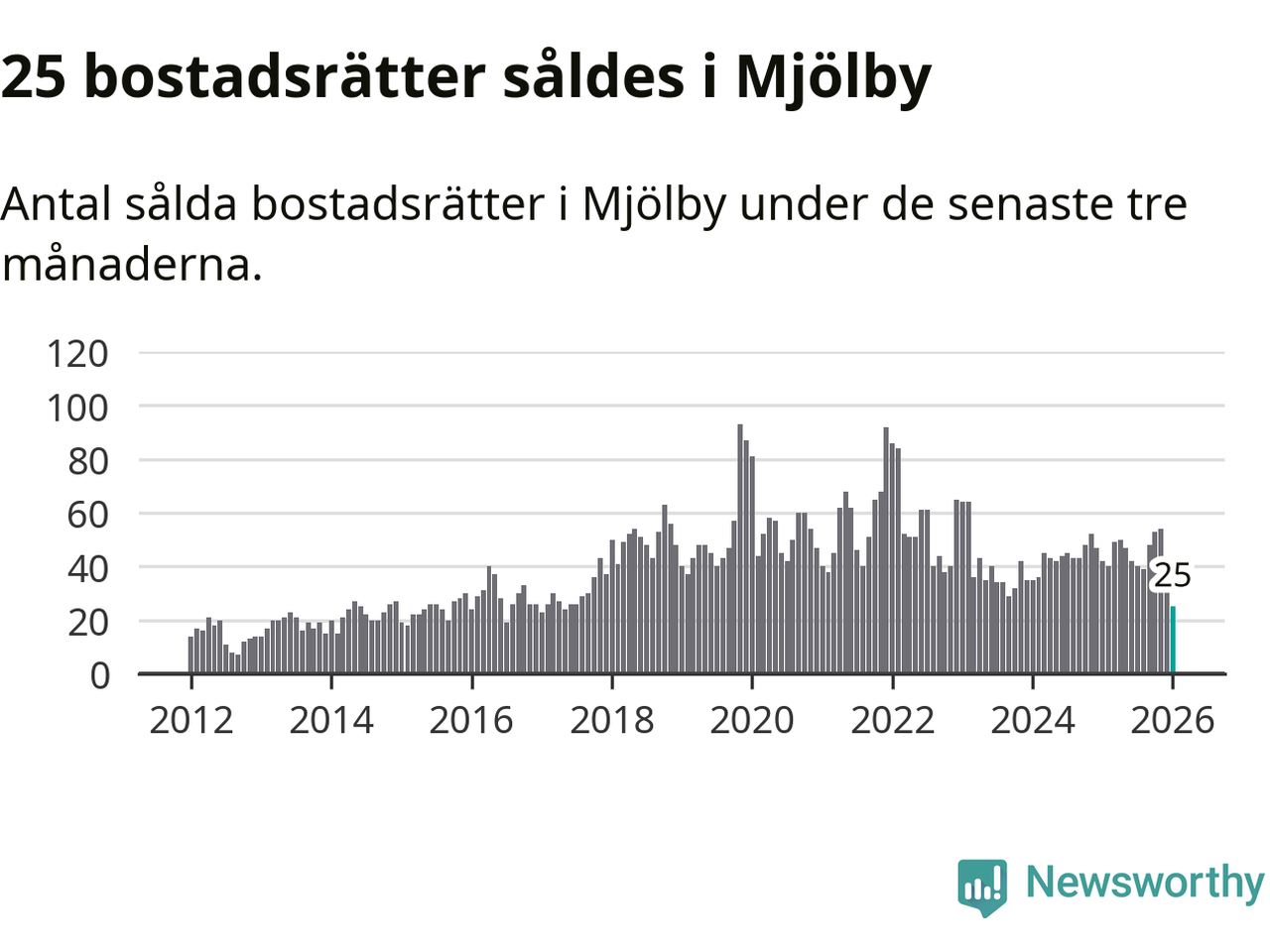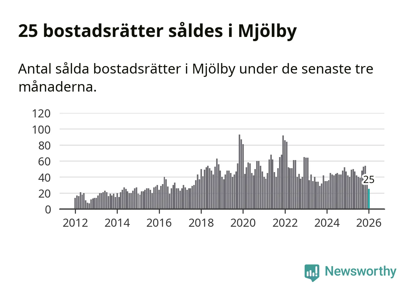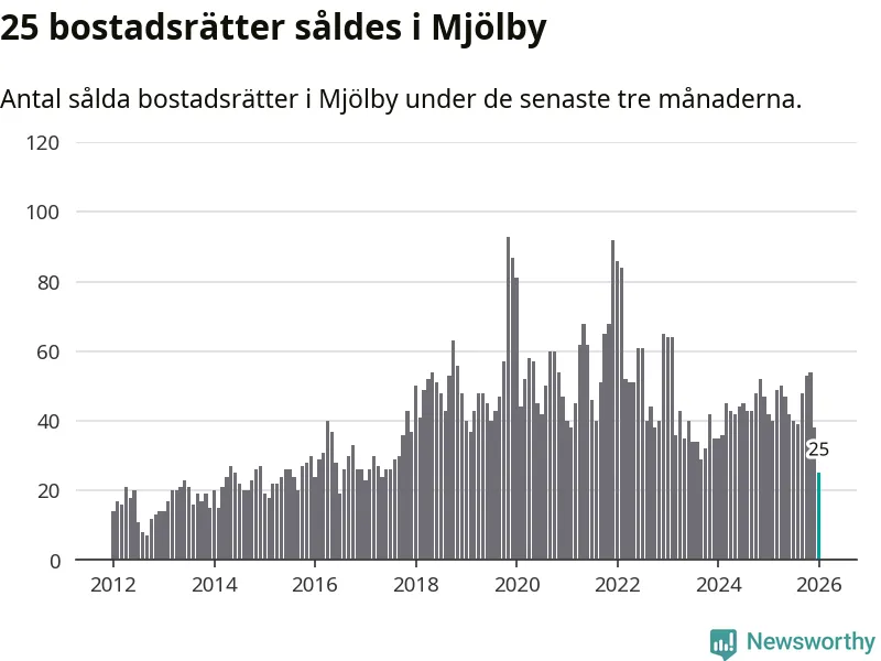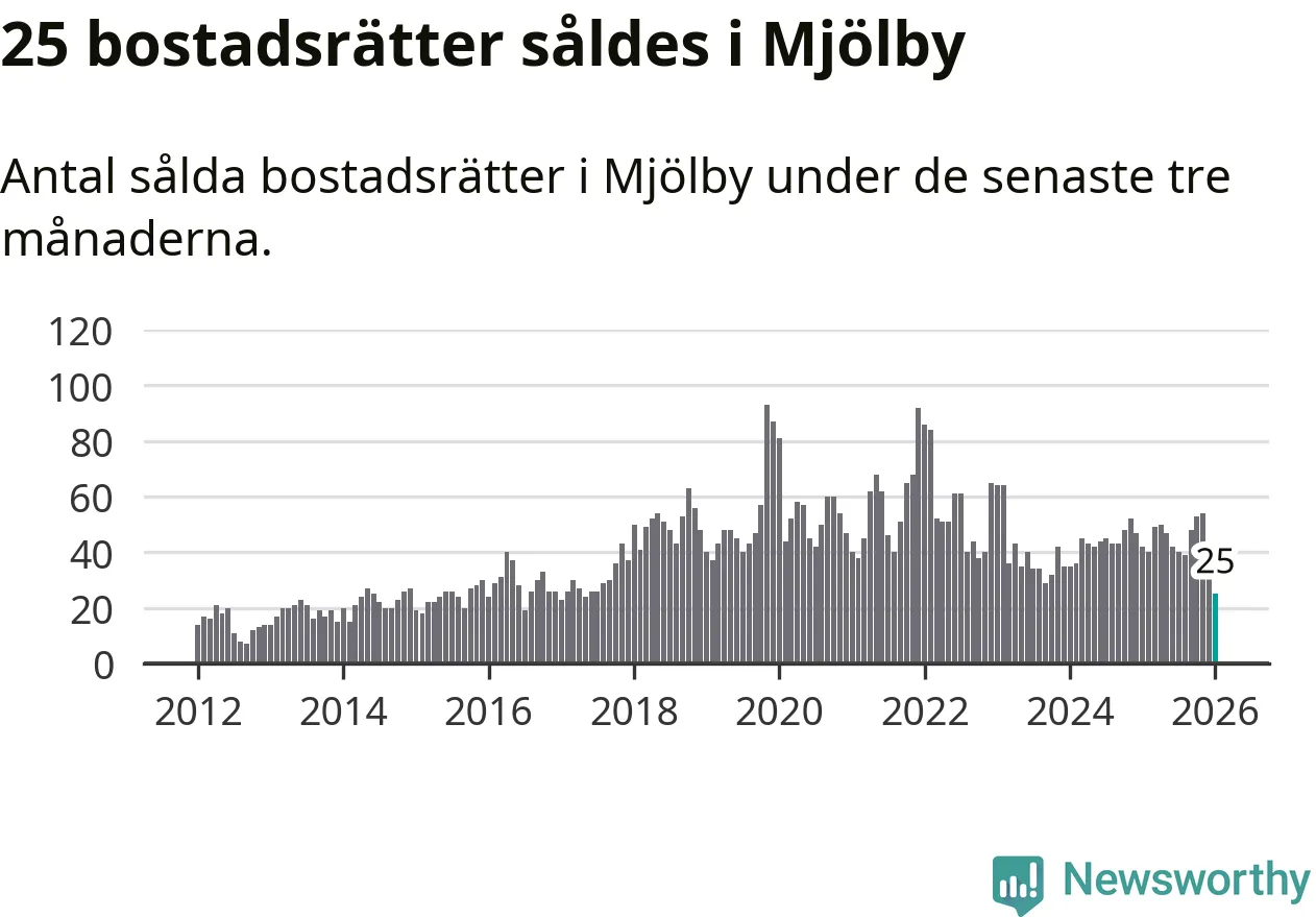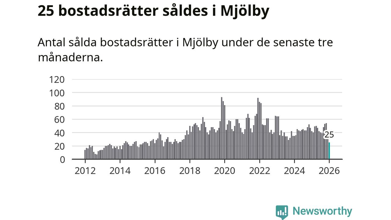 Mellan november och januari såldes 25 bostadsrätter i Mjölby kommun. Det är färre än någon tremånadersperiod sedan 2017.