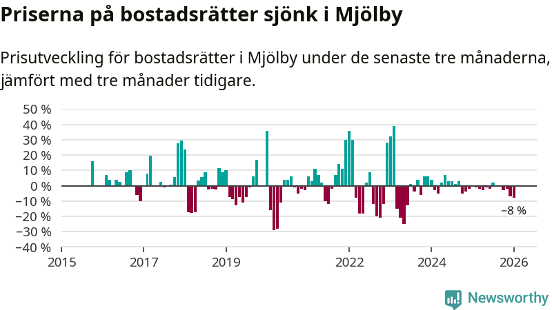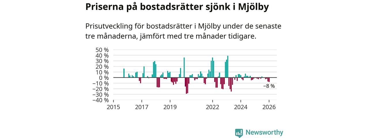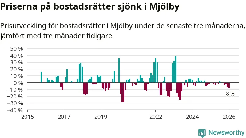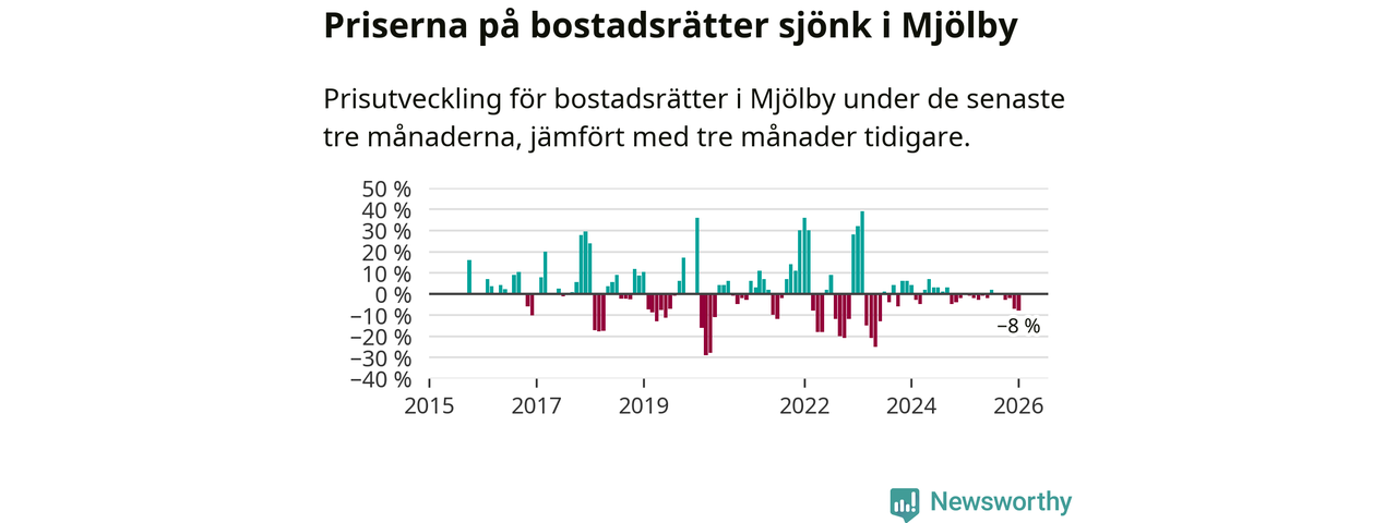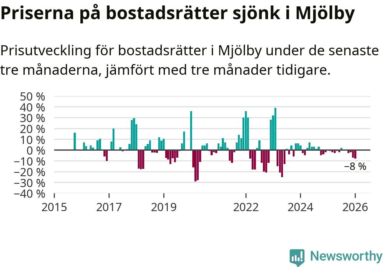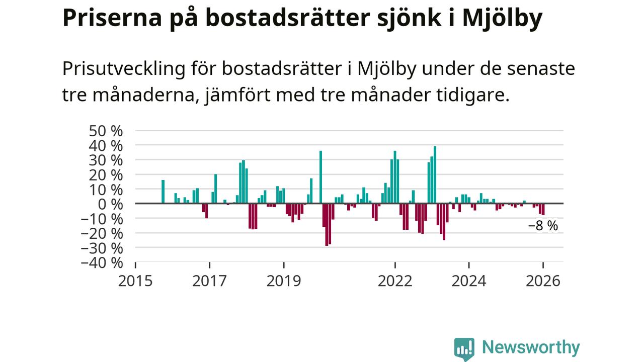 Statistiken visar även på en stor prisnedgång i Mjölby kommun. Medelpriset på försäljningarna av bostadsrätter i kommunen var 8 procent lägre än för tre månader sedan. Även i hela Östergötland sjunker priserna på bostadsrätter. I hela länet noterades en prisnedgång på 2 procent.