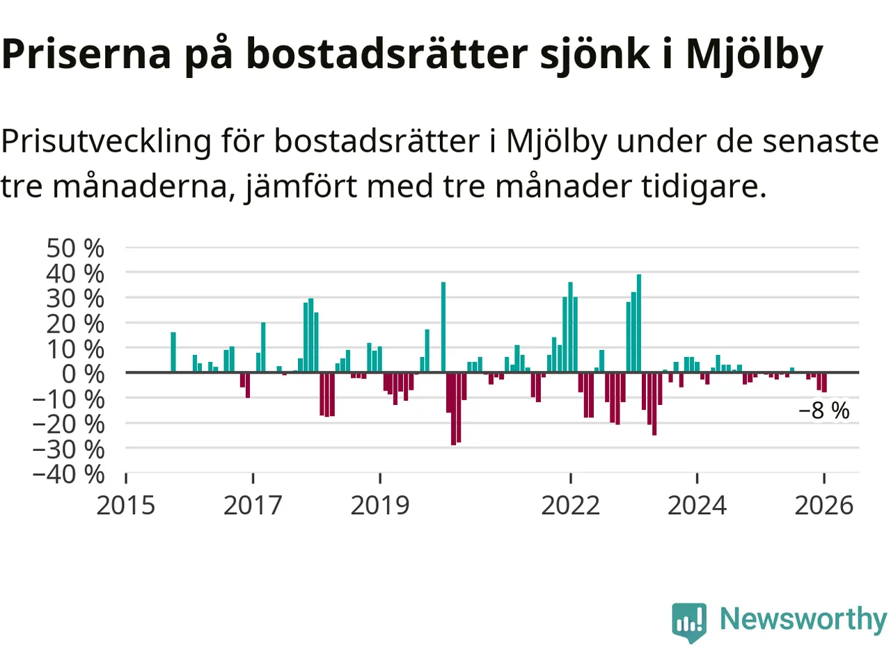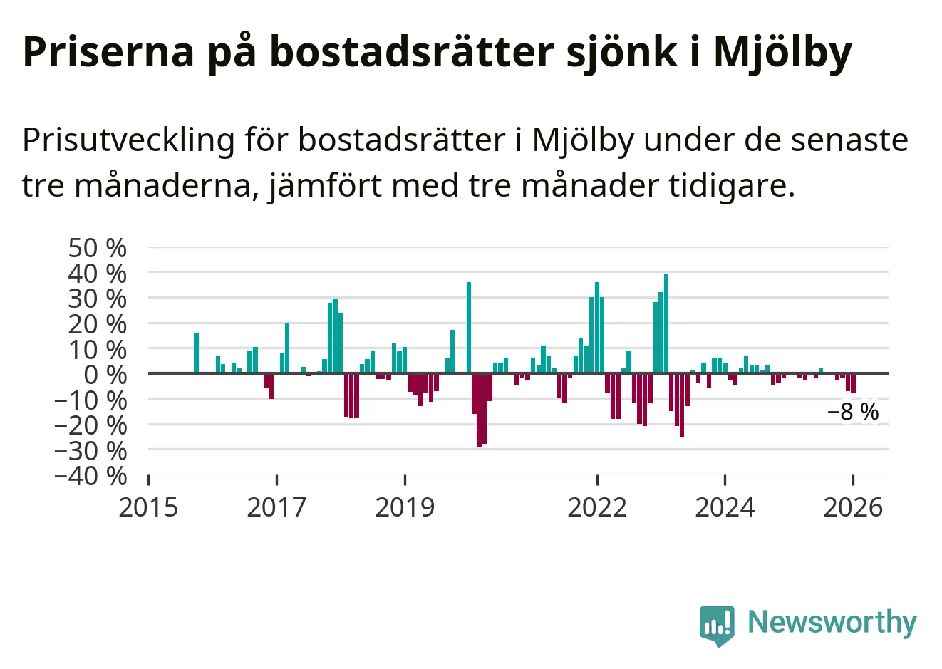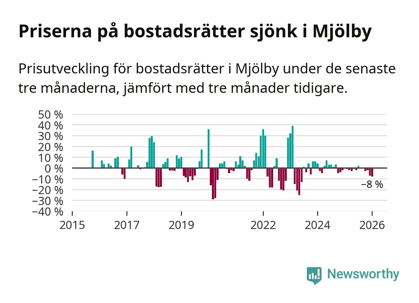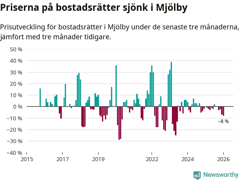 Statistiken visar även på en stor prisnedgång i Mjölby kommun. Medelpriset på försäljningarna av bostadsrätter i kommunen var 8 procent lägre än för tre månader sedan. Även i hela Östergötland sjunker priserna på bostadsrätter. I hela länet noterades en prisnedgång på 2 procent.