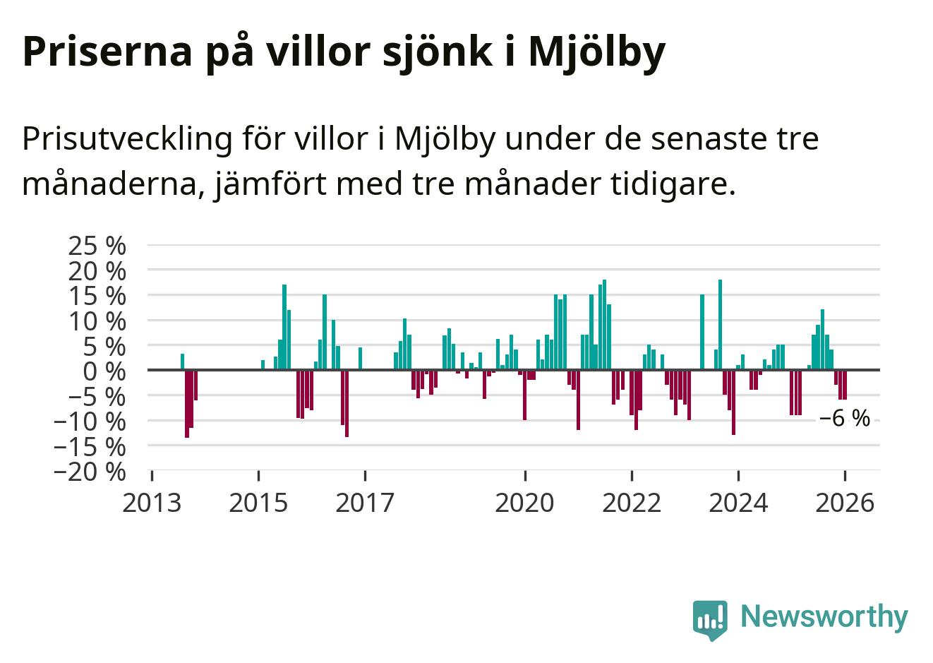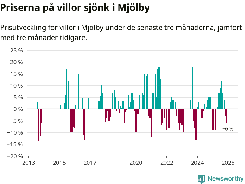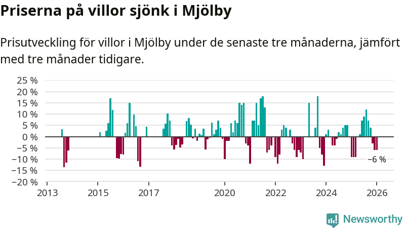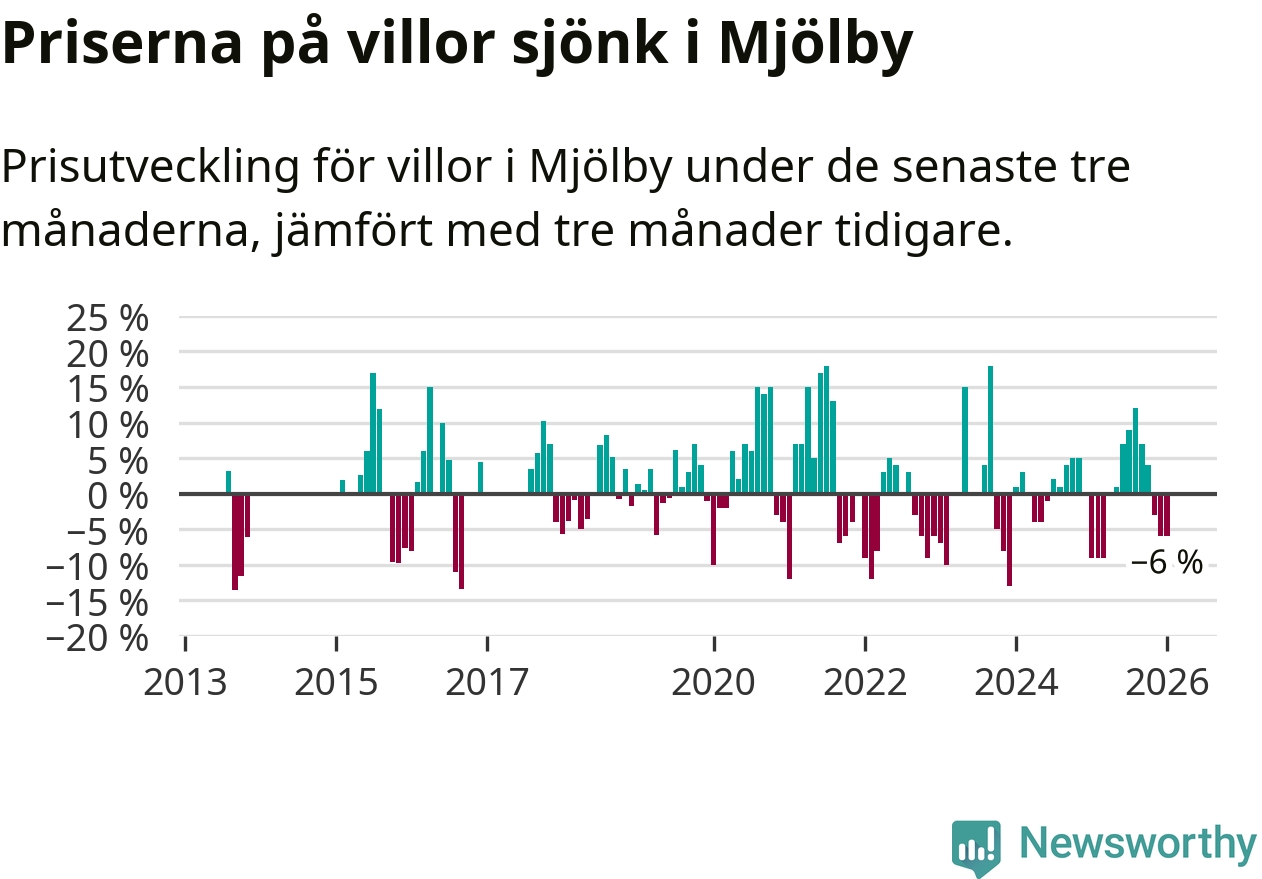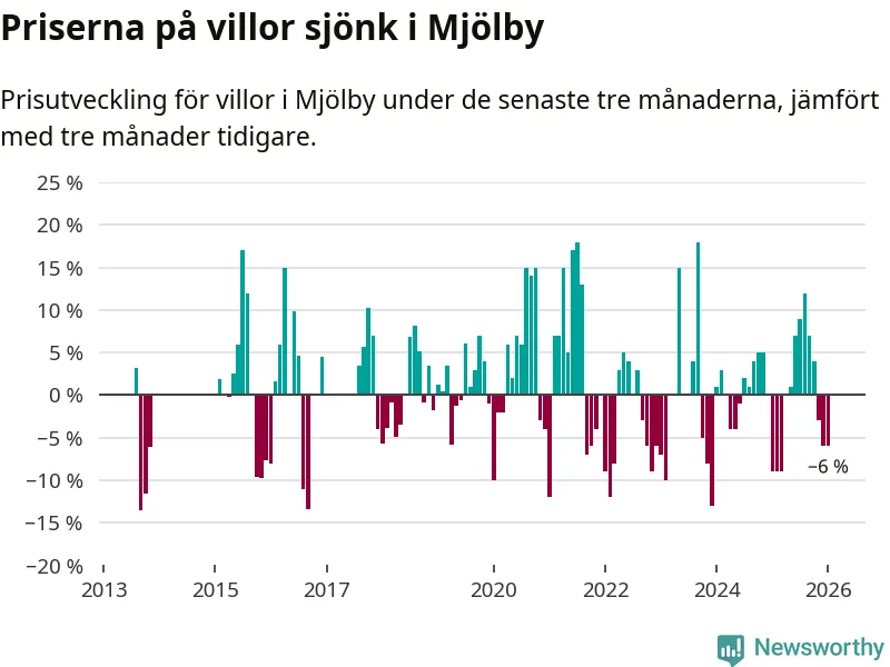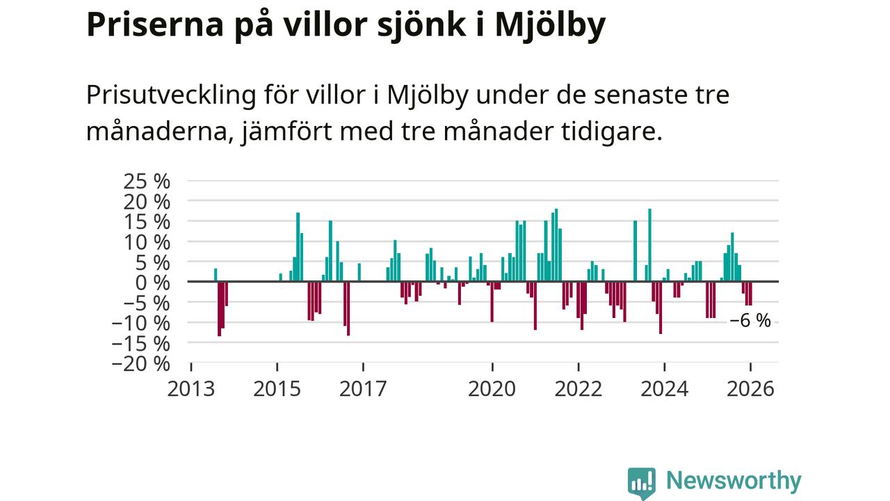 Villapriserna har gått ner i Mjölby kommun. Medelpriset på försäljningarna under de senaste tre månaderna visar på en nedgång med 6 procent.