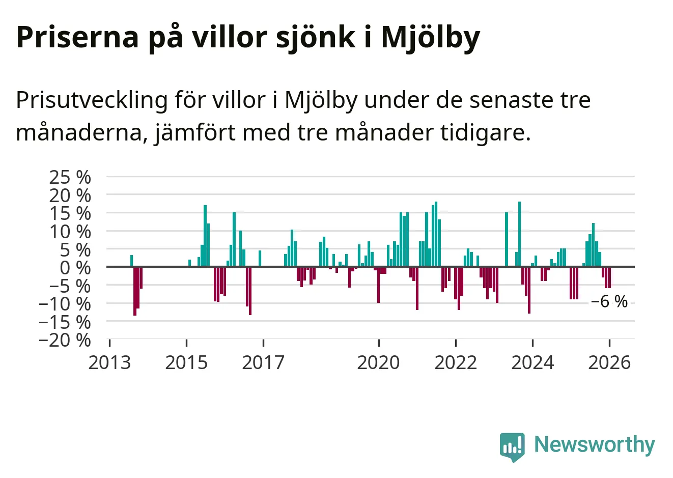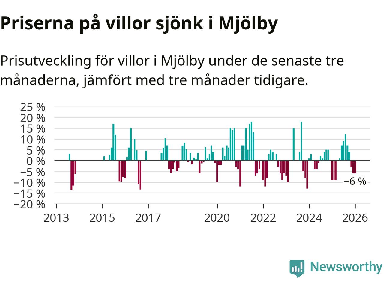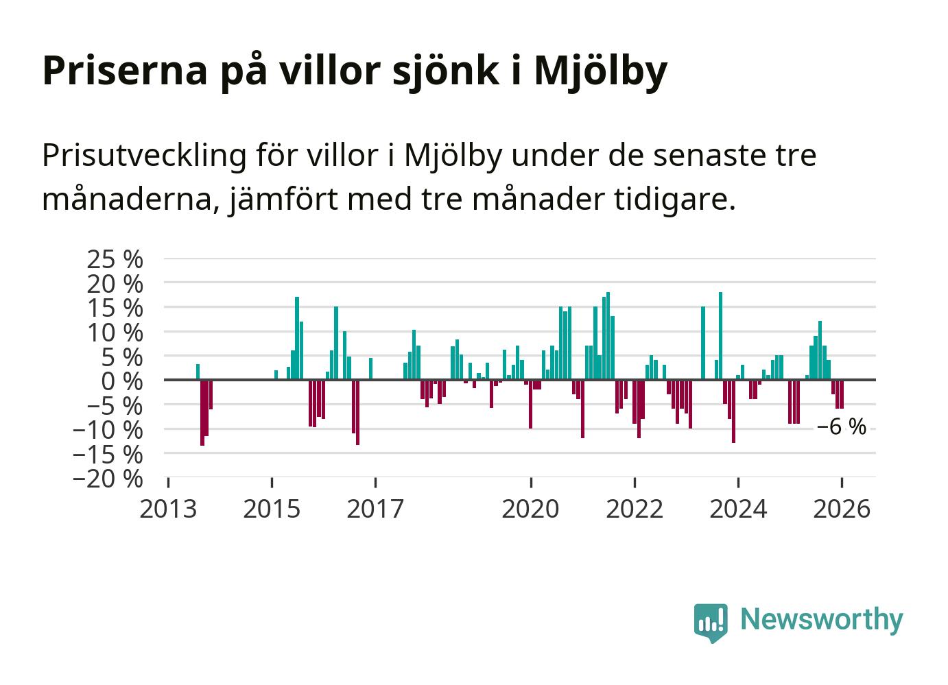 Villapriserna har gått ner i Mjölby kommun. Medelpriset på försäljningarna under de senaste tre månaderna visar på en nedgång med 6 procent.
