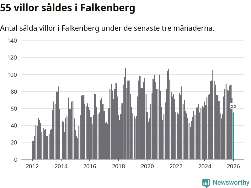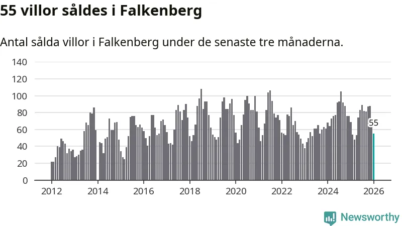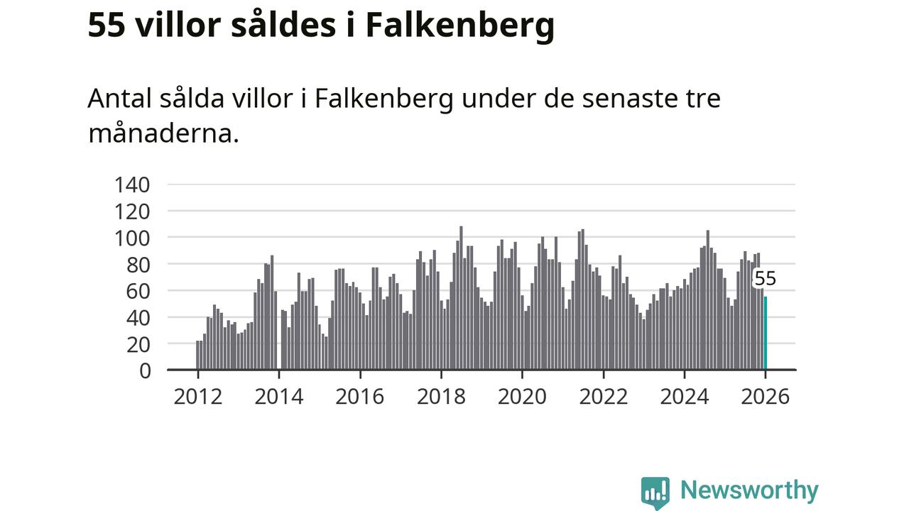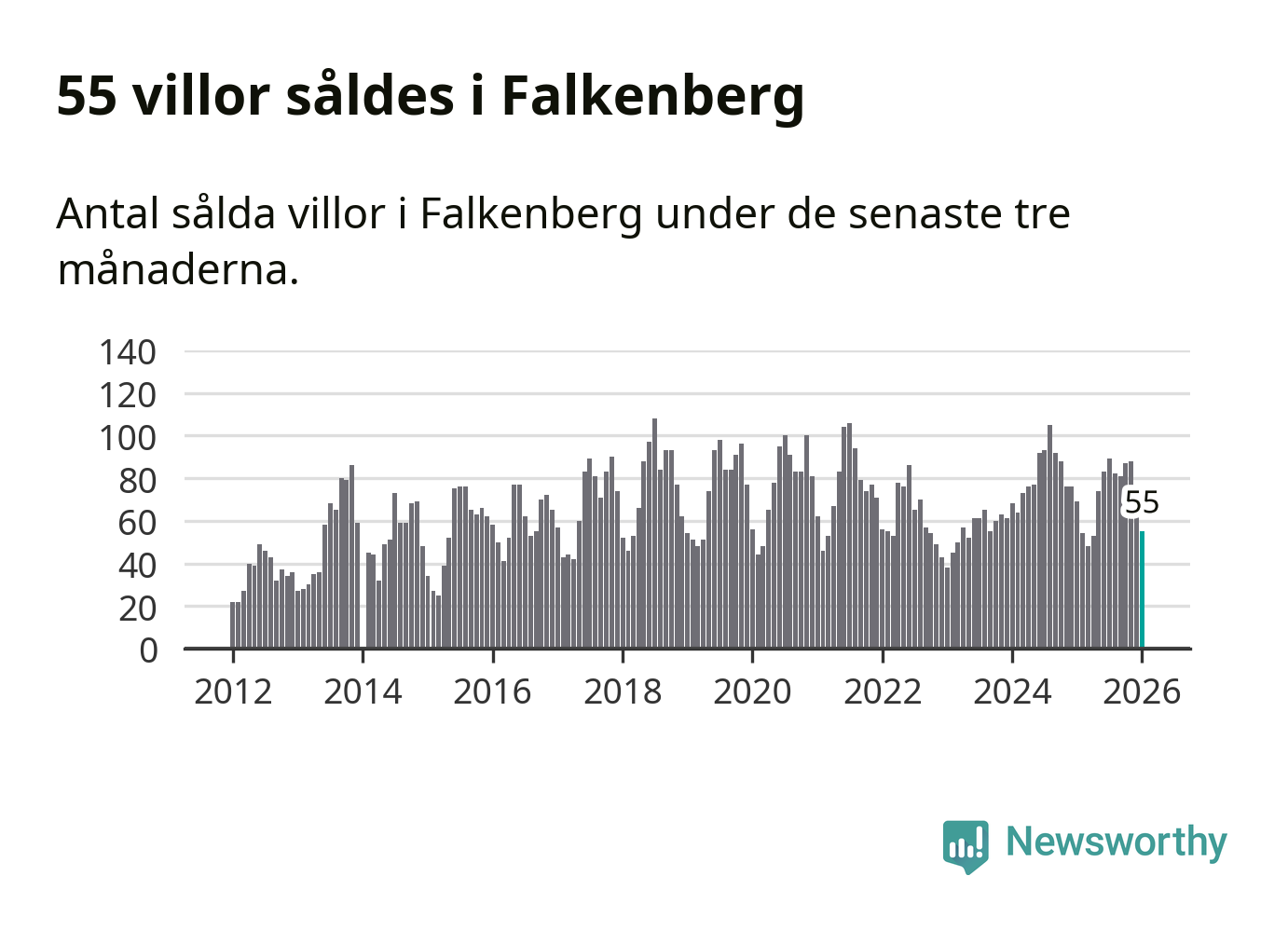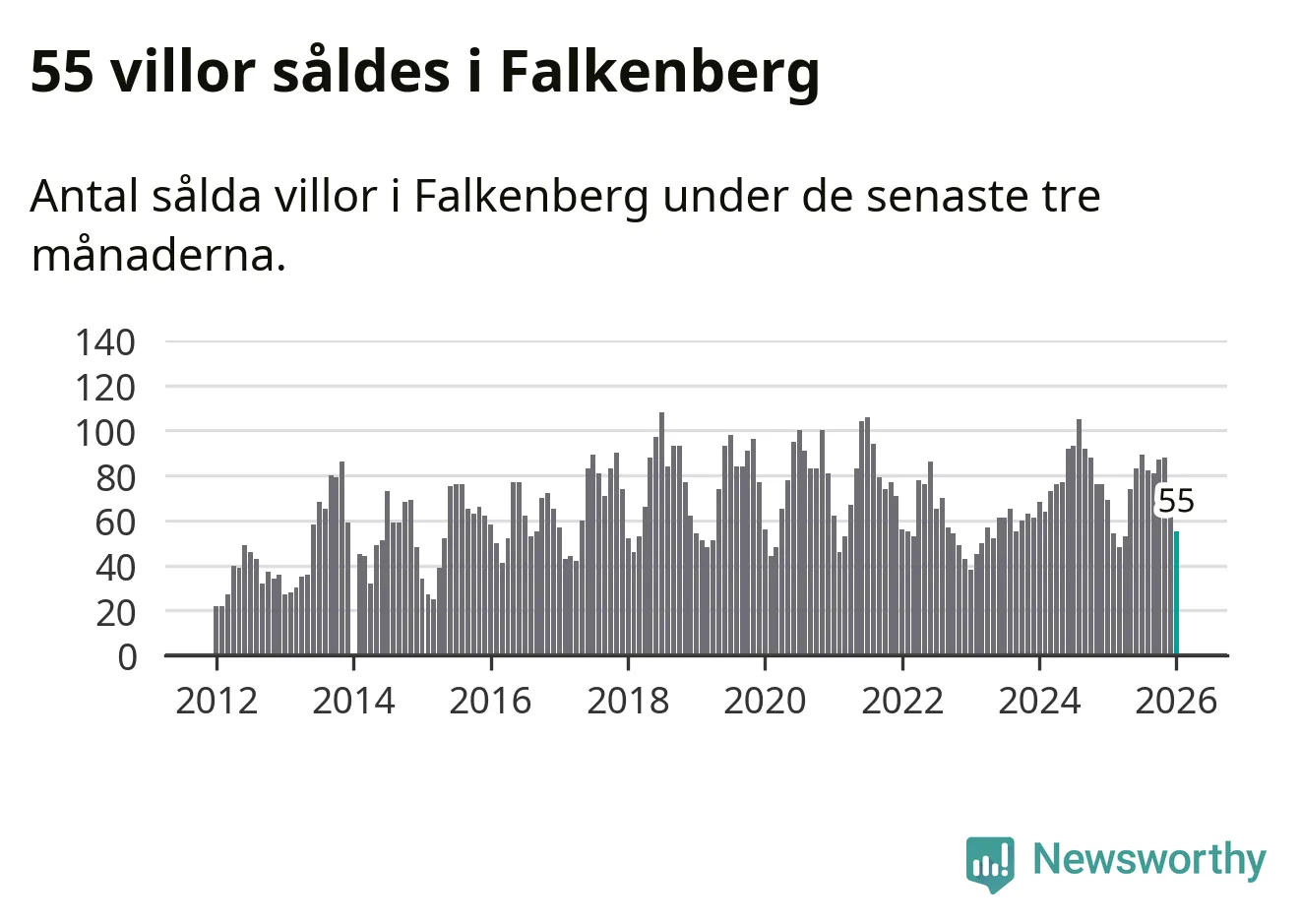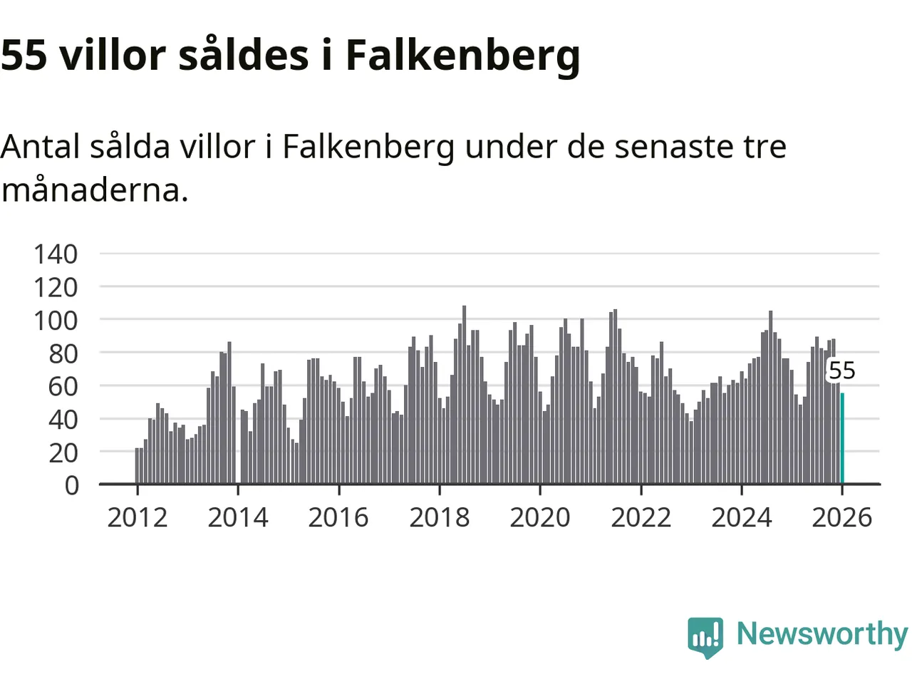 Sammanlagt såldes 55 villor i Falkenbergs kommun mellan november och januari till ett genomsnittligt pris på 3,7 miljoner kronor. I fjol gjordes 69 affärer vid den här tiden på året.