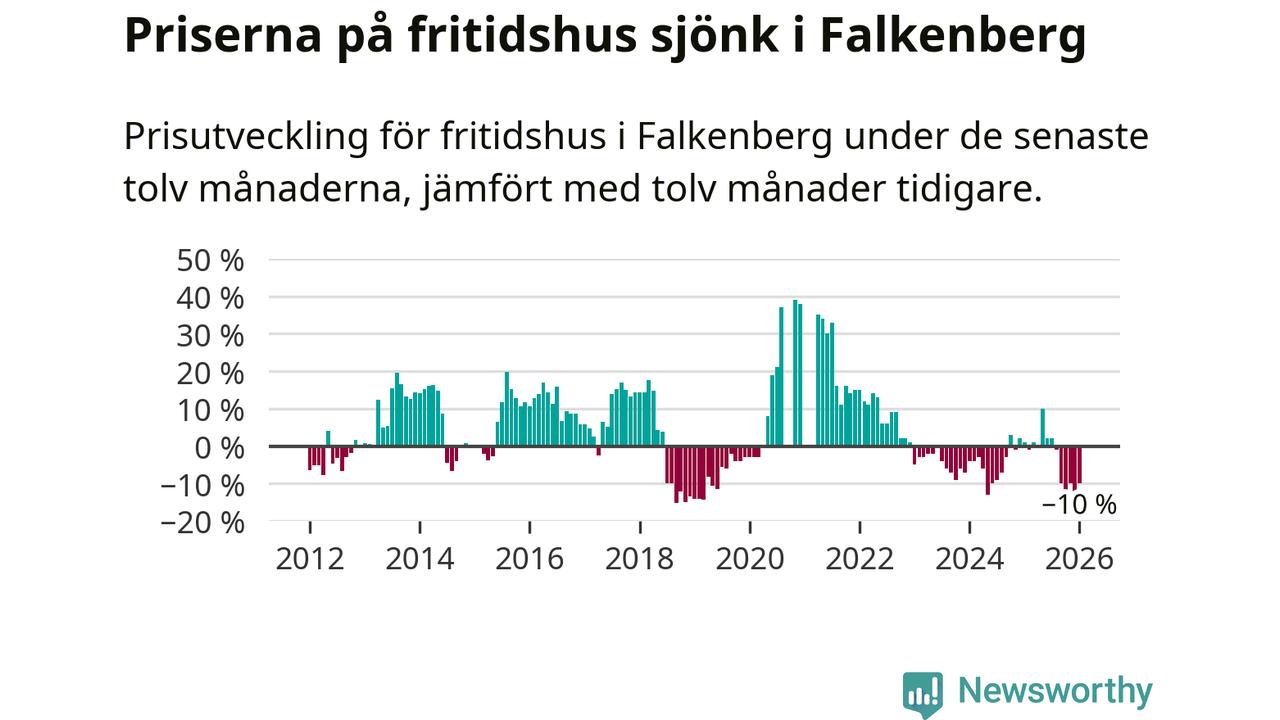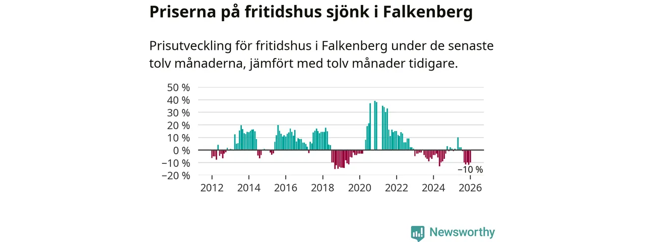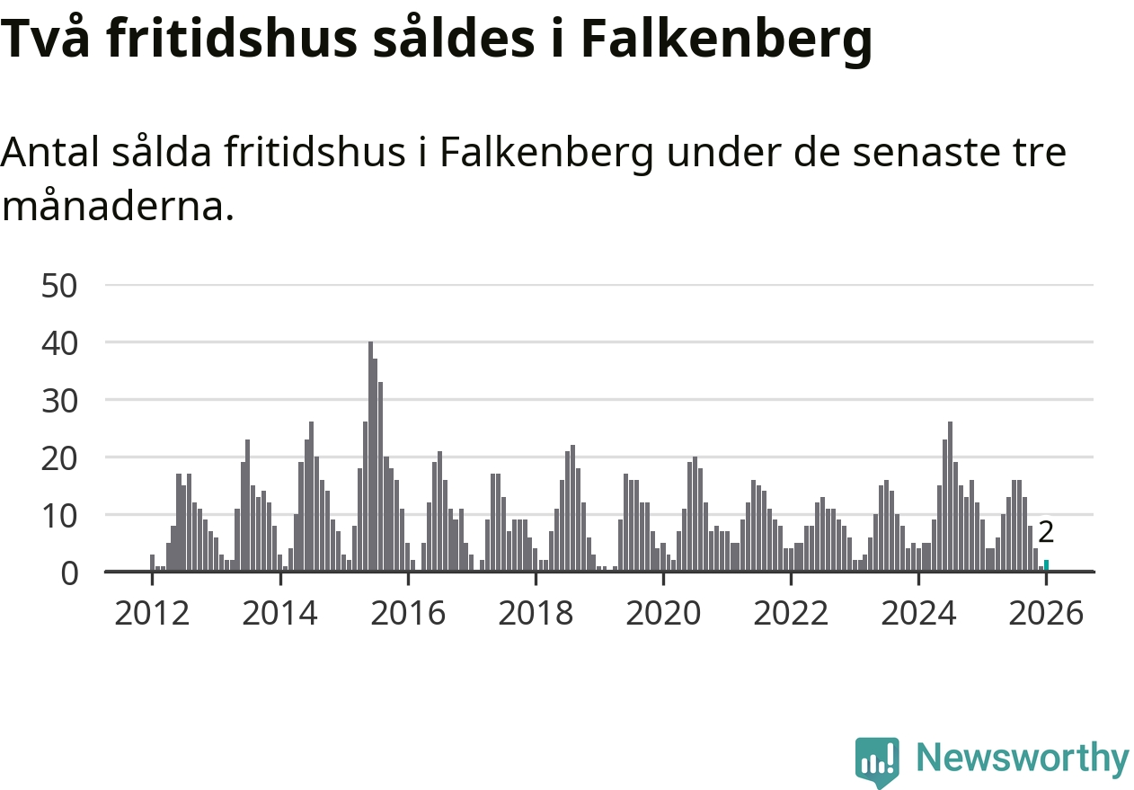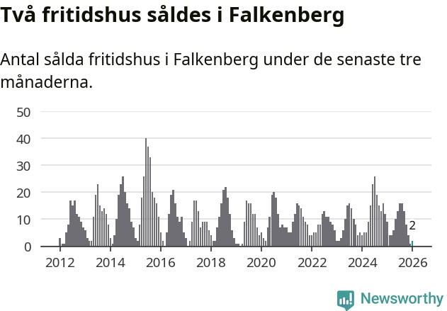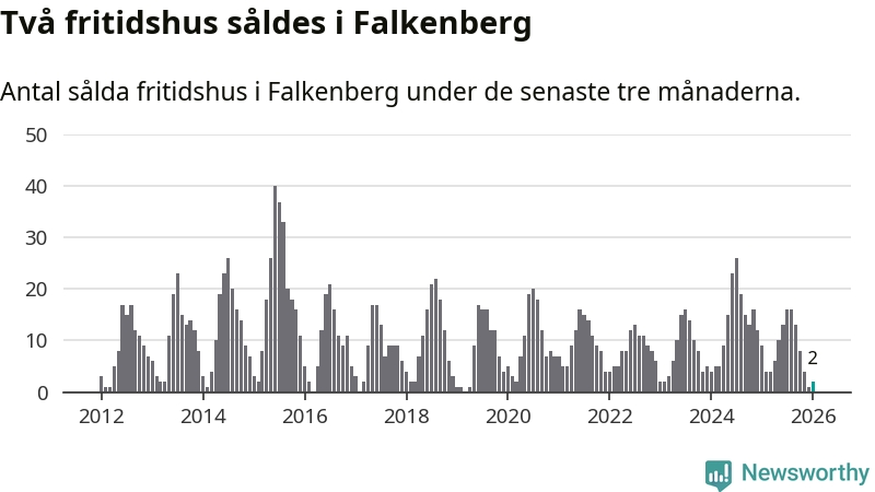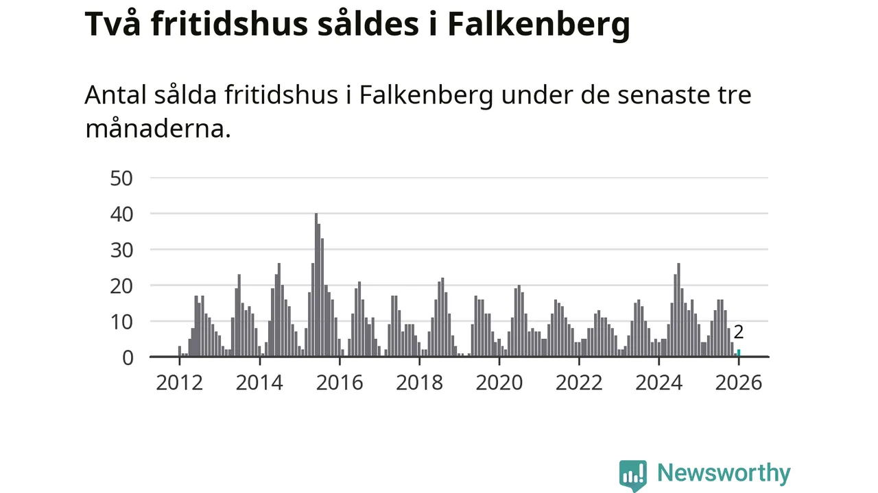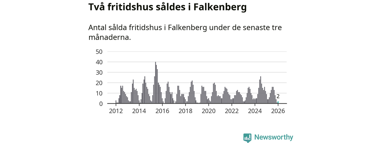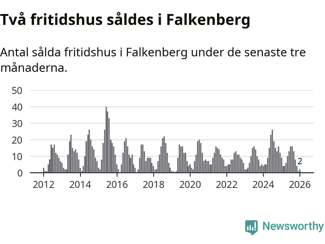 Sammanlagt såldes två fritidshus i Falkenbergs kommun mellan november 2025 och januari till ett genomsnittligt pris på 3,0 miljoner kronor. I fjol gjordes nio affärer vid den här tiden på året.