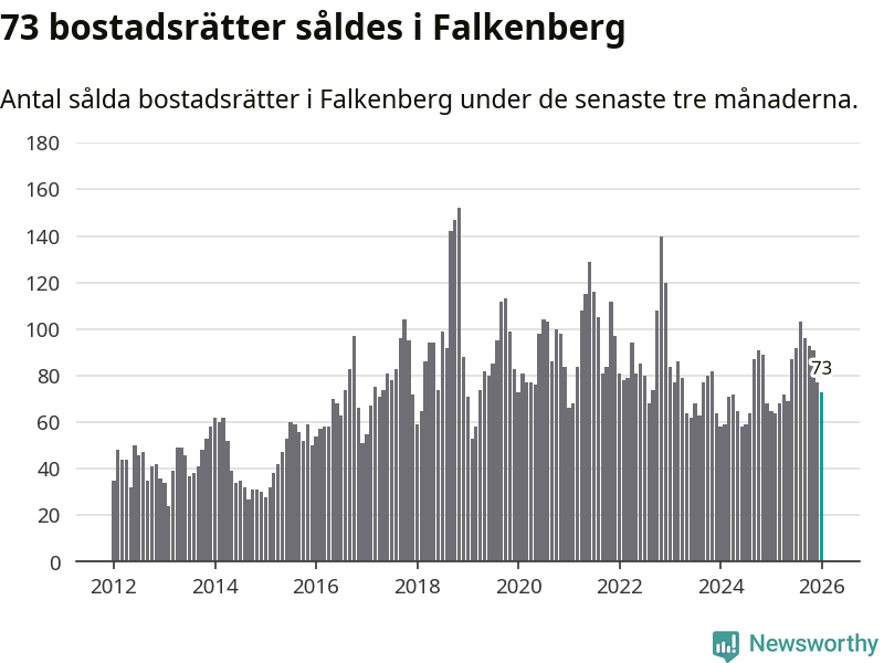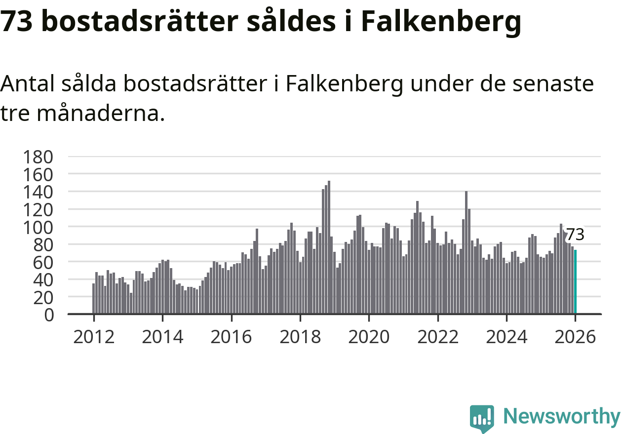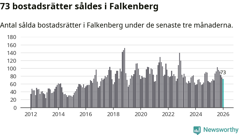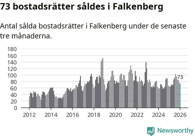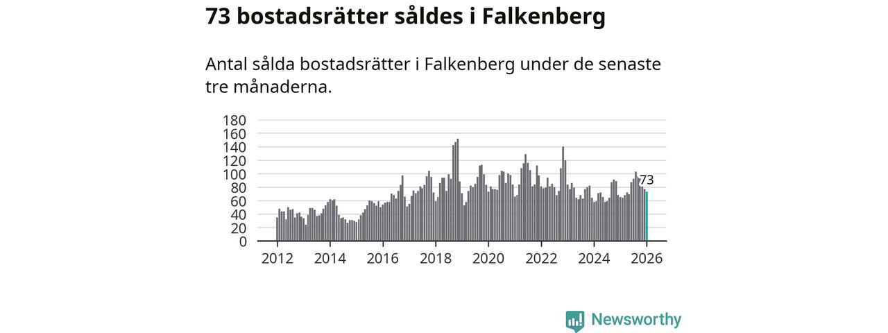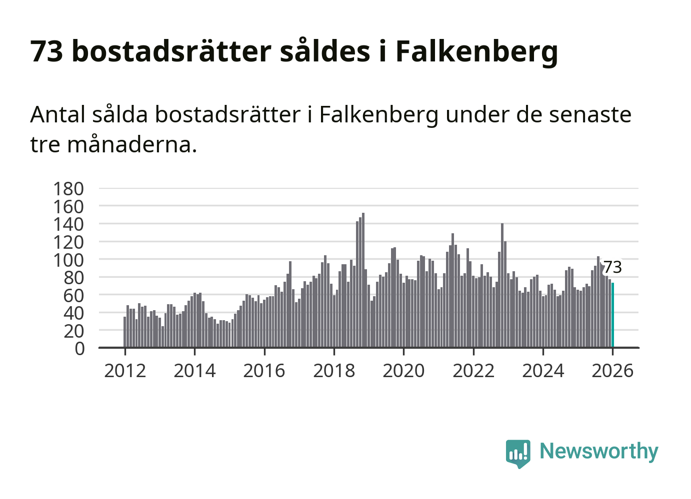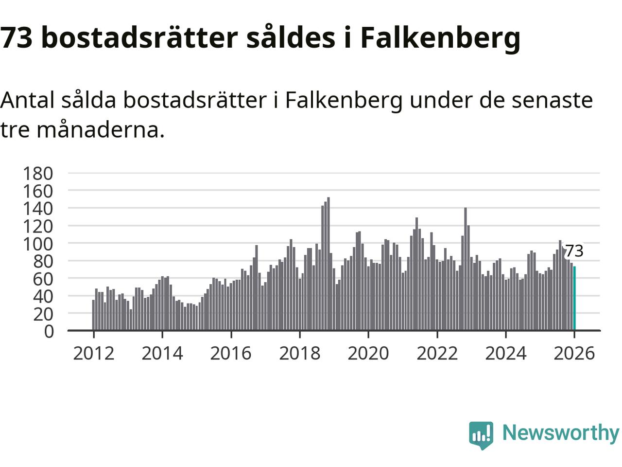 Sammanlagt såldes 73 bostadsrätter i Falkenbergs kommun mellan november och januari till ett genomsnittligt pris på 1,9 miljoner kronor. I fjol gjordes 65 affärer vid den här tiden på året.