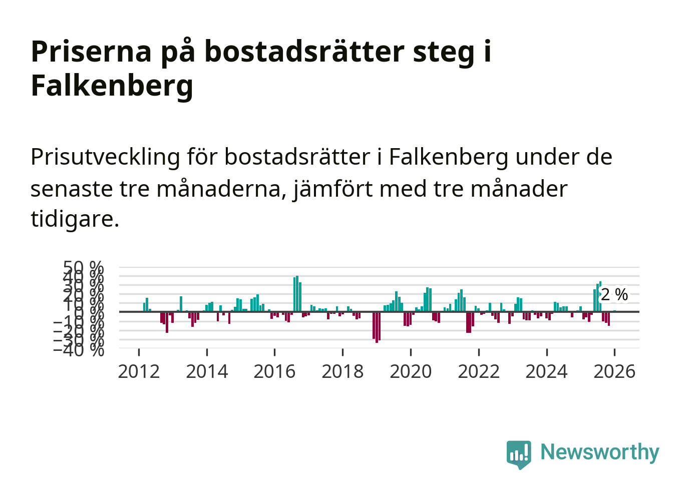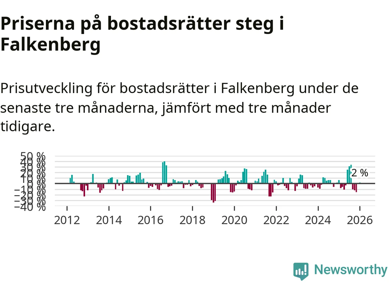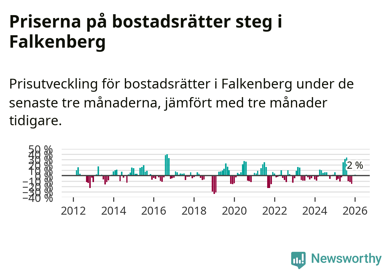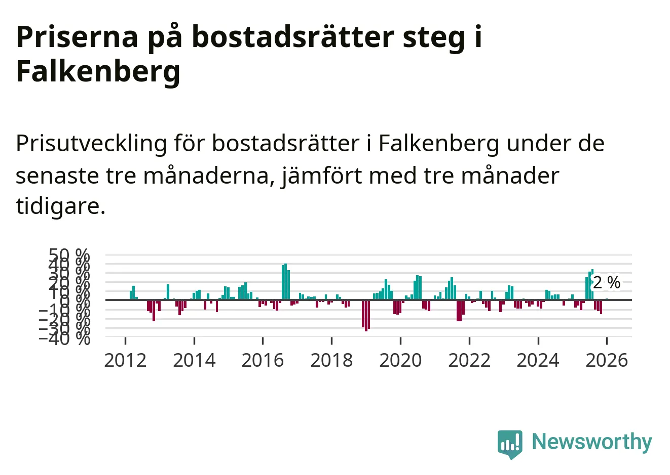 Priserna på bostadsrätter har gått upp i Falkenbergs kommun. Medelpriset på försäljningarna under de senaste tre månaderna visar på en uppgång med 2 procent.