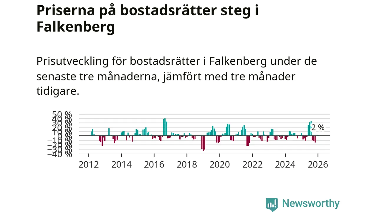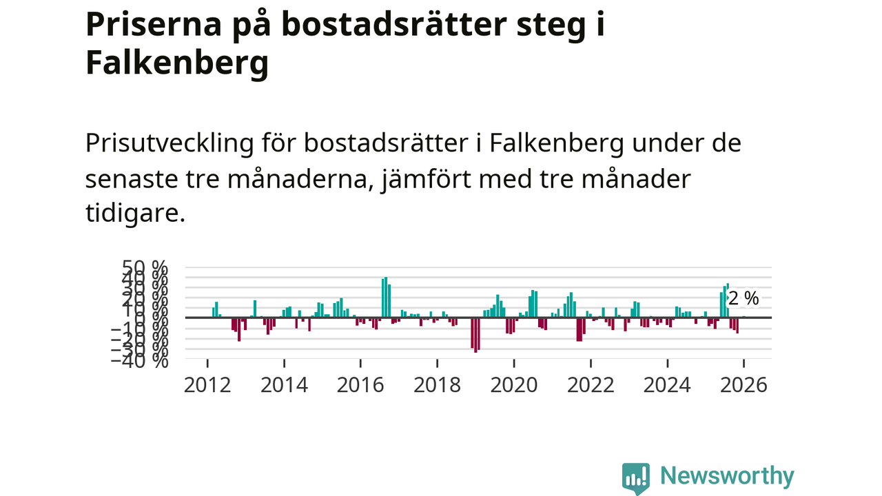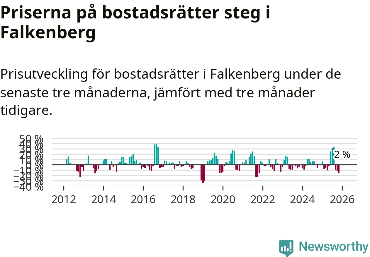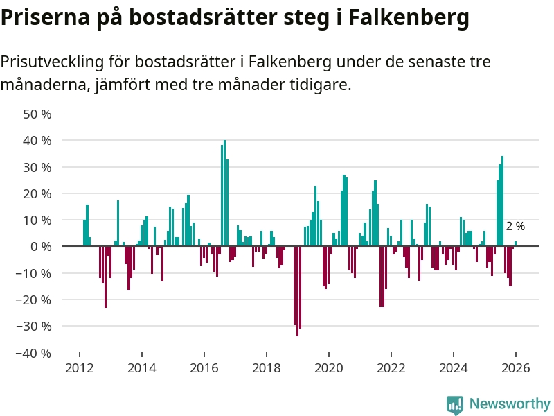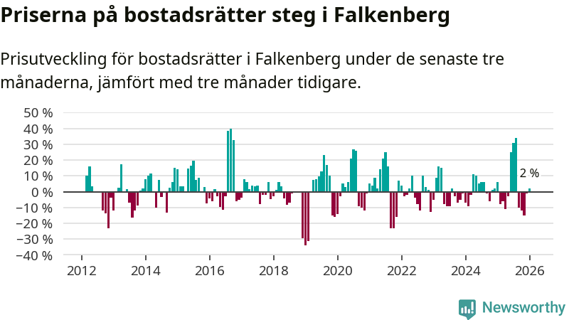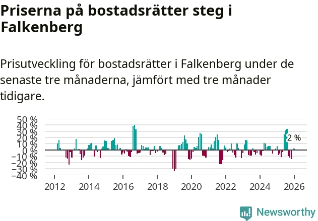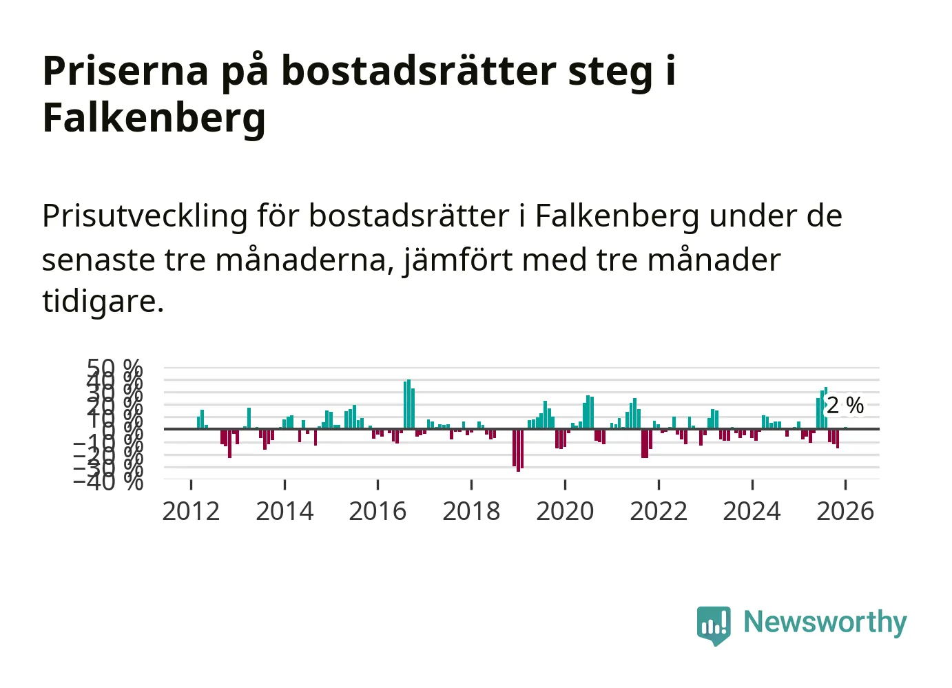 Priserna på bostadsrätter har gått upp i Falkenbergs kommun. Medelpriset på försäljningarna under de senaste tre månaderna visar på en uppgång med 2 procent.