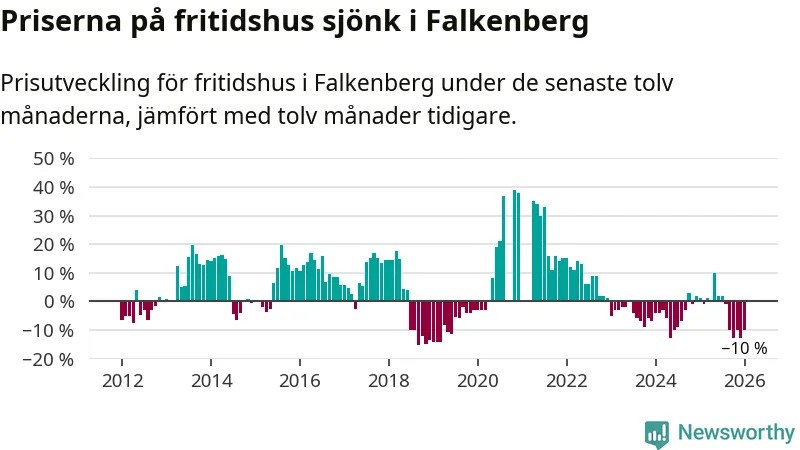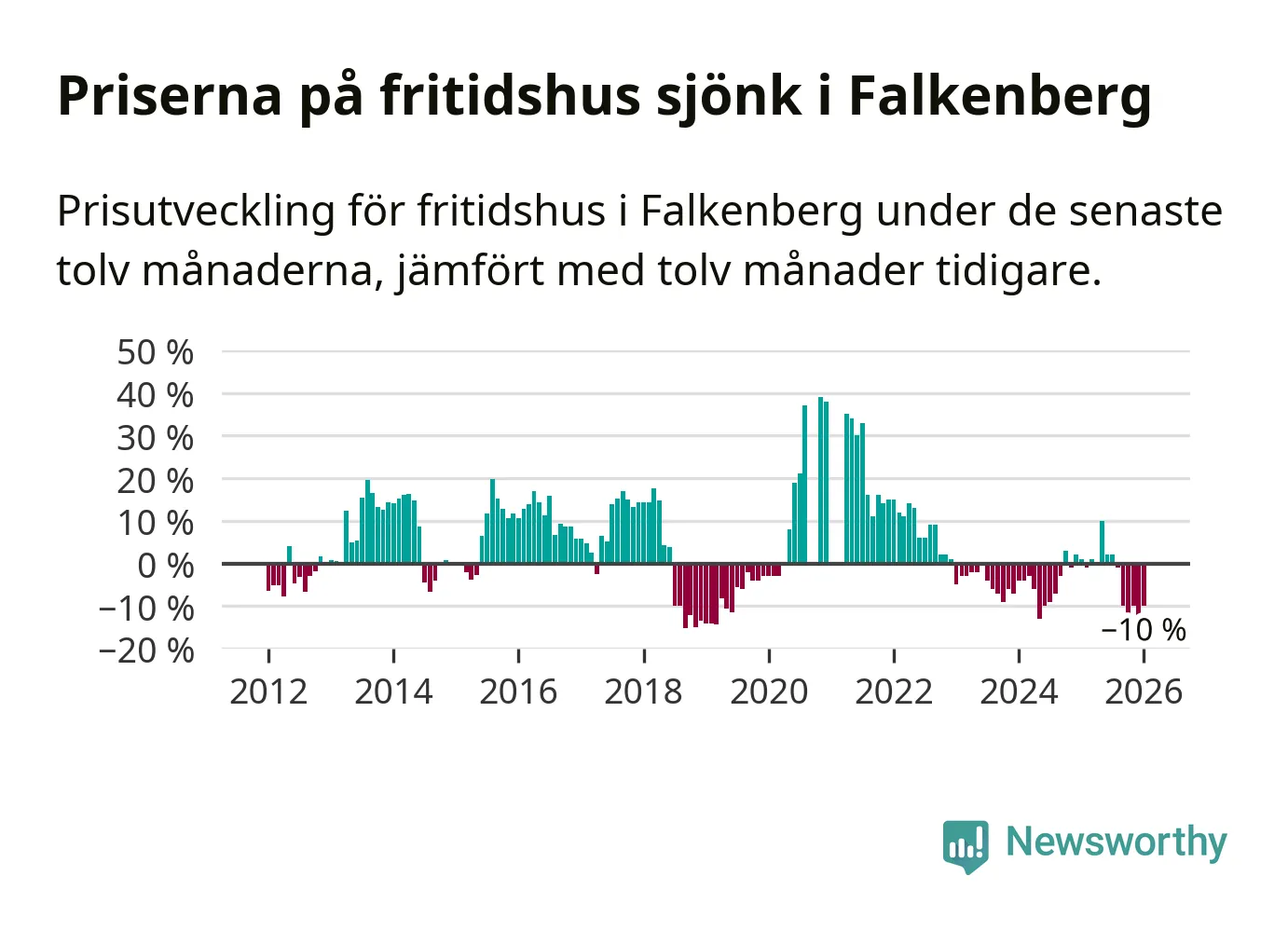 Priserna på fritidshus har gått ner i Falkenbergs kommun. Medelpriset på försäljningarna under de senaste tolv månaderna visar på en nedgång med 10 procent.