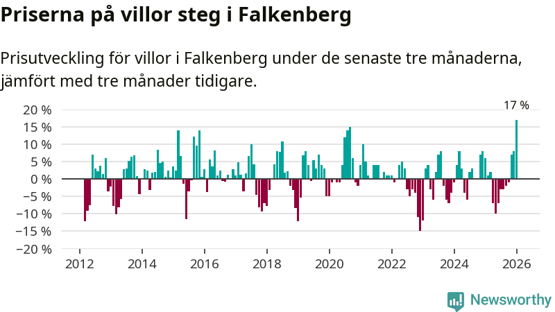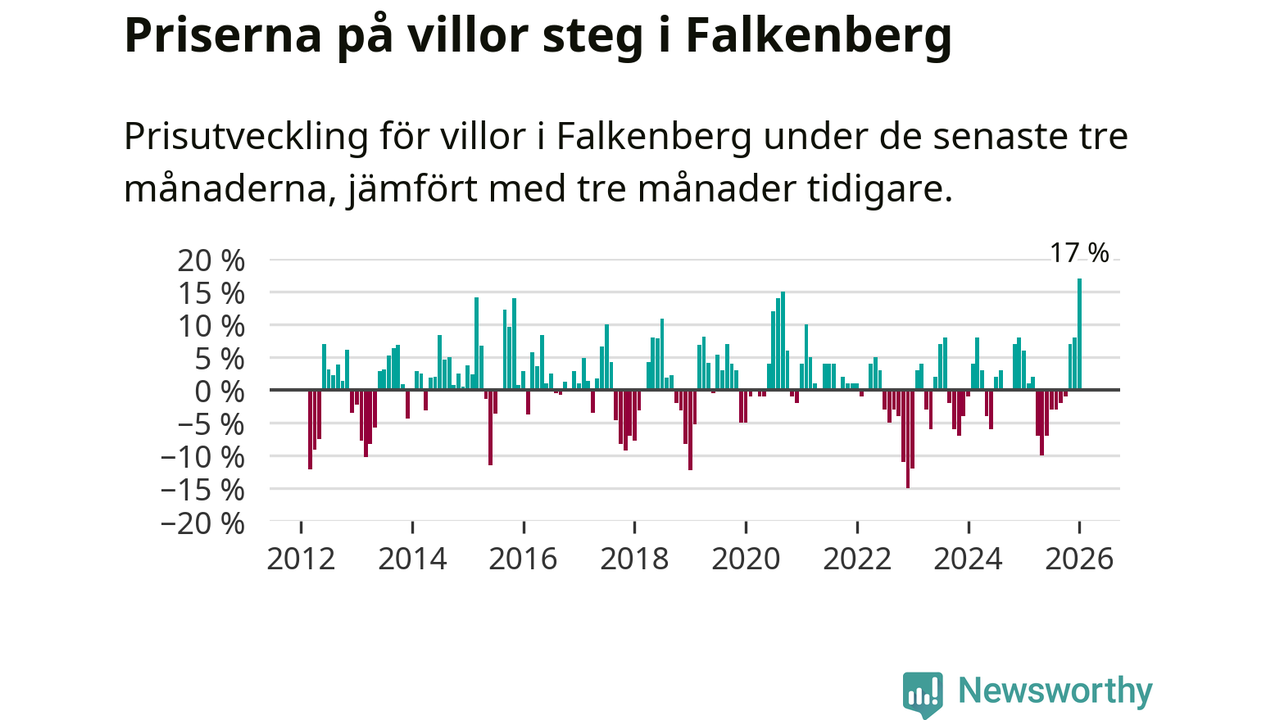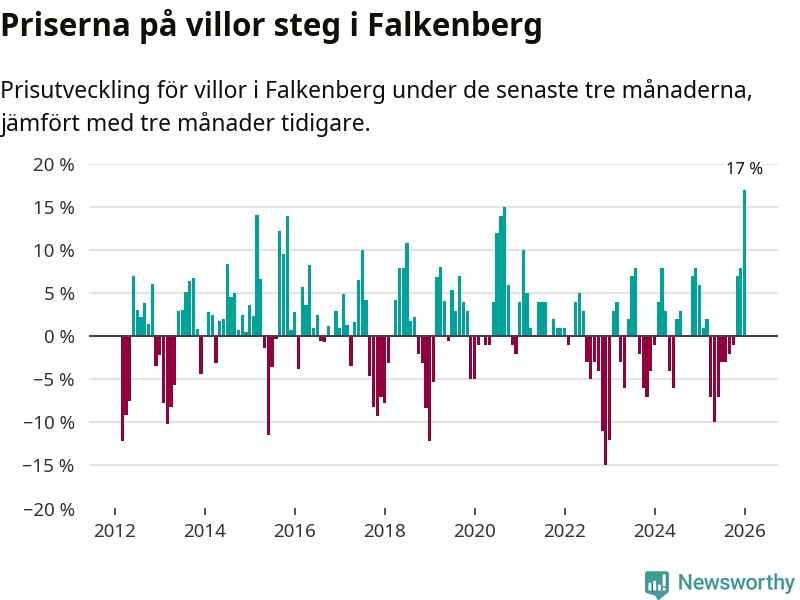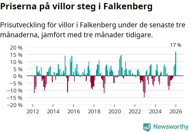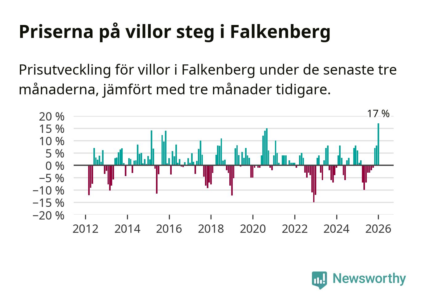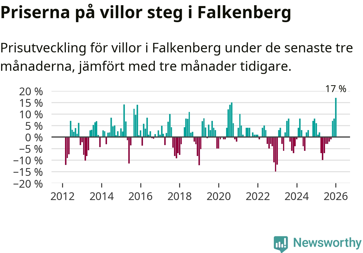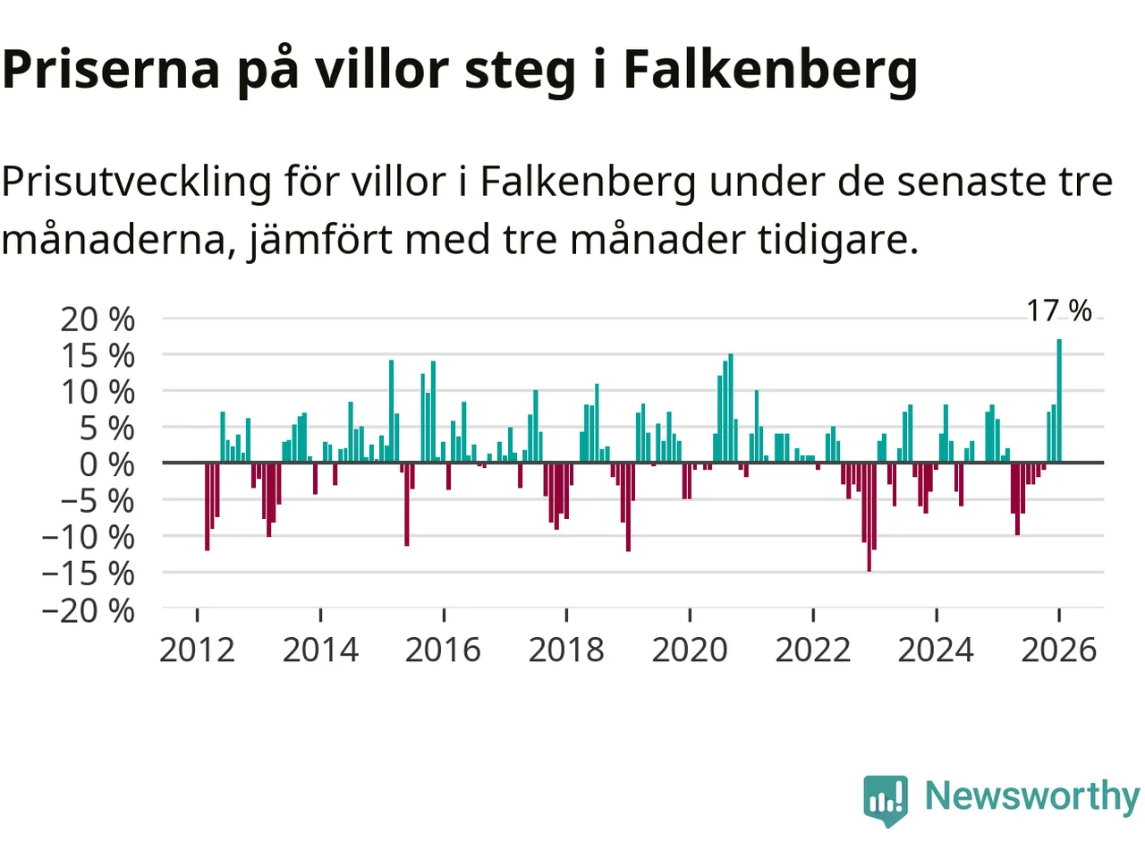Villapriserna steg med 17 procent i Falkenbergs kommun under de senaste tre månaderna. Det är den starkaste prisutvecklingen sedan 2012.