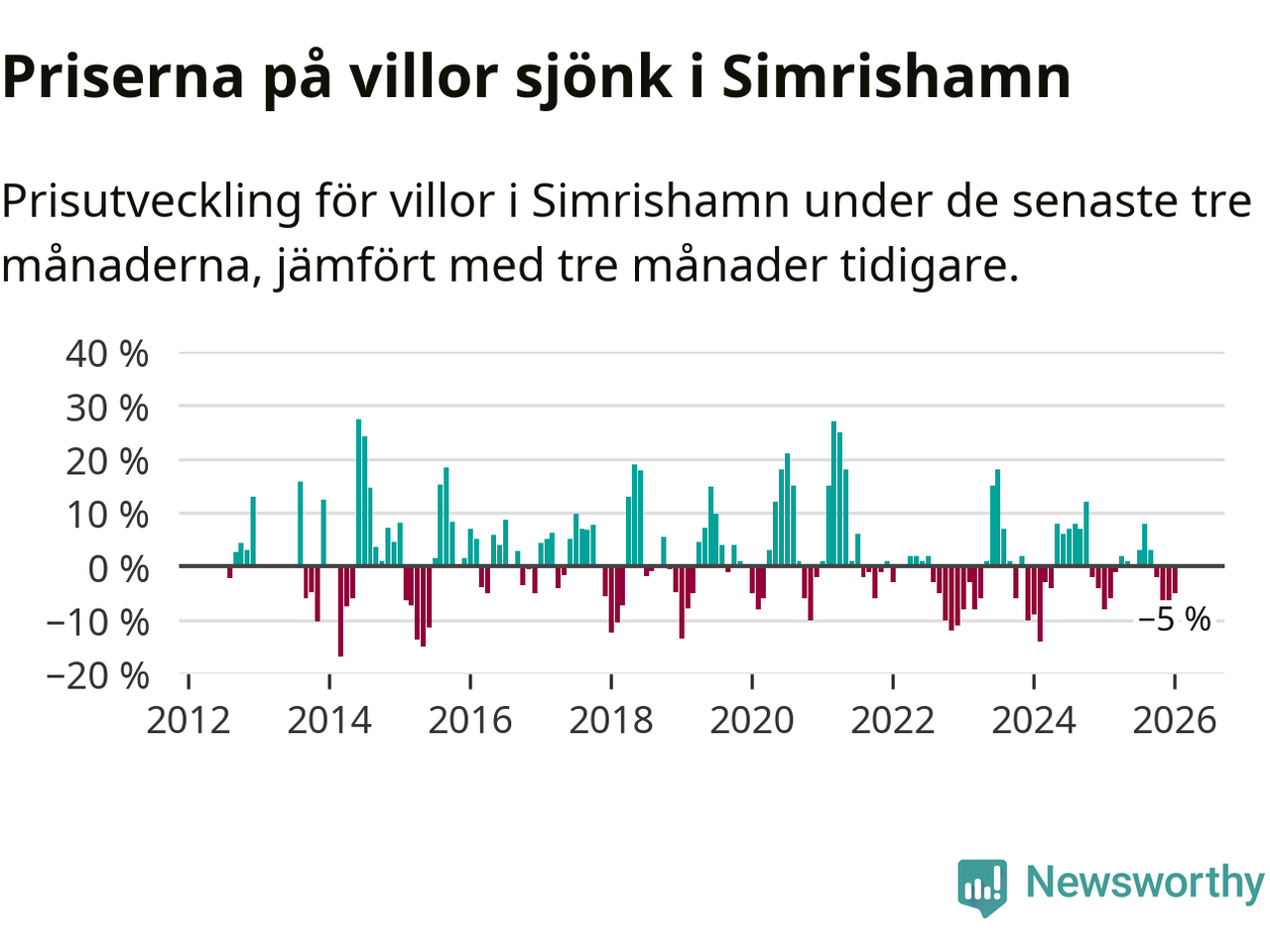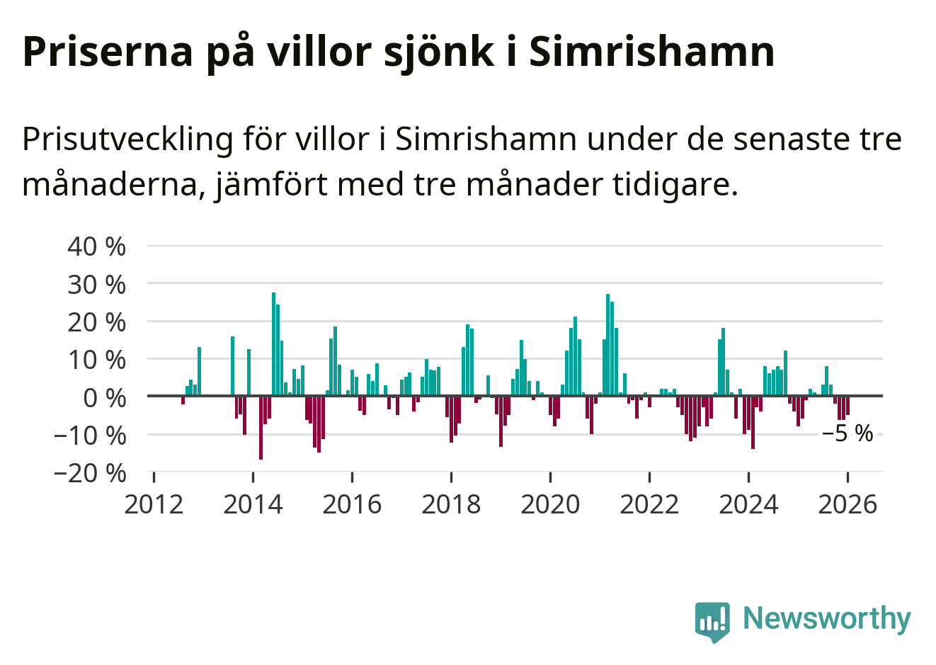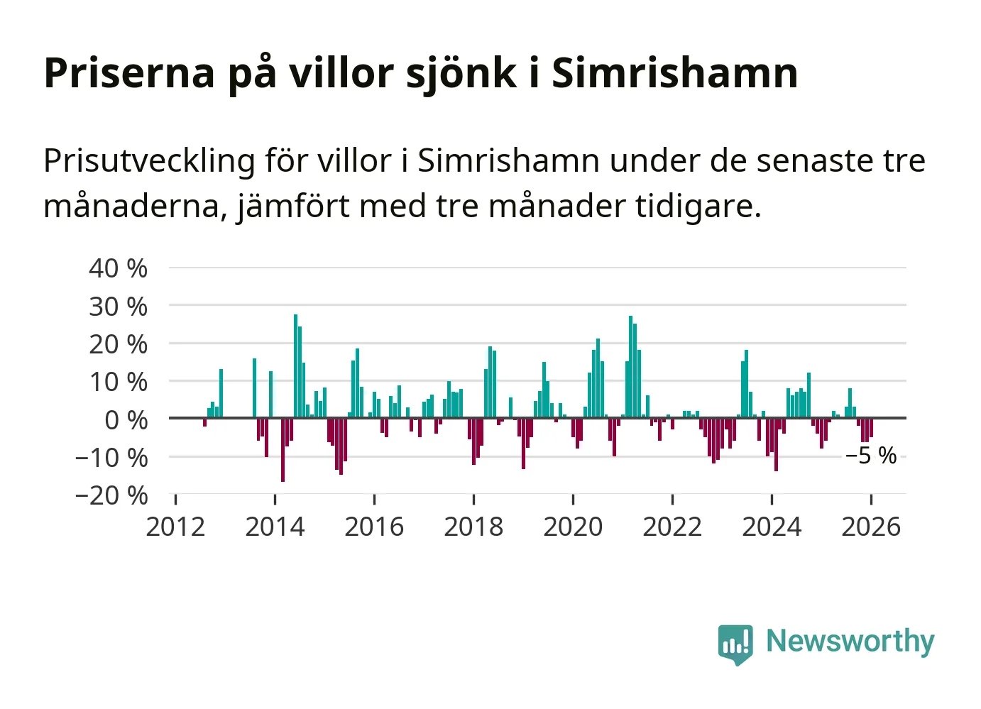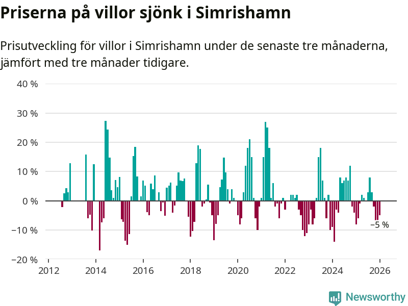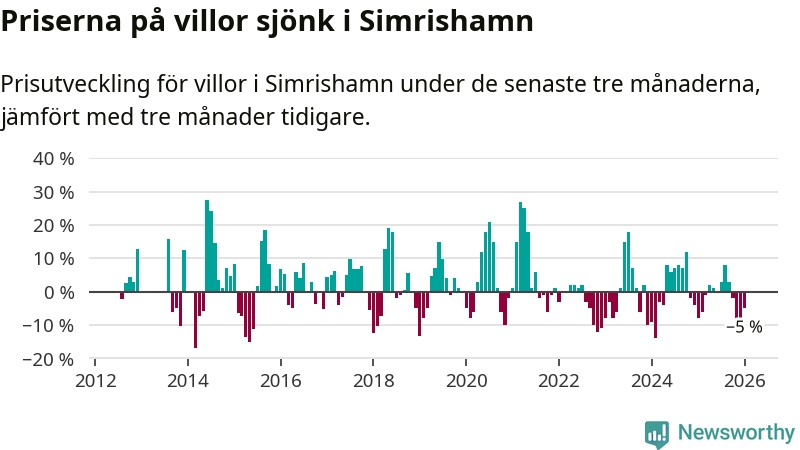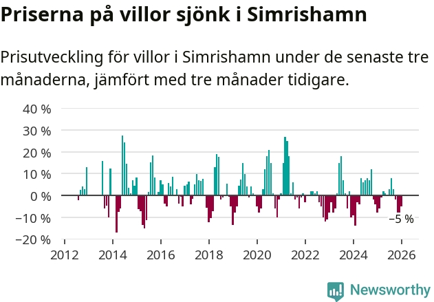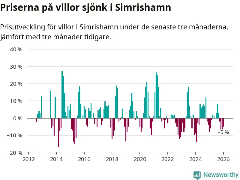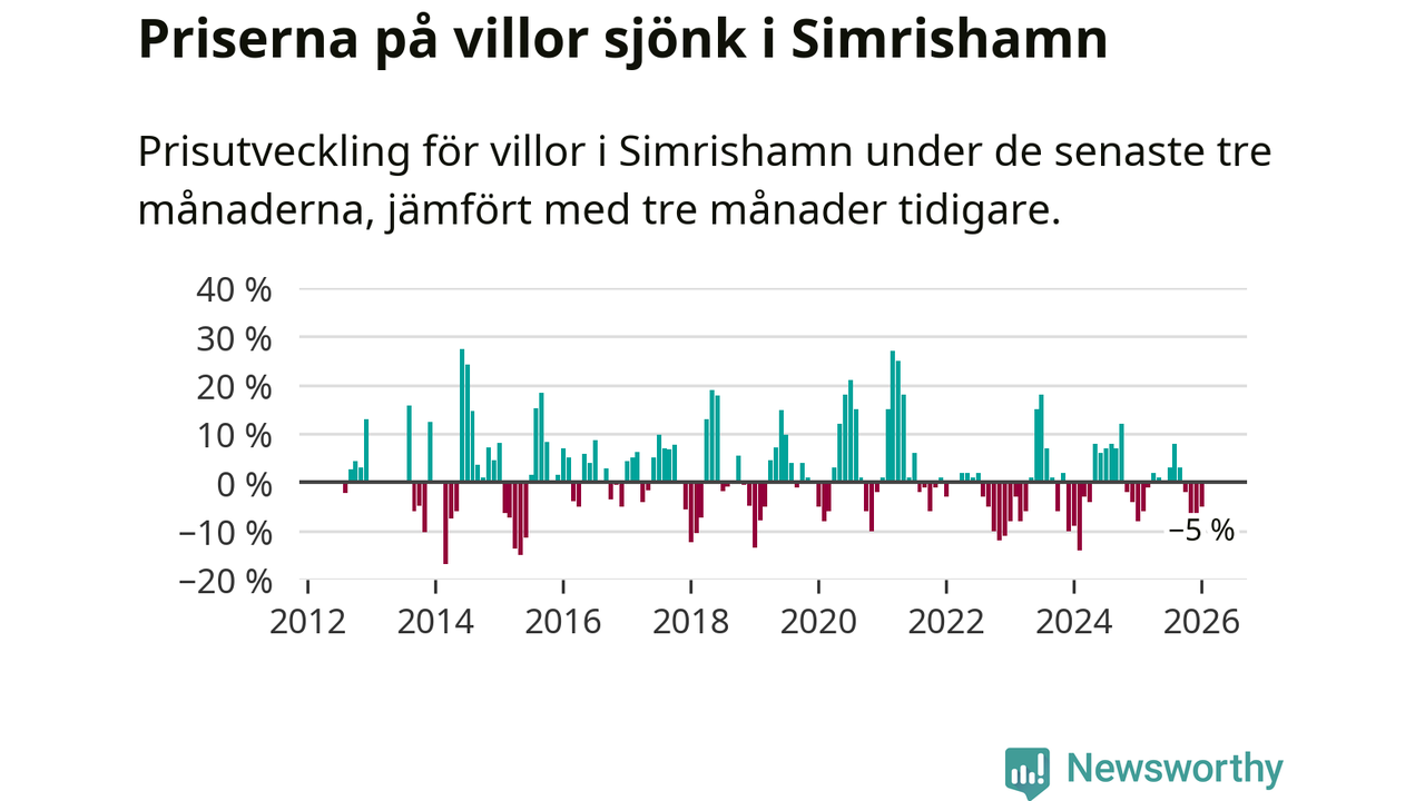 Villapriserna har gått ner i Simrishamns kommun. Medelpriset på försäljningarna under de senaste tre månaderna visar på en nedgång med 5 procent.