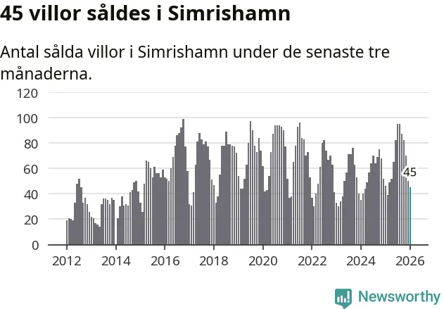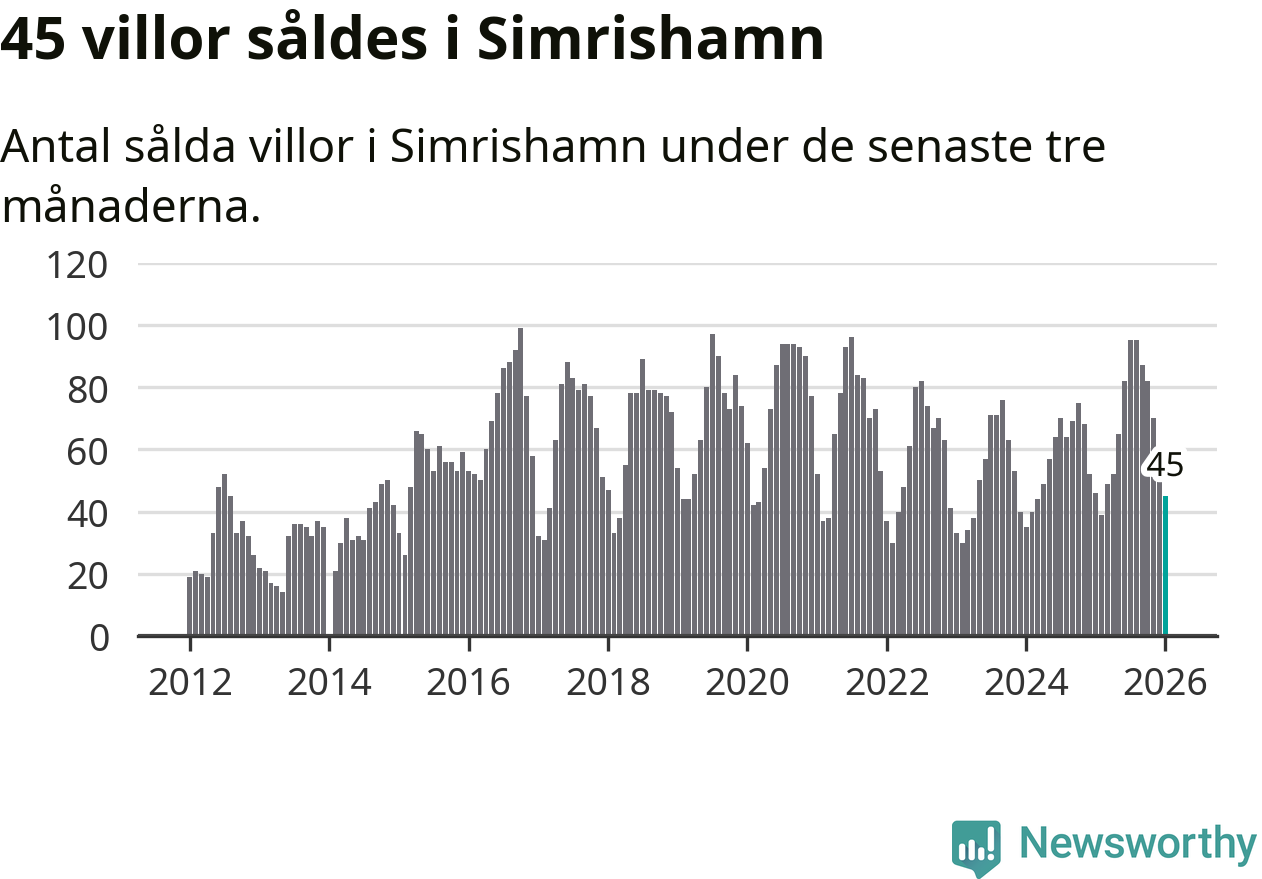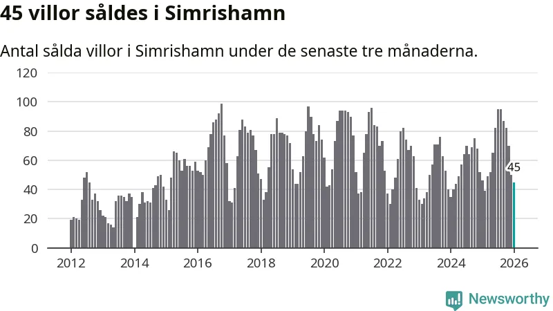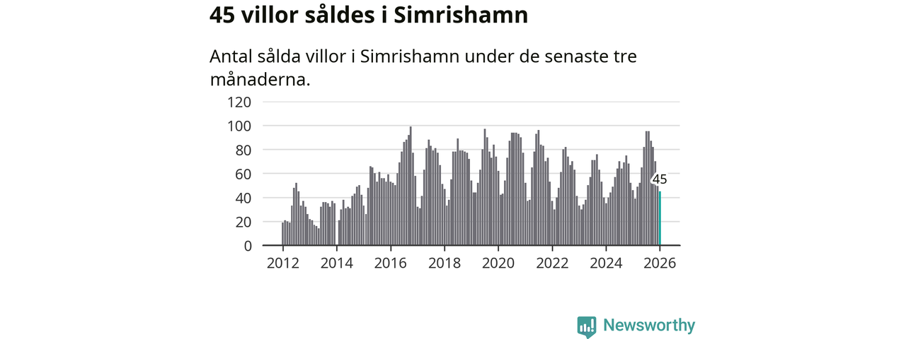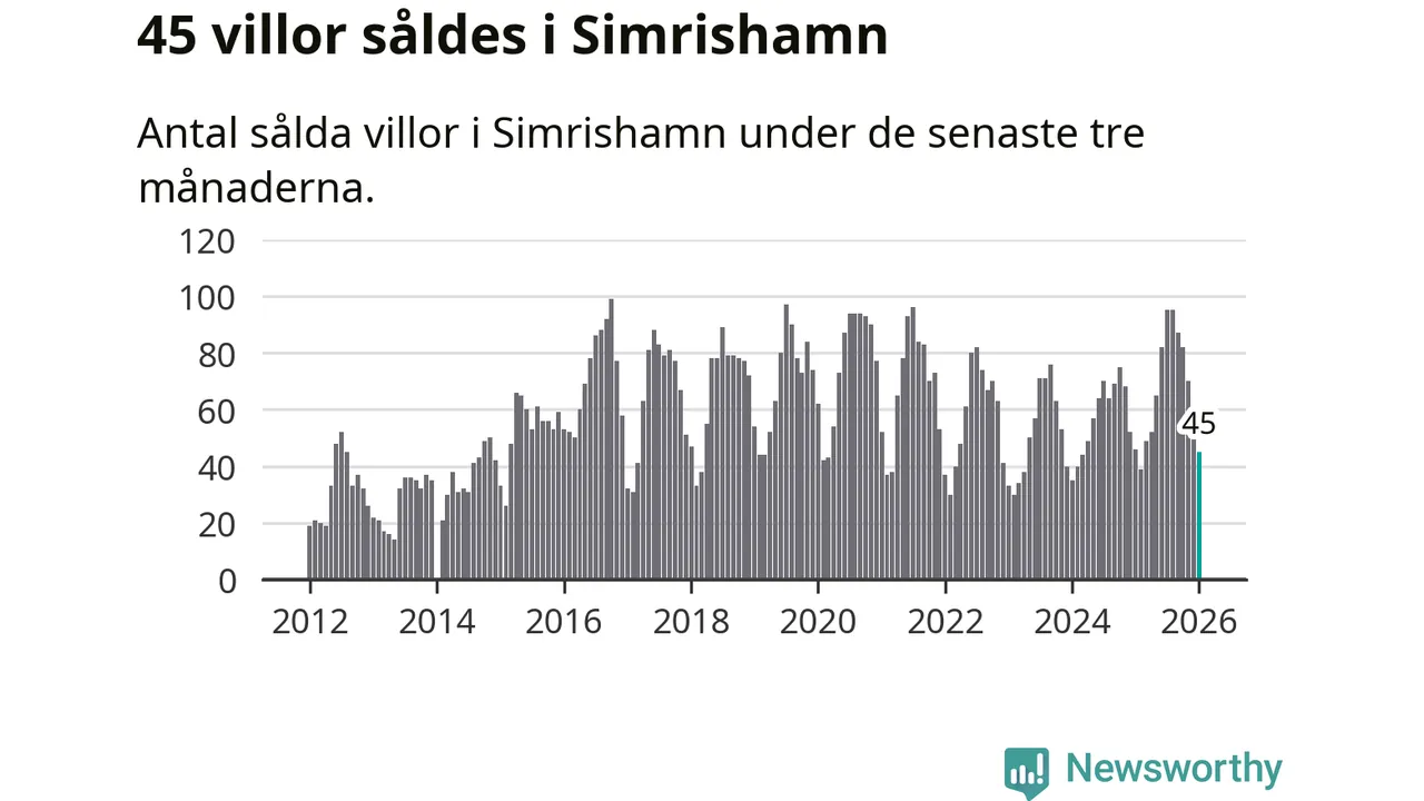 Sammanlagt såldes 45 villor i Simrishamns kommun mellan november och januari till ett genomsnittligt pris på 4,1 miljoner kronor. I fjol gjordes 46 affärer vid den här tiden på året.