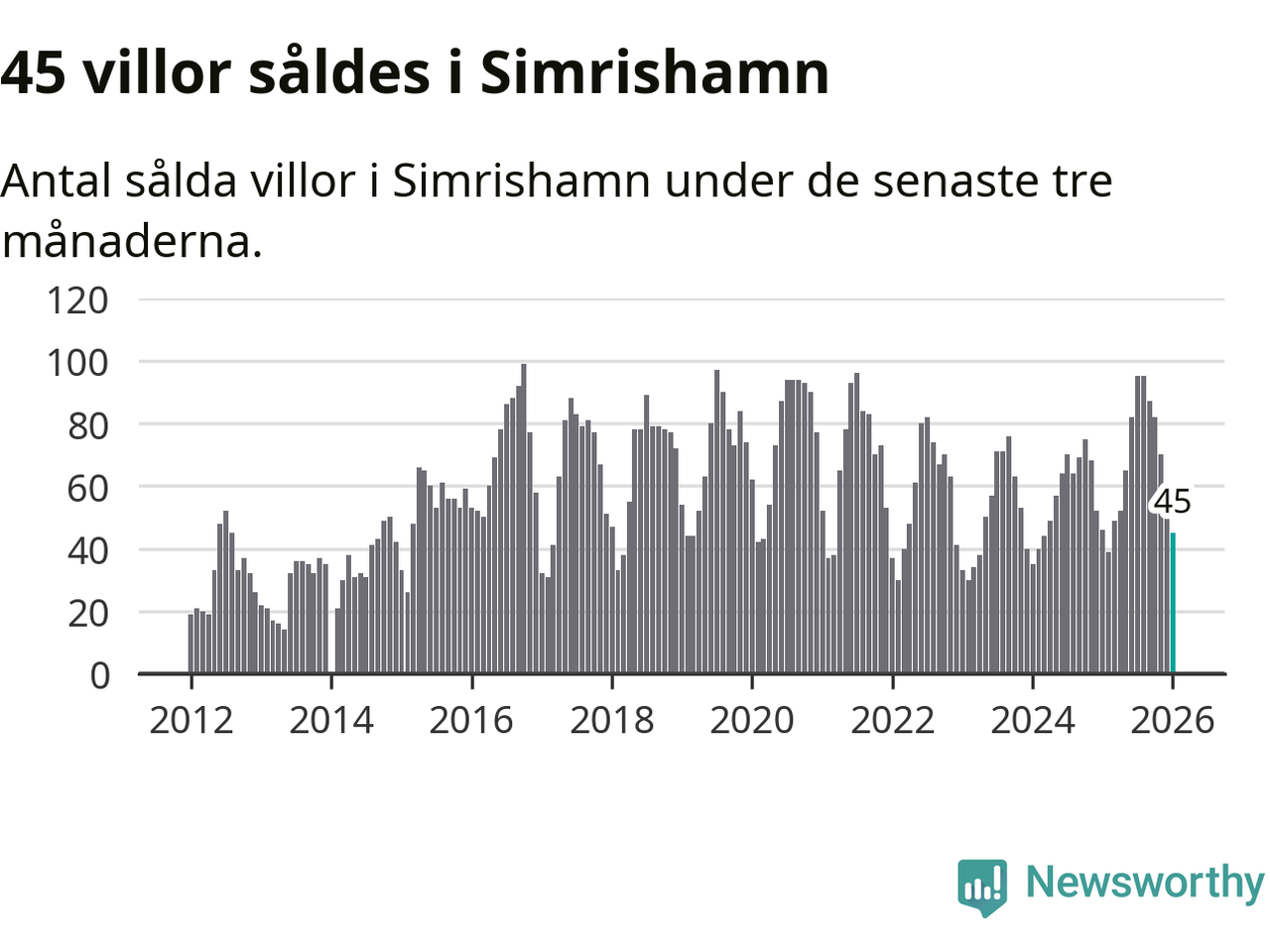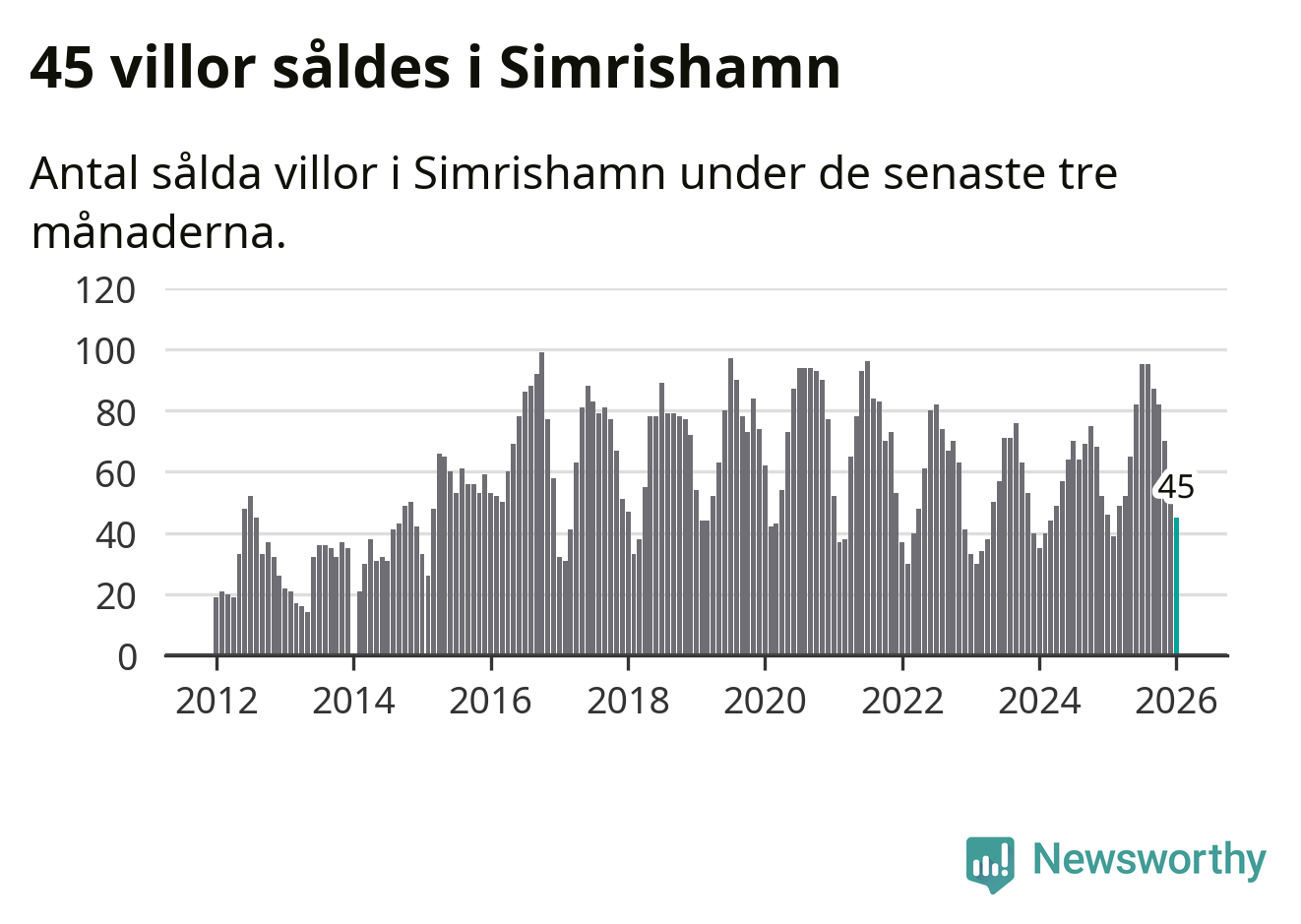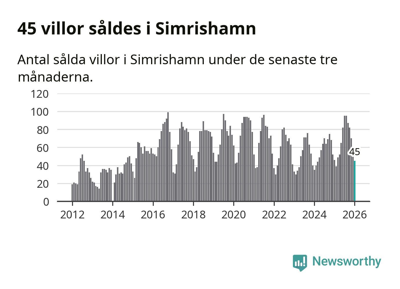 Sammanlagt såldes 45 villor i Simrishamns kommun mellan november och januari till ett genomsnittligt pris på 4,1 miljoner kronor. I fjol gjordes 46 affärer vid den här tiden på året.