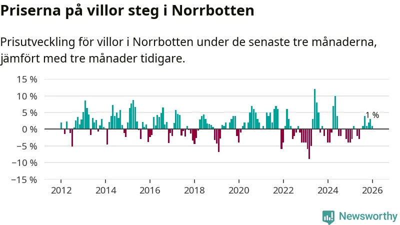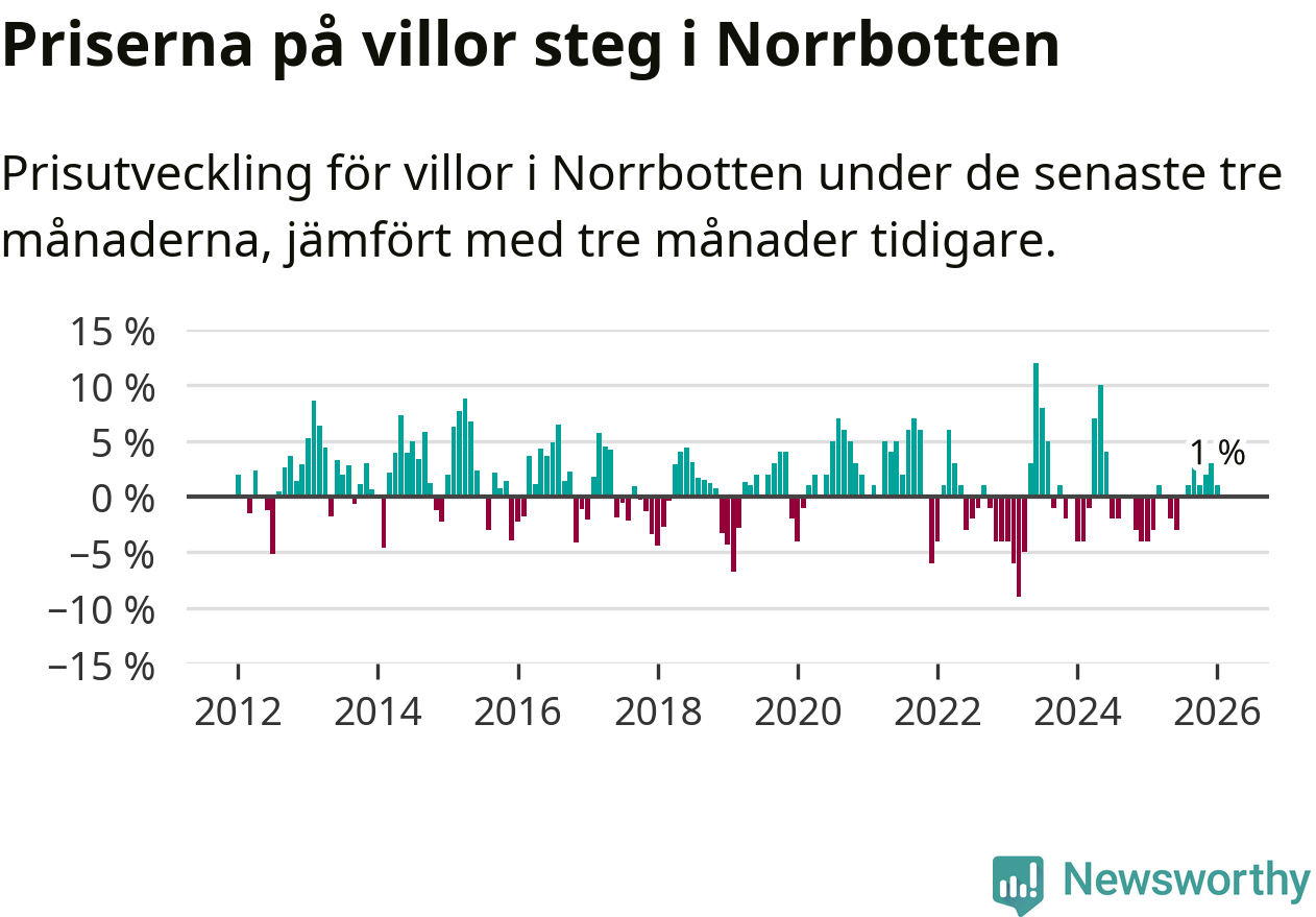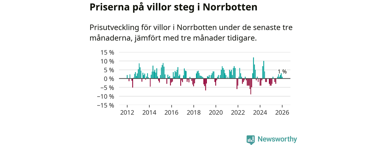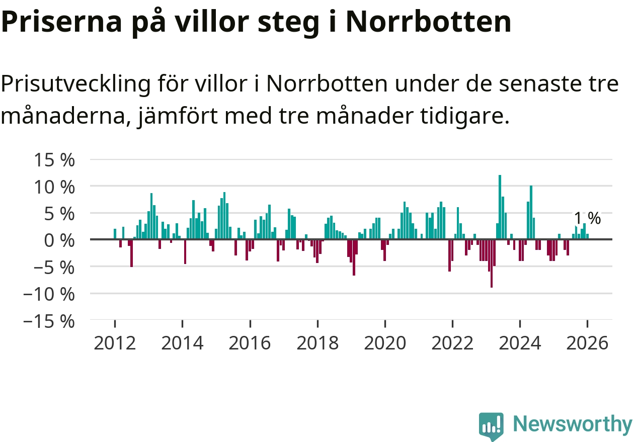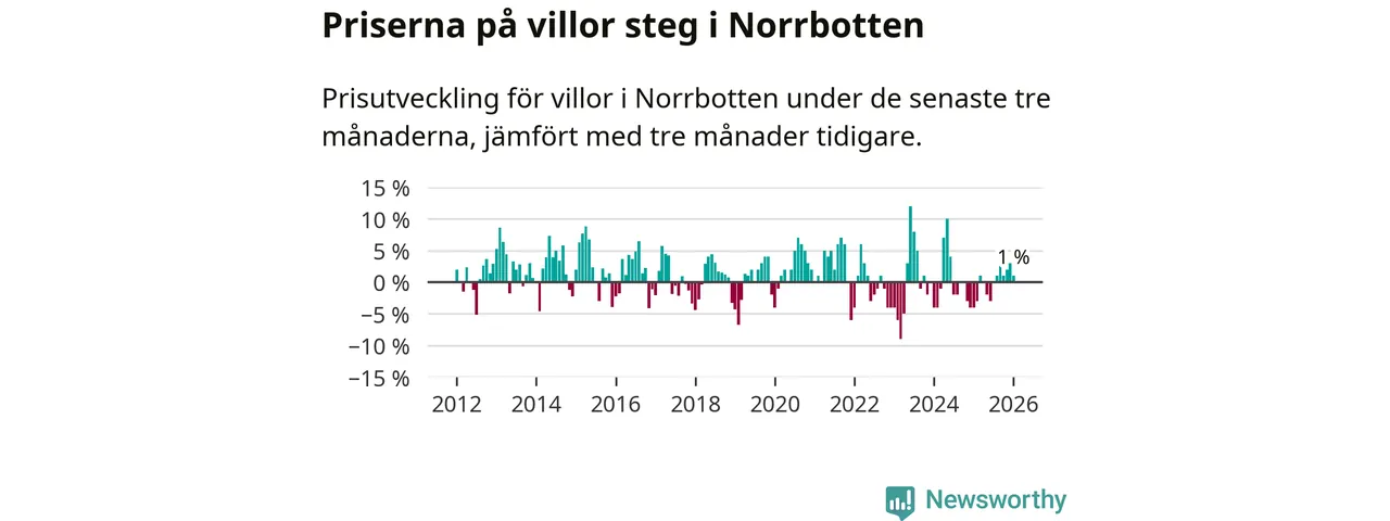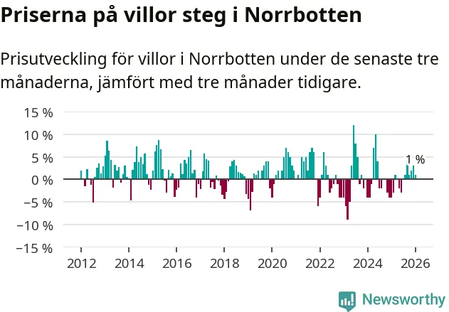 Villapriserna har gått upp i Norrbottens län. Medelpriset på försäljningarna under de senaste tre månaderna visar på en uppgång med 1 procent.