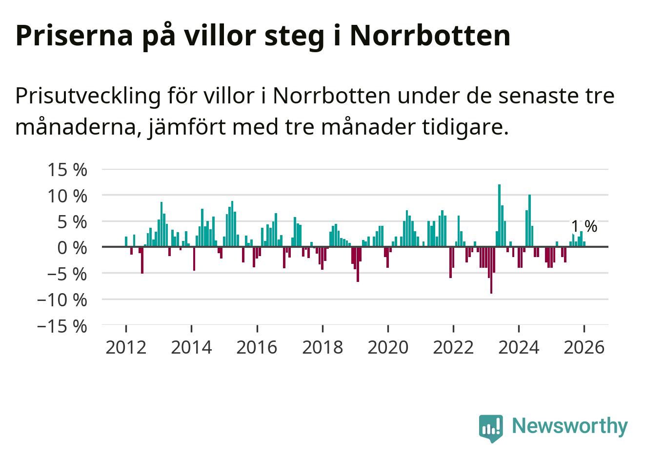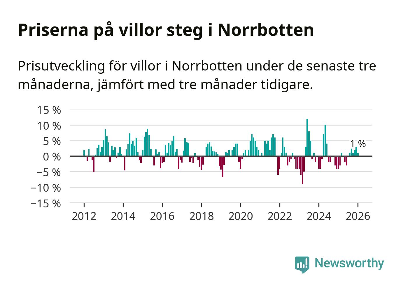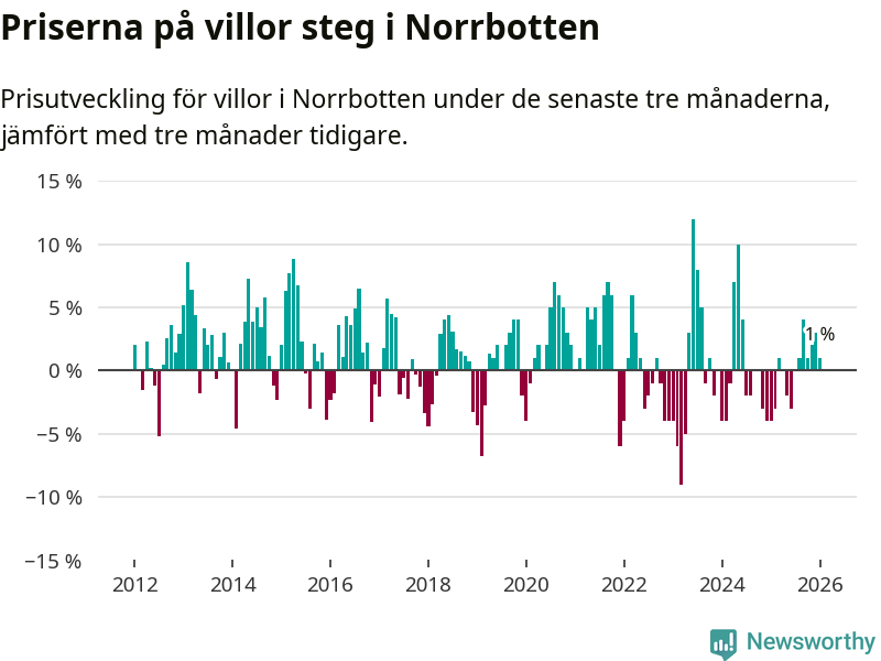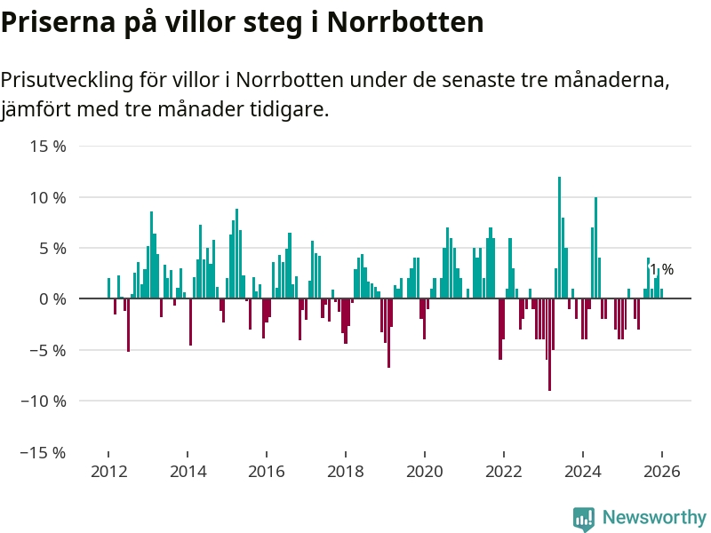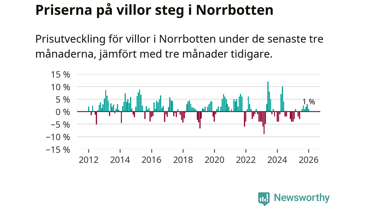 Villapriserna har gått upp i Norrbottens län. Medelpriset på försäljningarna under de senaste tre månaderna visar på en uppgång med 1 procent.