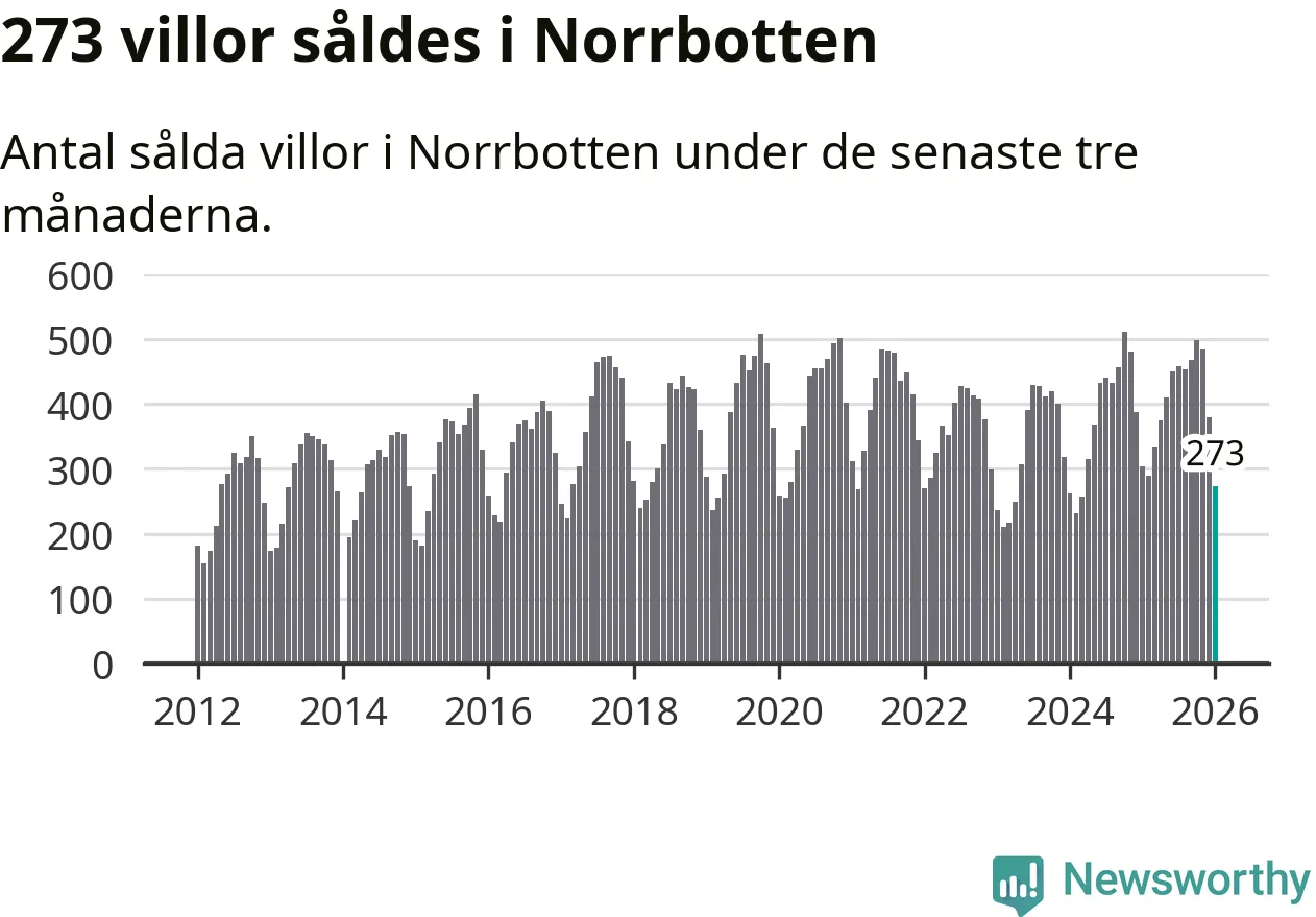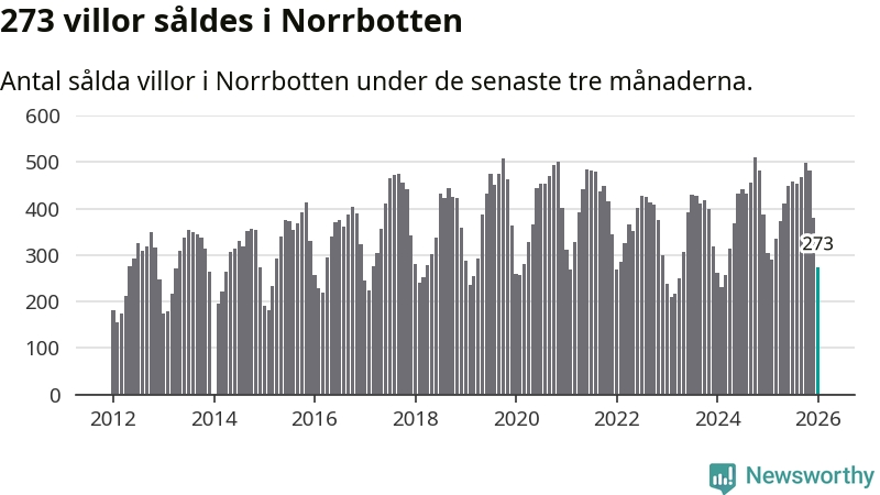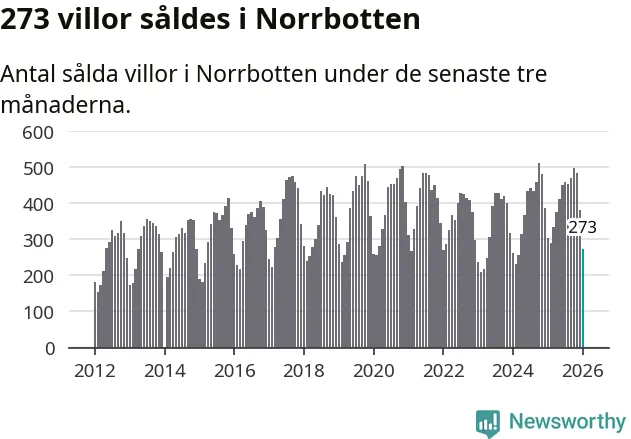 Sammanlagt såldes 273 villor i Norrbottens län mellan november och januari till ett genomsnittligt pris på 2,4 miljoner kronor. I fjol gjordes 304 affärer vid den här tiden på året.