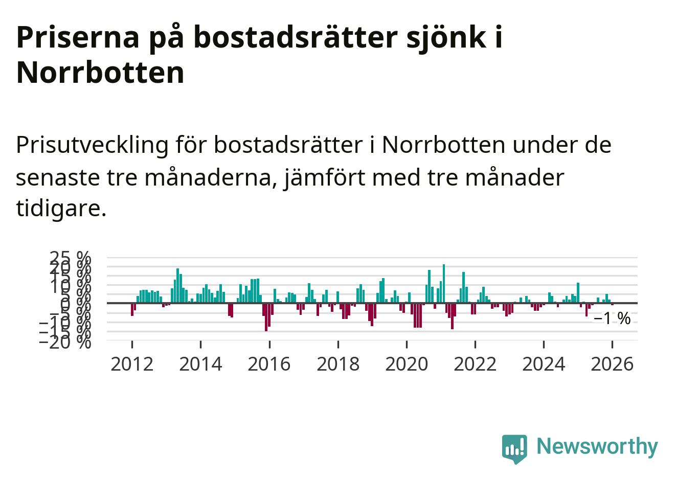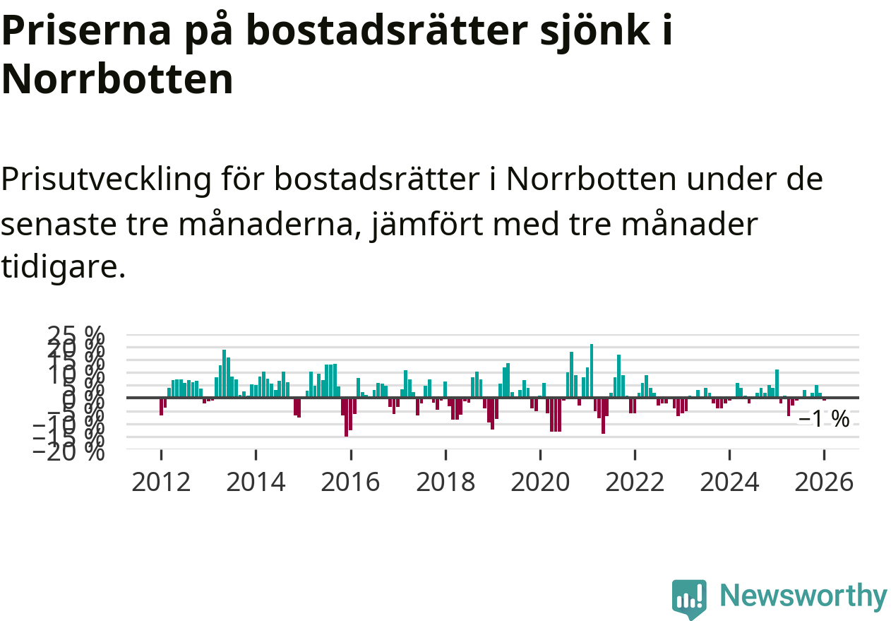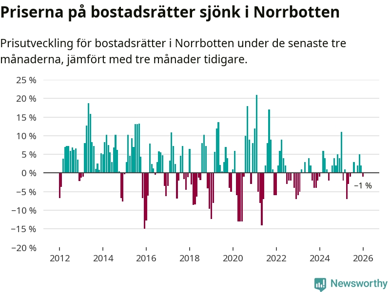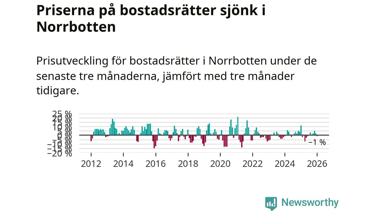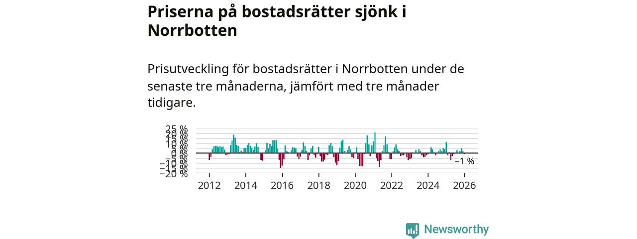 Priserna på bostadsrätter har gått ner i Norrbottens län. Medelpriset på försäljningarna under de senaste tre månaderna visar på en nedgång med 1 procent.