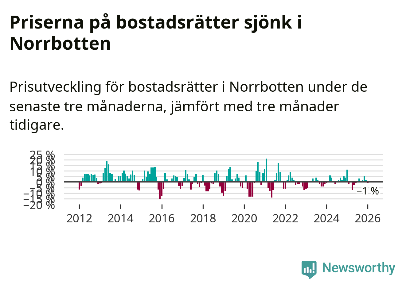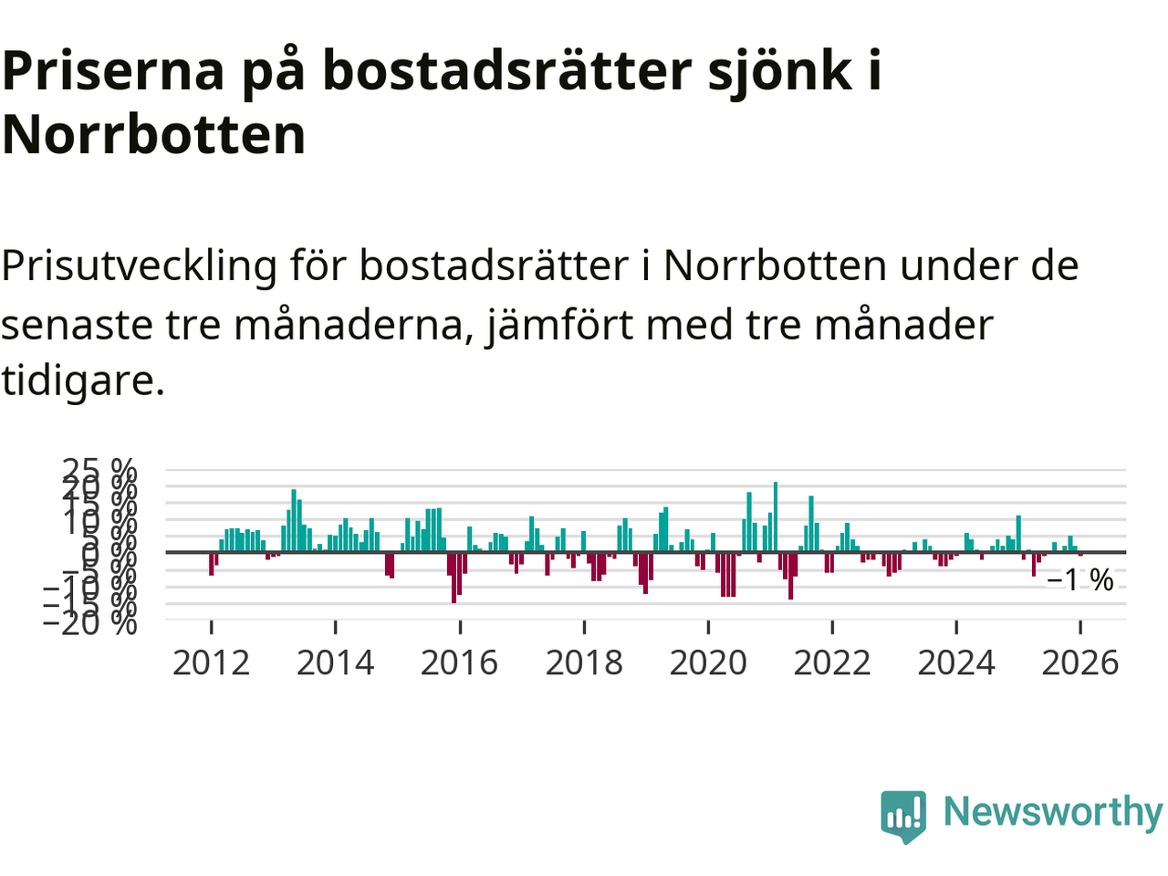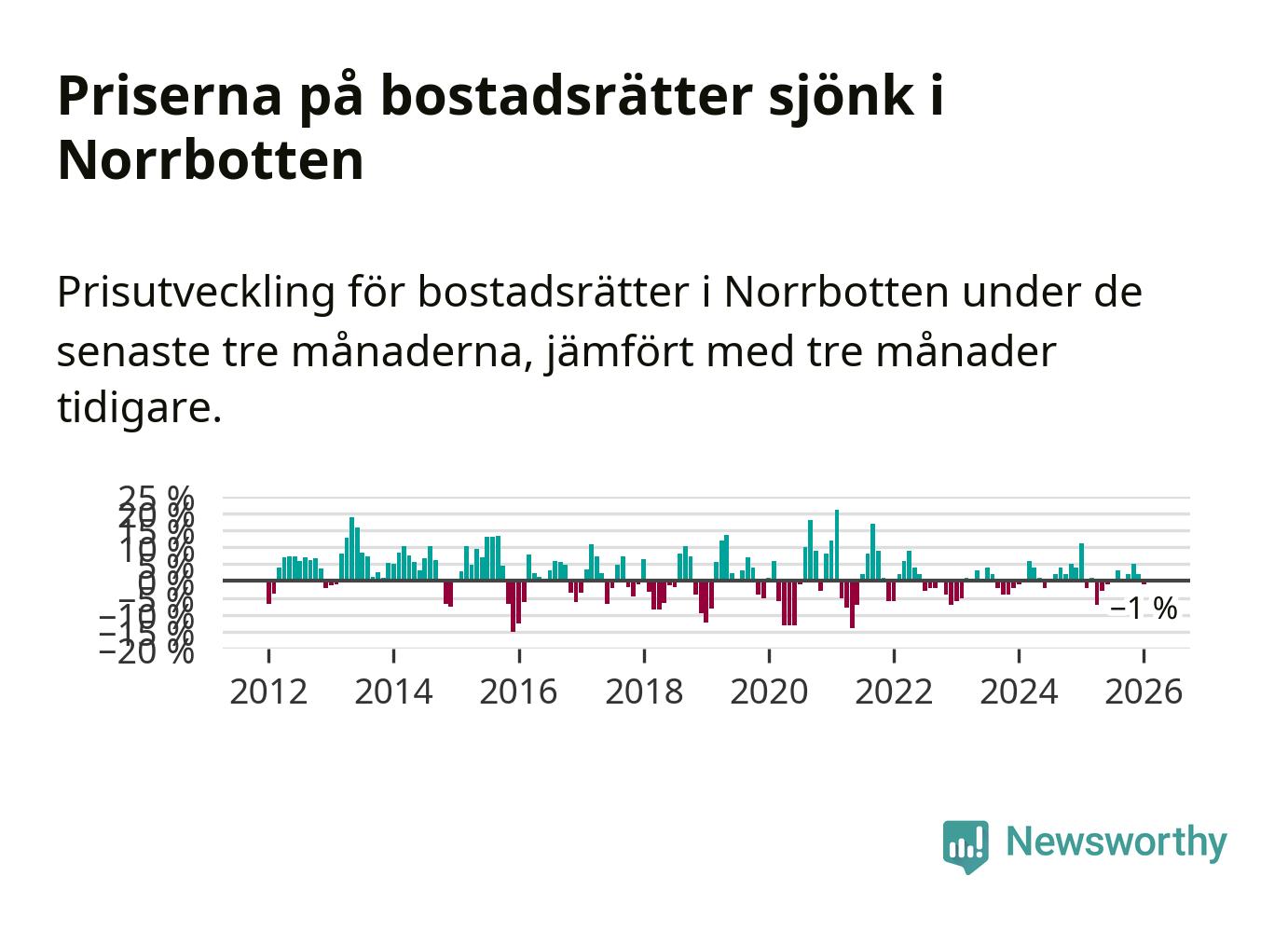 Priserna på bostadsrätter har gått ner i Norrbottens län. Medelpriset på försäljningarna under de senaste tre månaderna visar på en nedgång med 1 procent.