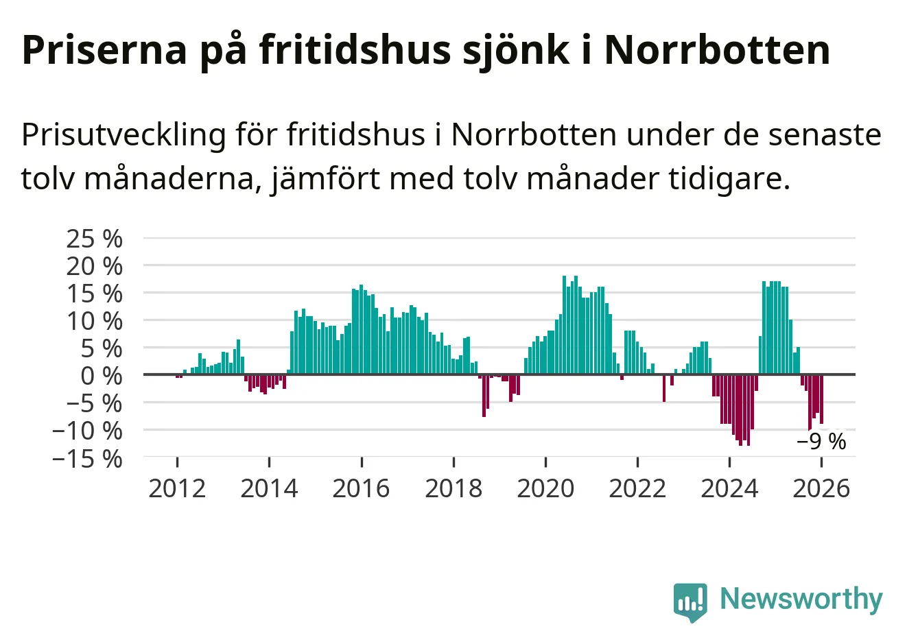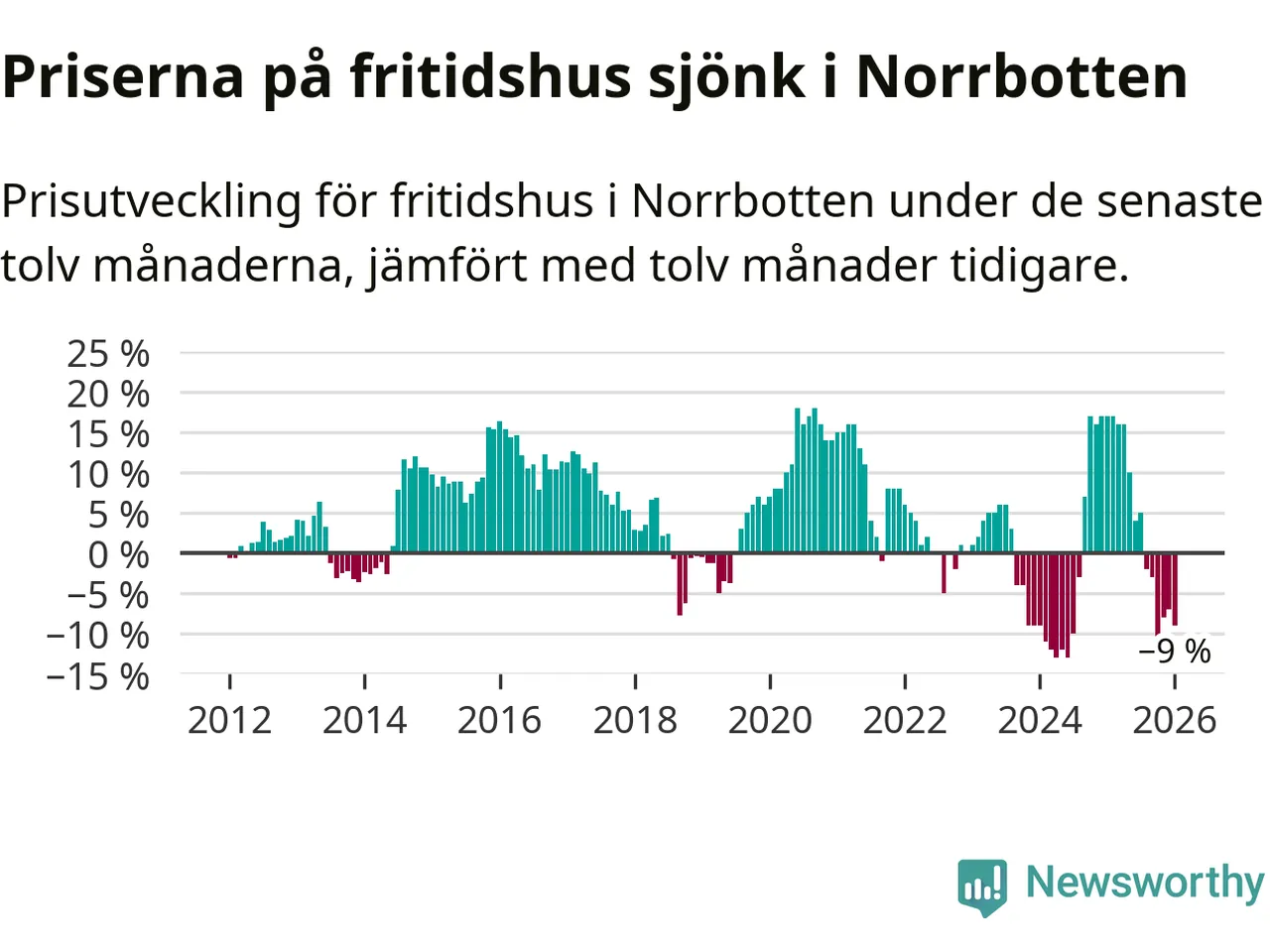 Priserna på fritidshus har gått ner i Norrbottens län. Medelpriset på försäljningarna under de senaste tolv månaderna visar på en nedgång med 9 procent.