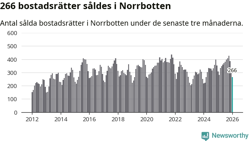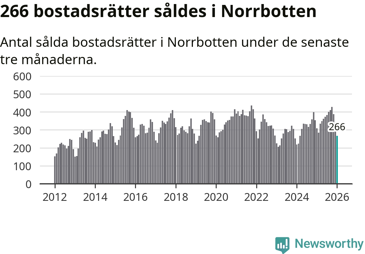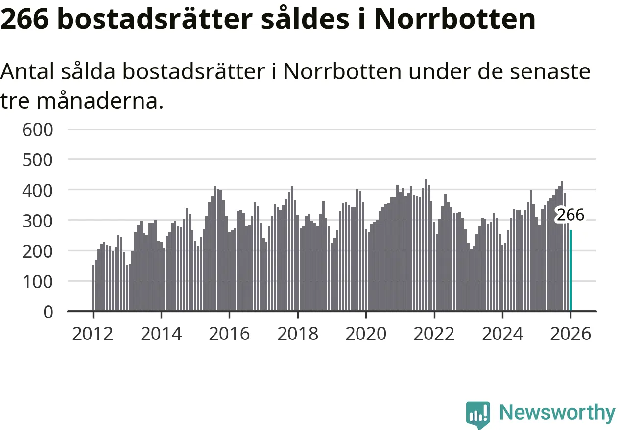 Sammanlagt såldes 266 bostadsrätter i Norrbottens län mellan november och januari till ett genomsnittligt pris på 1,5 miljoner kronor. I fjol gjordes 309 affärer vid den här tiden på året.