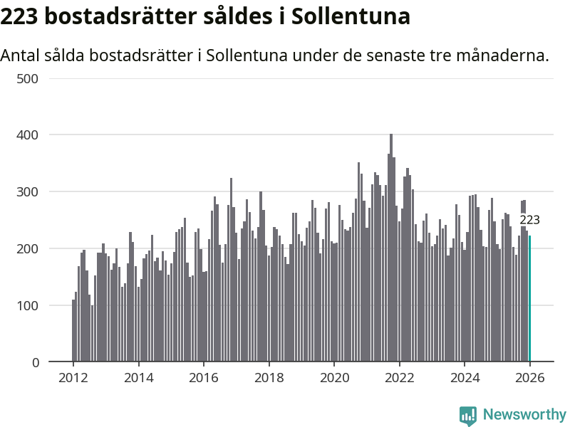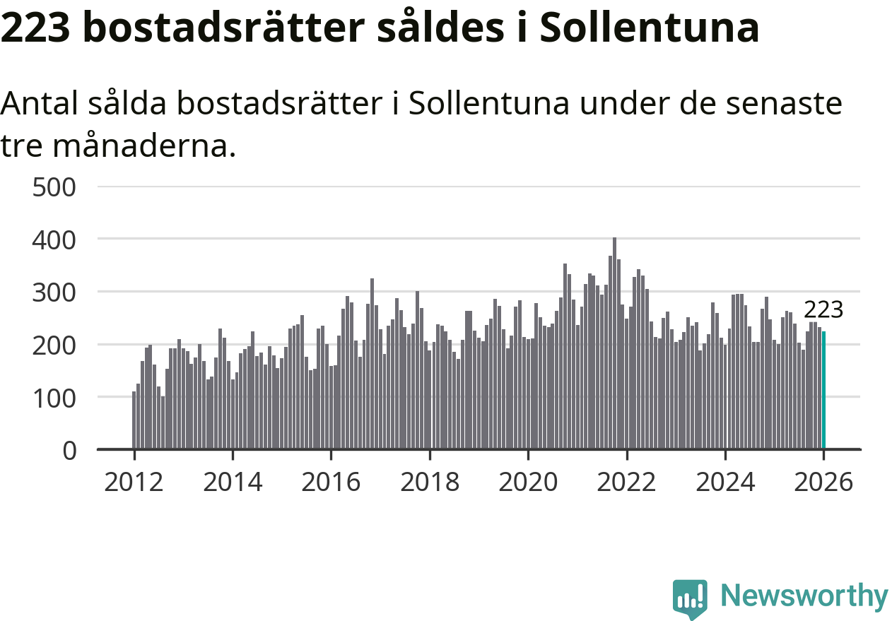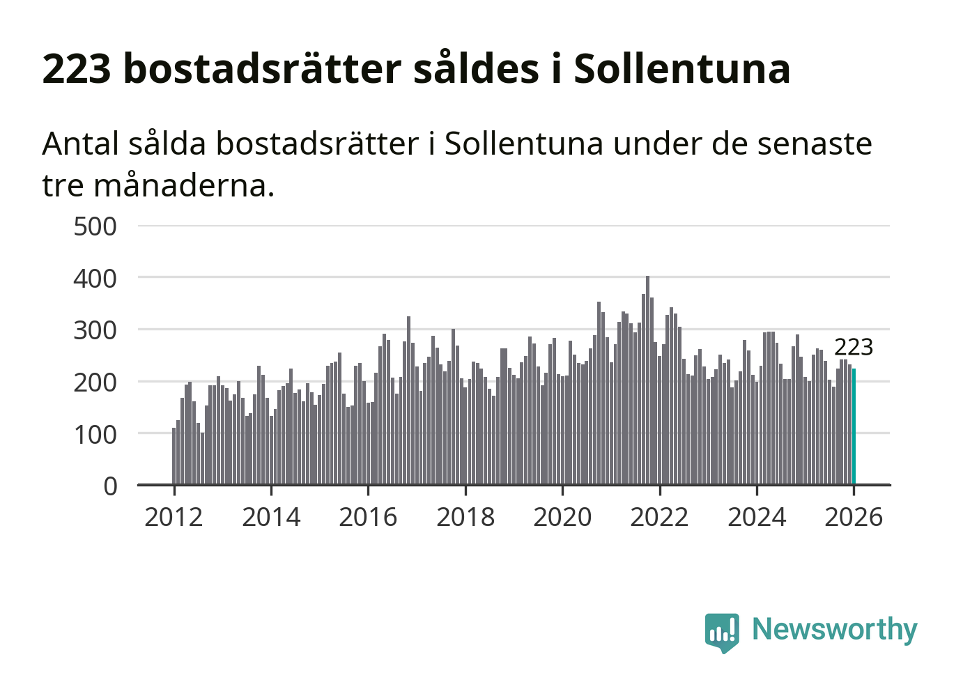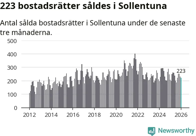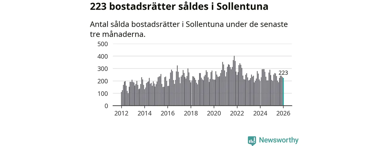 Sammanlagt såldes 223 bostadsrätter i Sollentuna kommun mellan november och januari till ett genomsnittligt pris på 3,0 miljoner kronor. I fjol gjordes 208 affärer vid den här tiden på året.