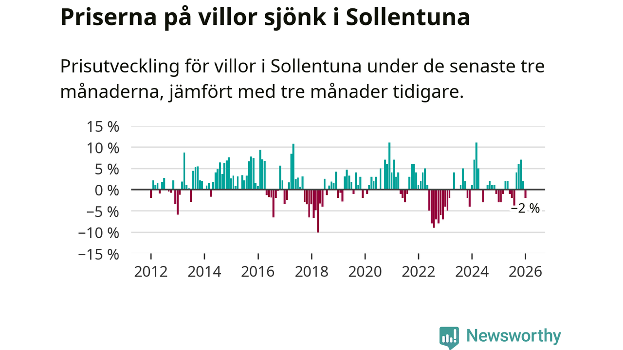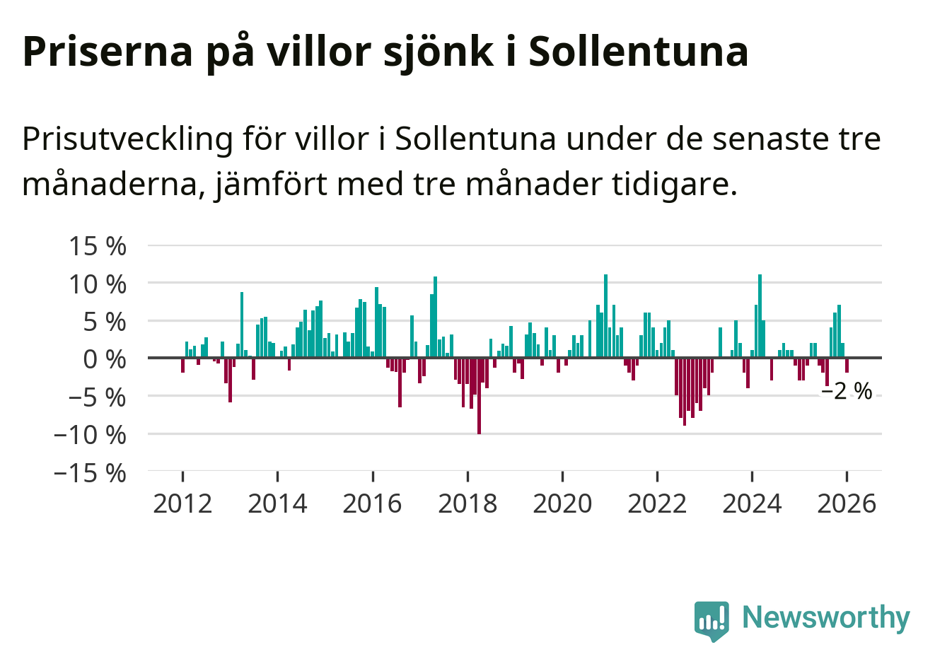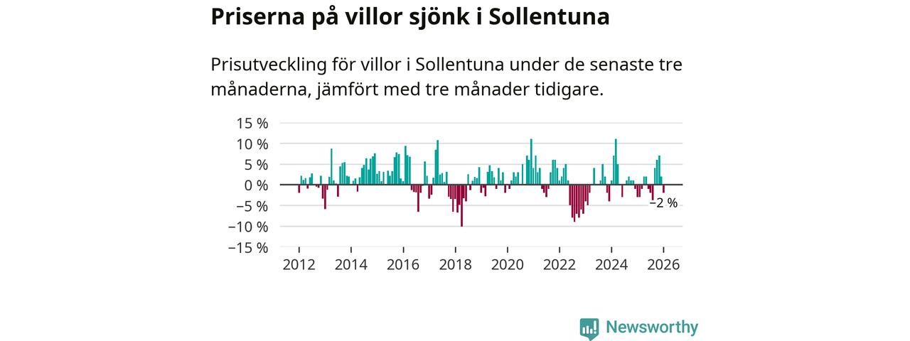 Villapriserna har gått ner i Sollentuna kommun. Medelpriset på försäljningarna under de senaste tre månaderna visar på en nedgång med 2 procent.