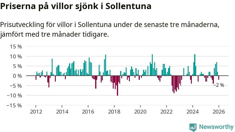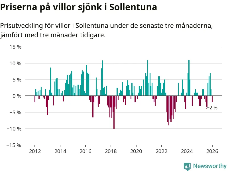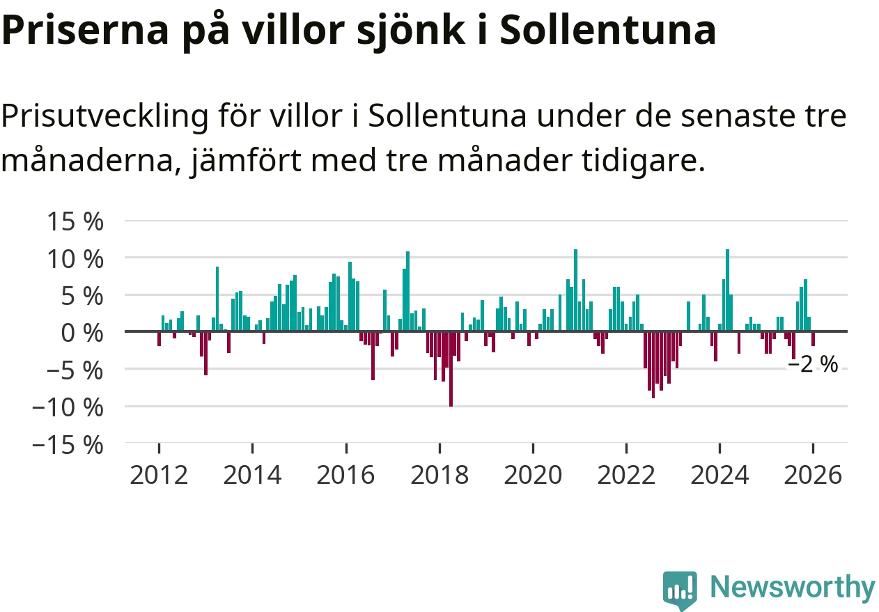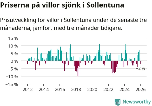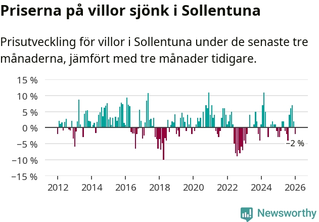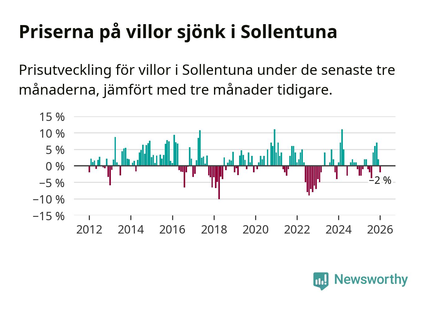 Villapriserna har gått ner i Sollentuna kommun. Medelpriset på försäljningarna under de senaste tre månaderna visar på en nedgång med 2 procent.