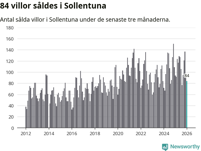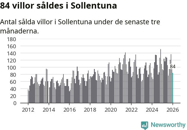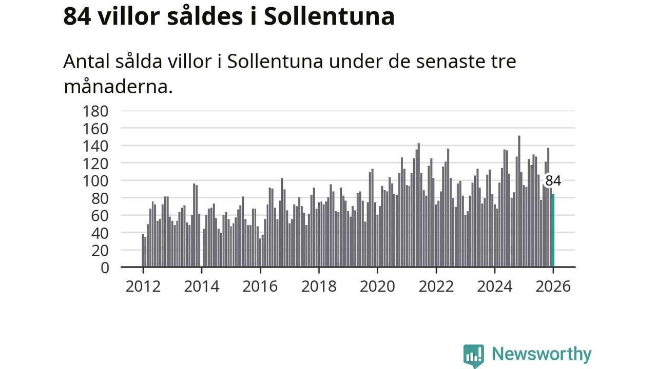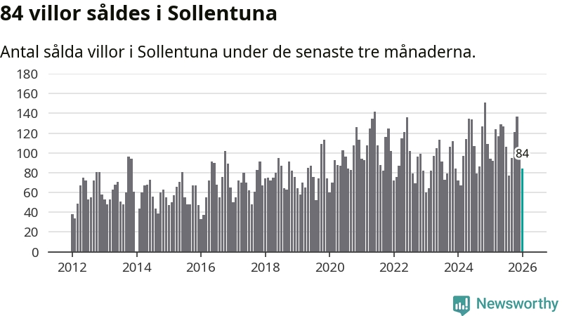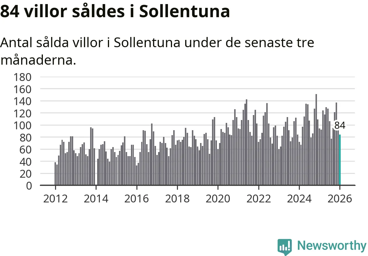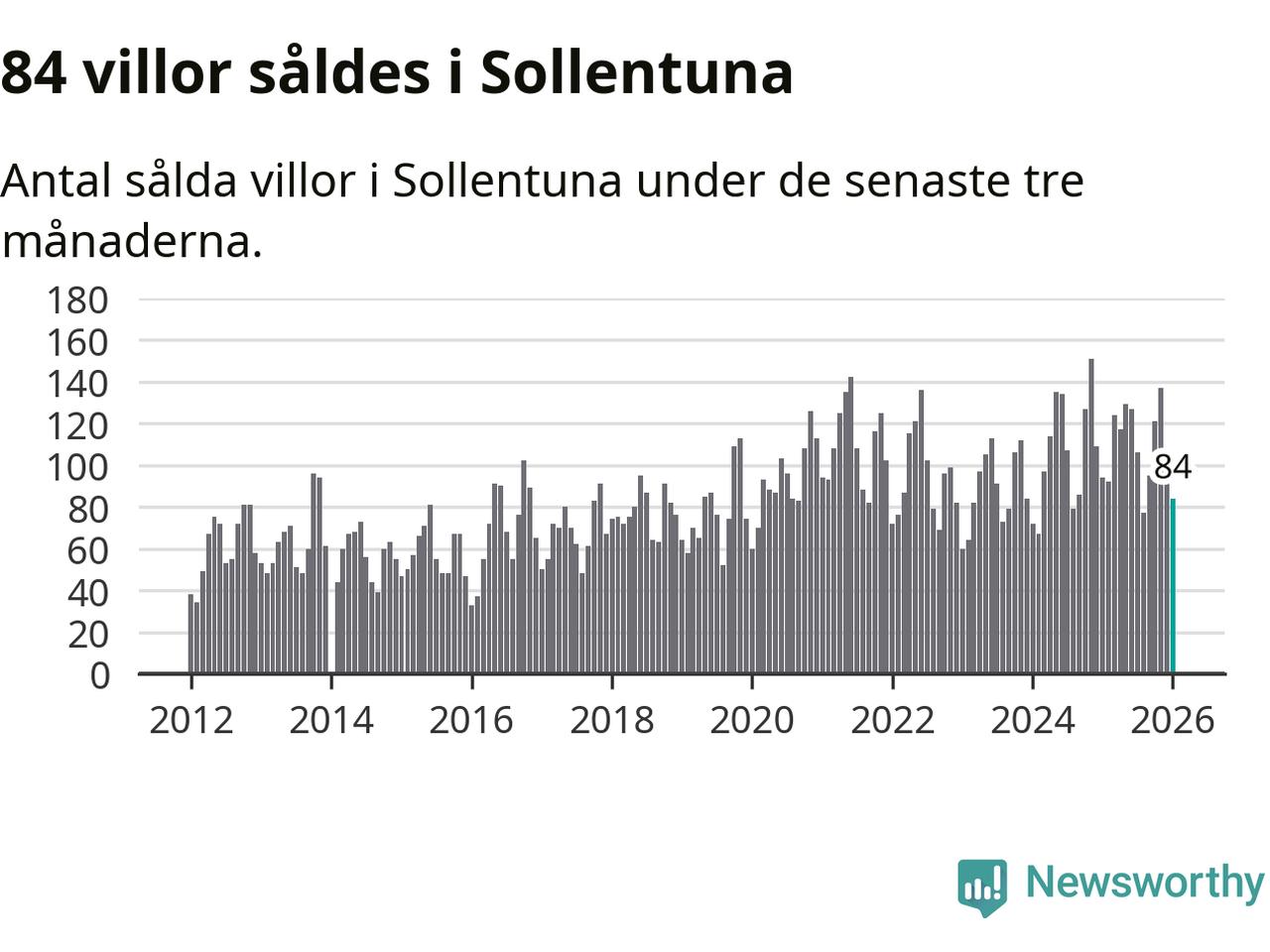 Sammanlagt såldes 84 villor i Sollentuna kommun mellan november och januari till ett genomsnittligt pris på 8,0 miljoner kronor. I fjol gjordes 94 affärer vid den här tiden på året.