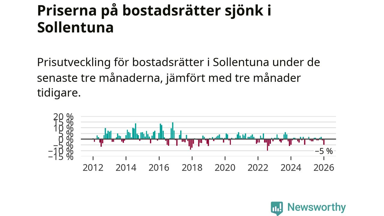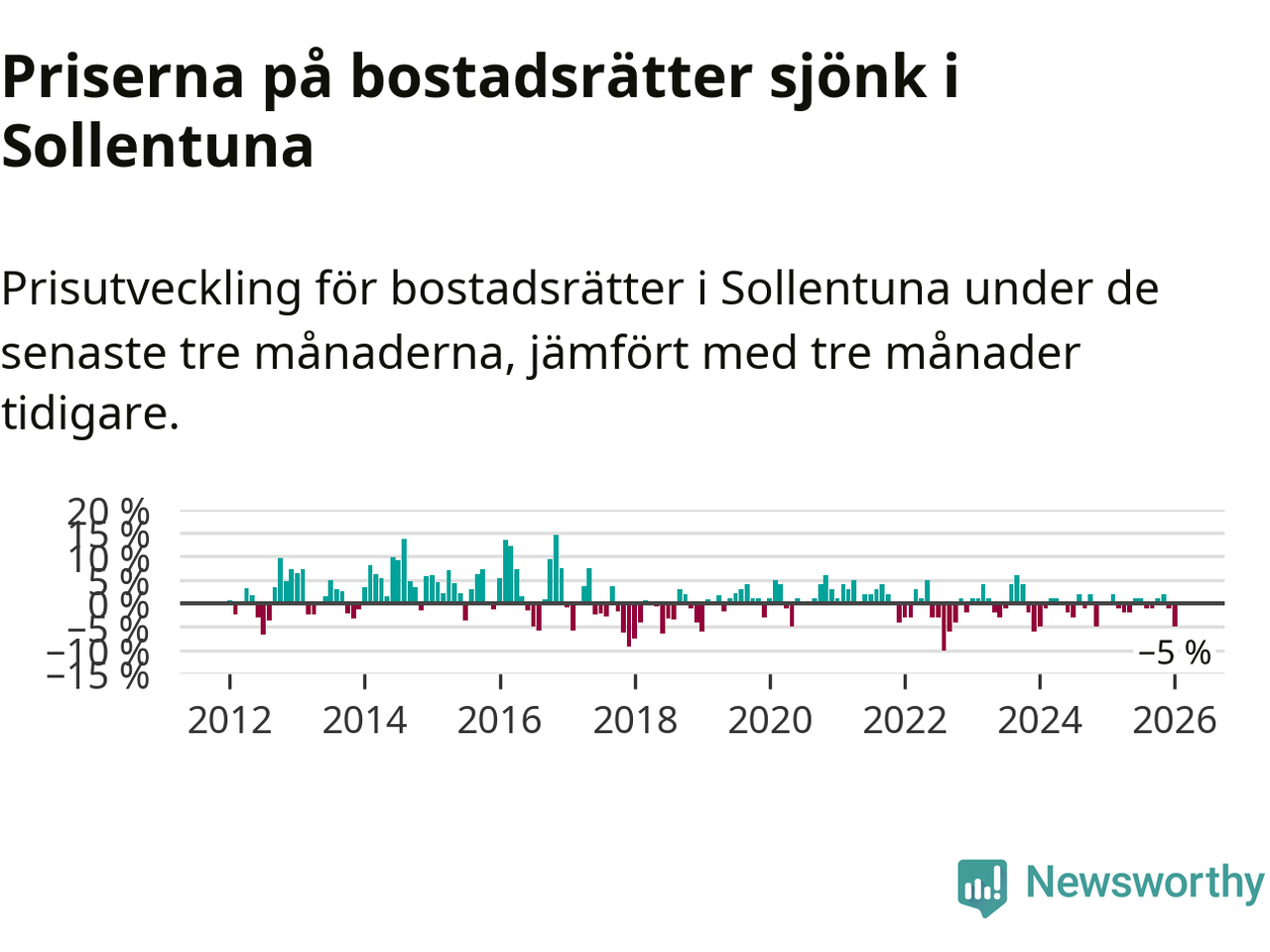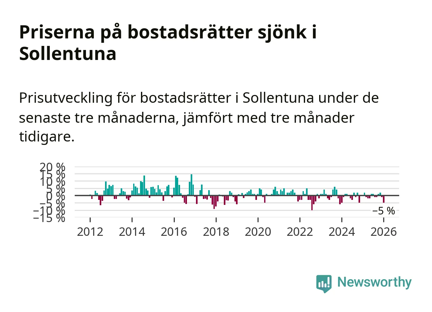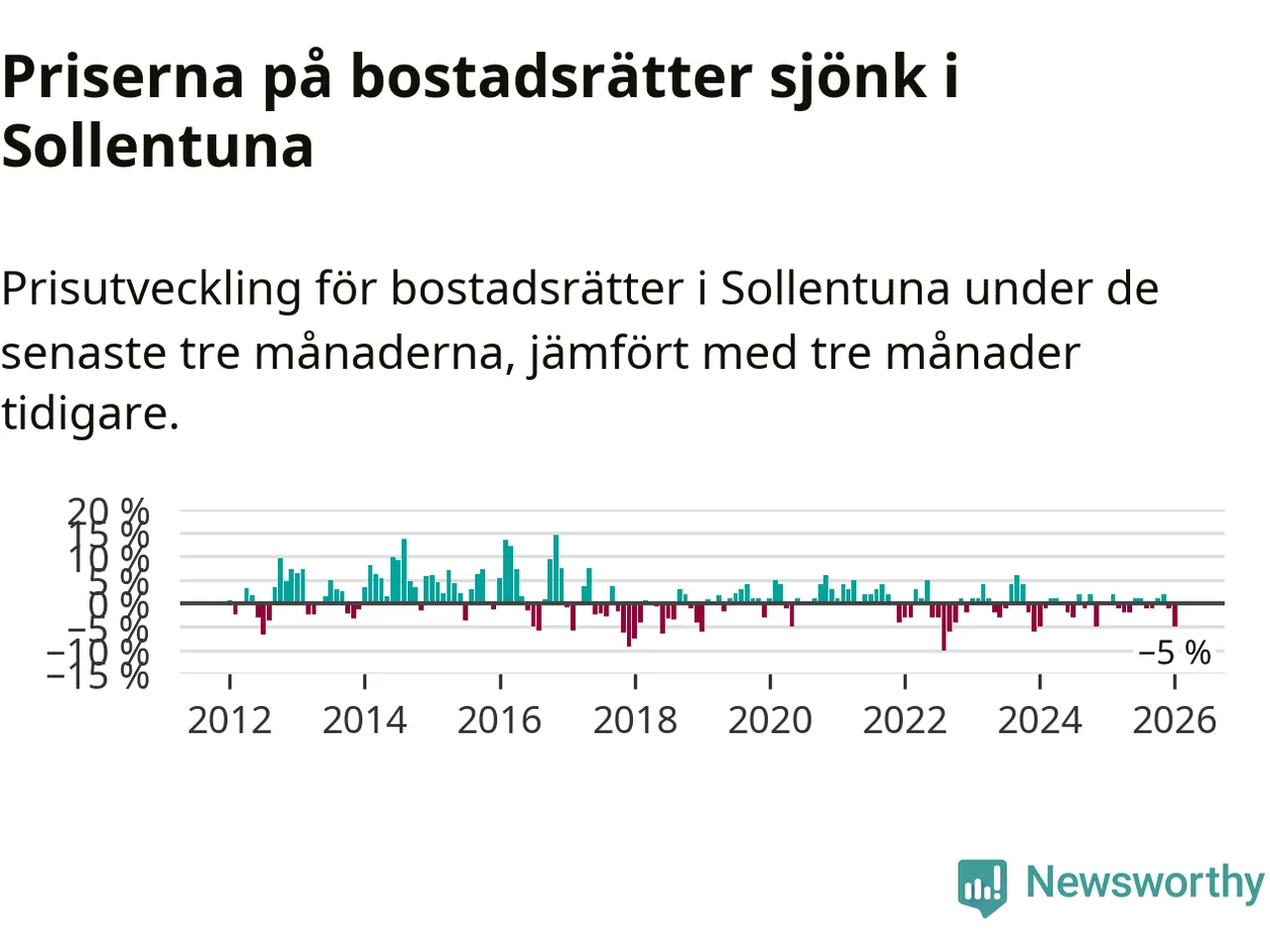 Priserna på bostadsrätter har gått ner i Sollentuna kommun. Medelpriset på försäljningarna under de senaste tre månaderna visar på en nedgång med 5 procent.