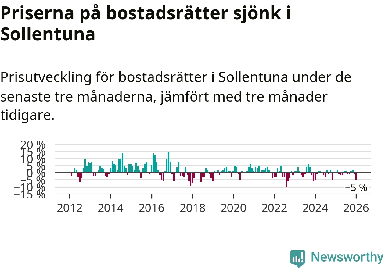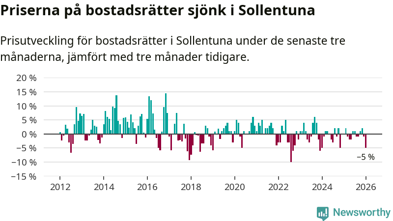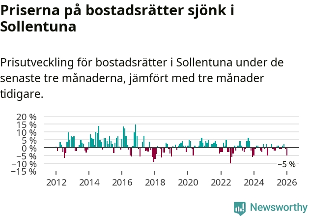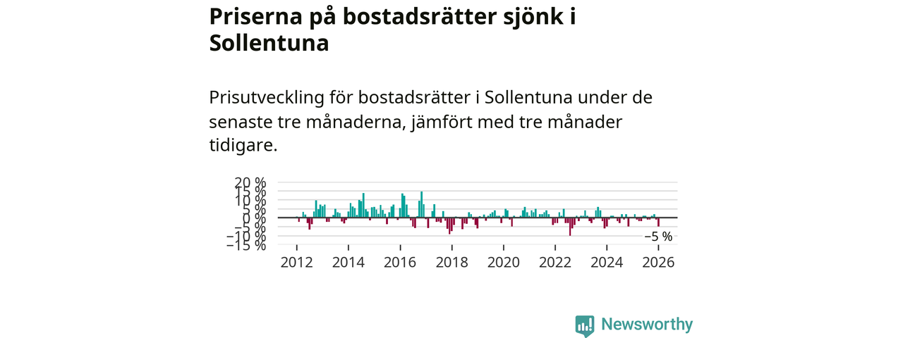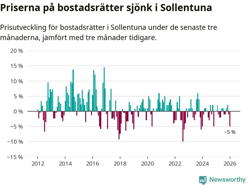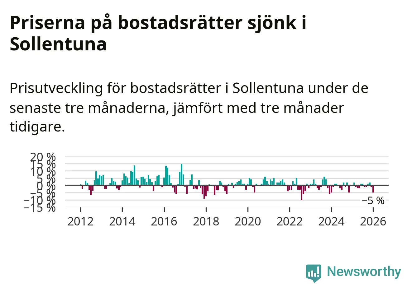 Priserna på bostadsrätter har gått ner i Sollentuna kommun. Medelpriset på försäljningarna under de senaste tre månaderna visar på en nedgång med 5 procent.