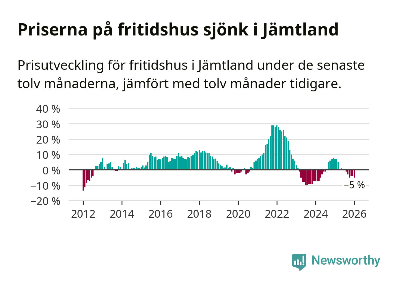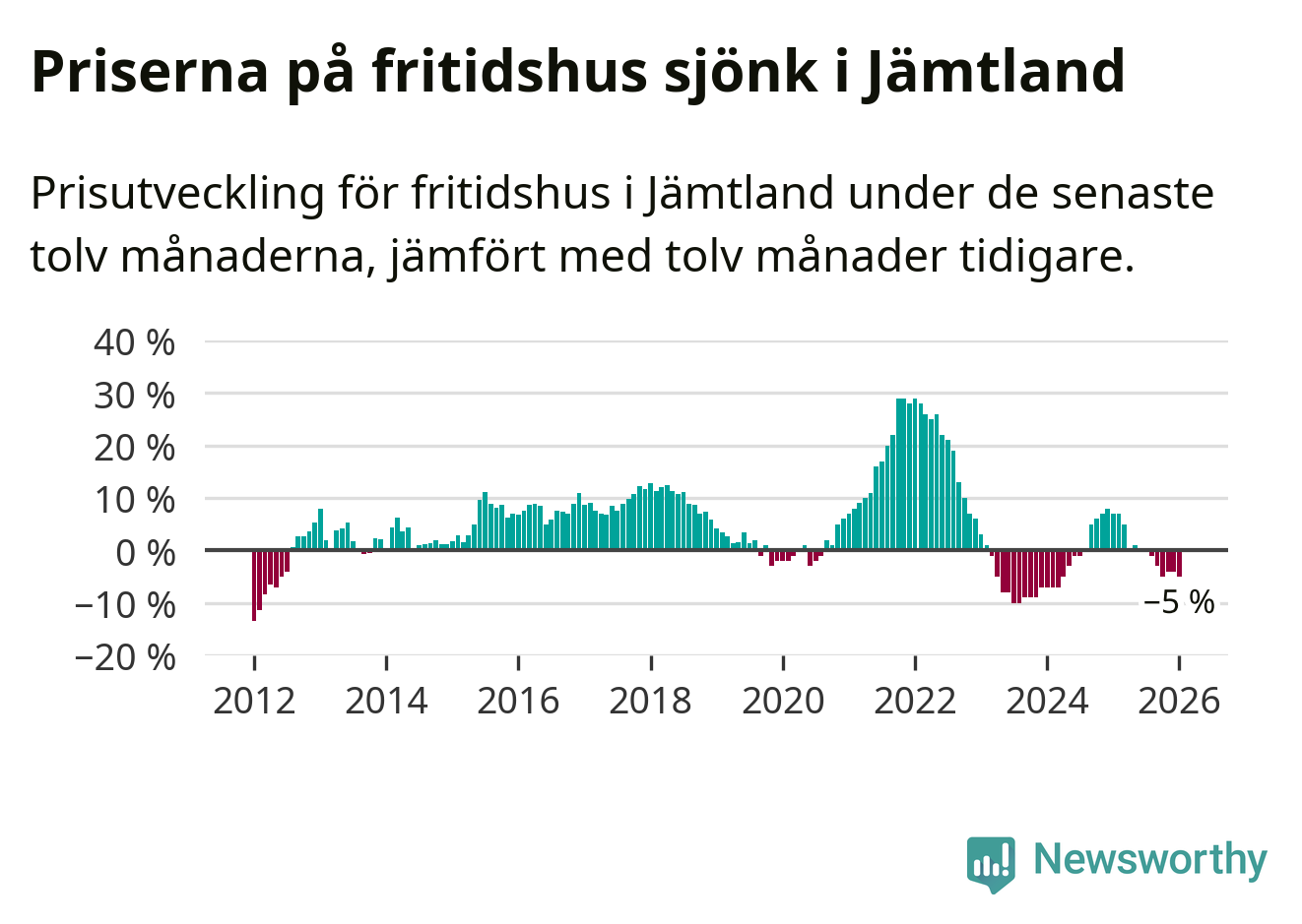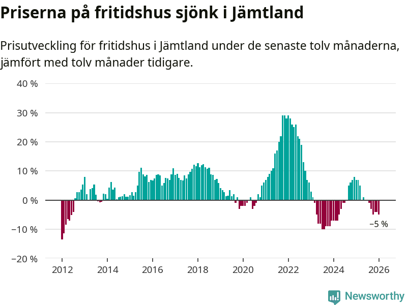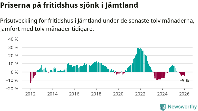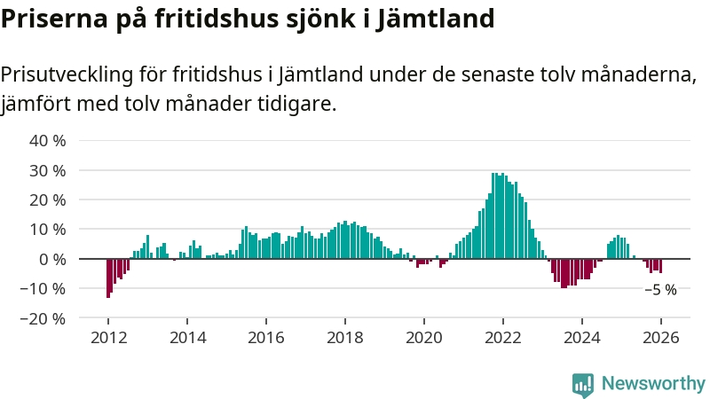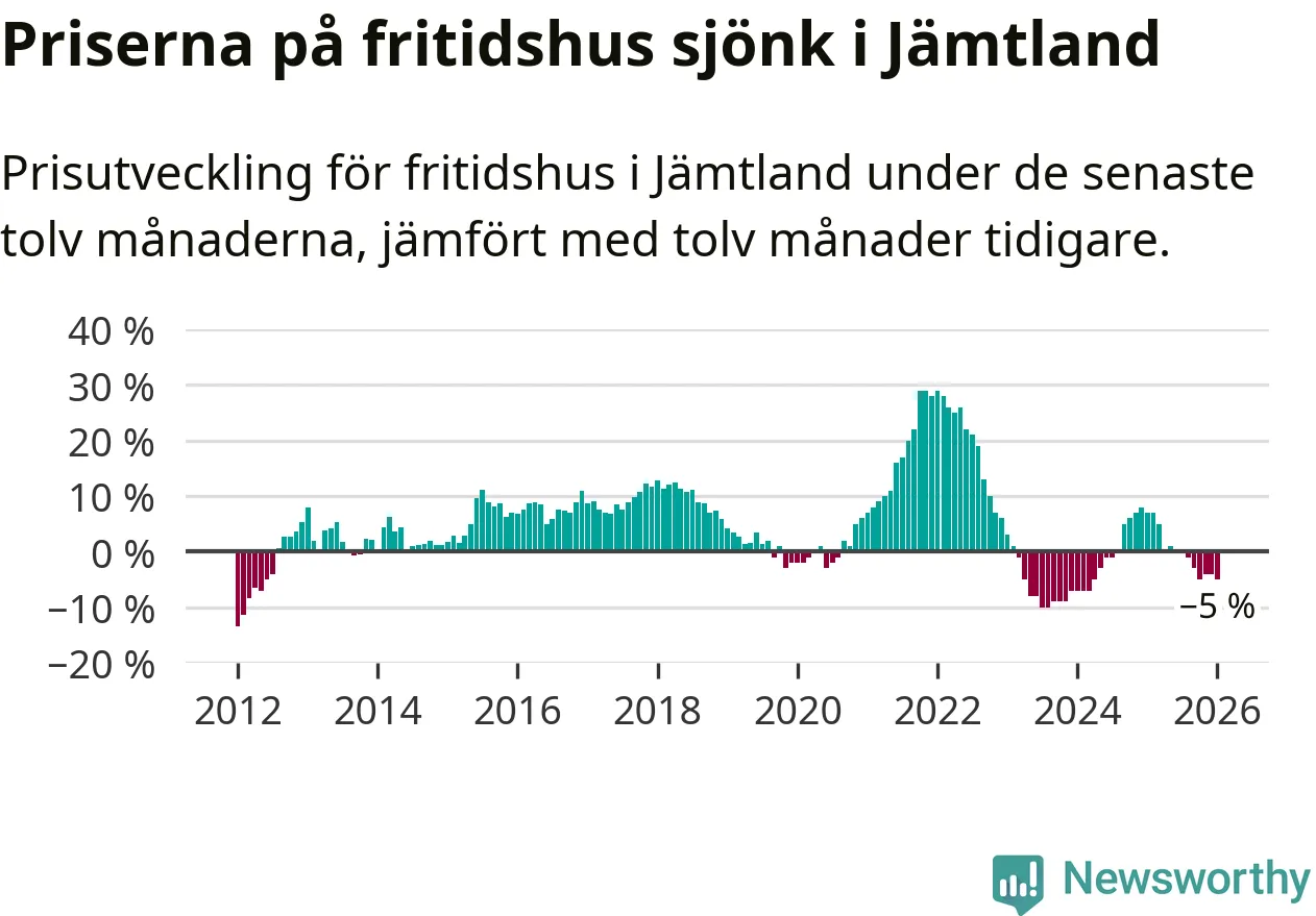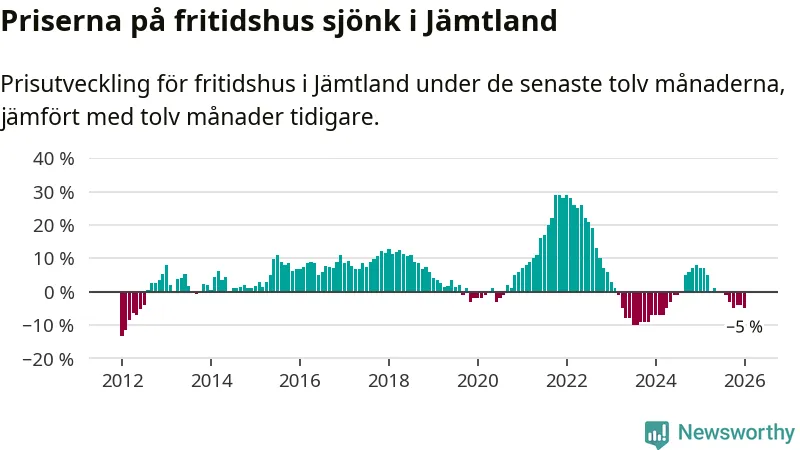 I Jämtlands län som helhet går priserna på fritidshus ner med 5 procent. Även i hela Sverige sjunker priserna på fritidshus. I hela riket noterades en prisnedgång på 3 procent.