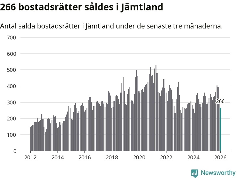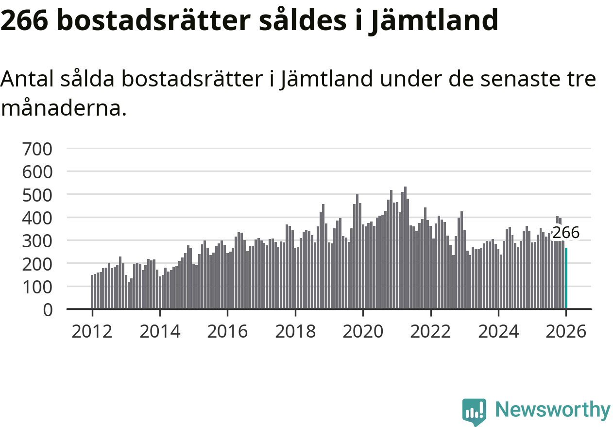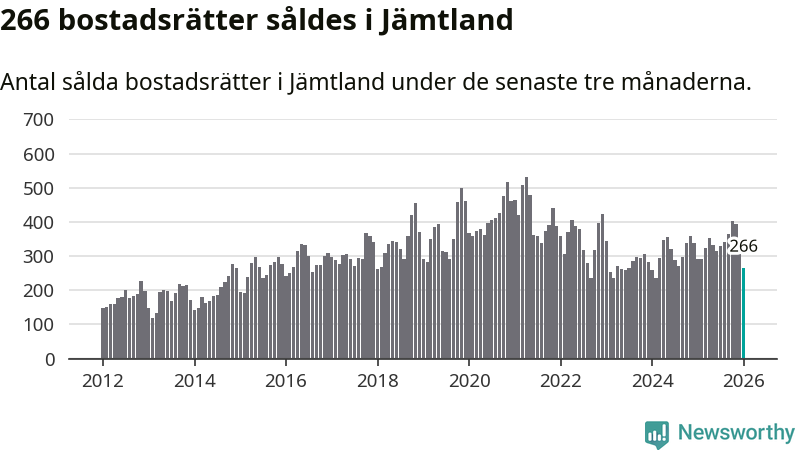 Sammanlagt såldes 266 bostadsrätter i Jämtlands län mellan november och januari till ett genomsnittligt pris på 2,3 miljoner kronor. I fjol gjordes 290 affärer vid den här tiden på året.