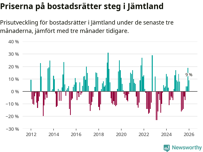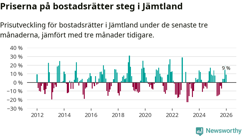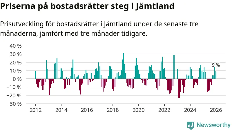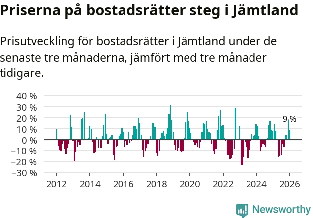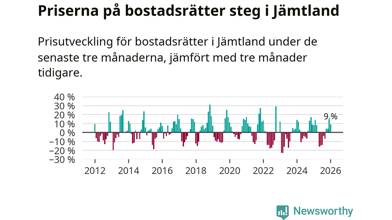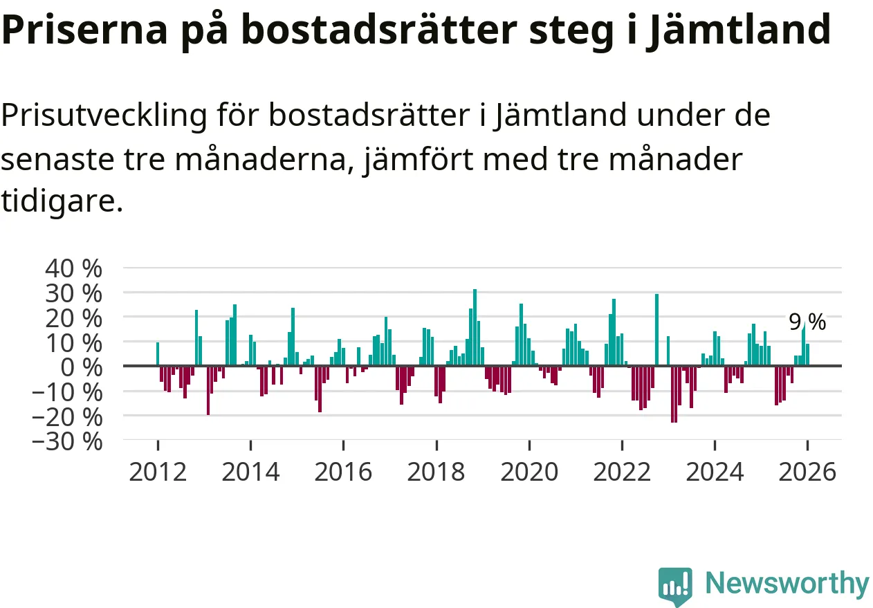 Priserna på bostadsrätter har gått upp i Jämtlands län. Medelpriset på försäljningarna under de senaste tre månaderna visar på en uppgång med 9 procent.
