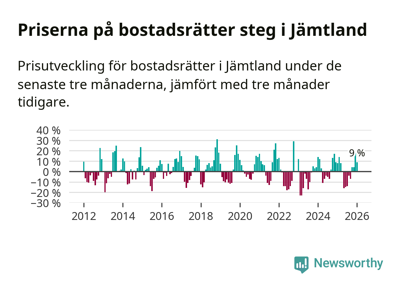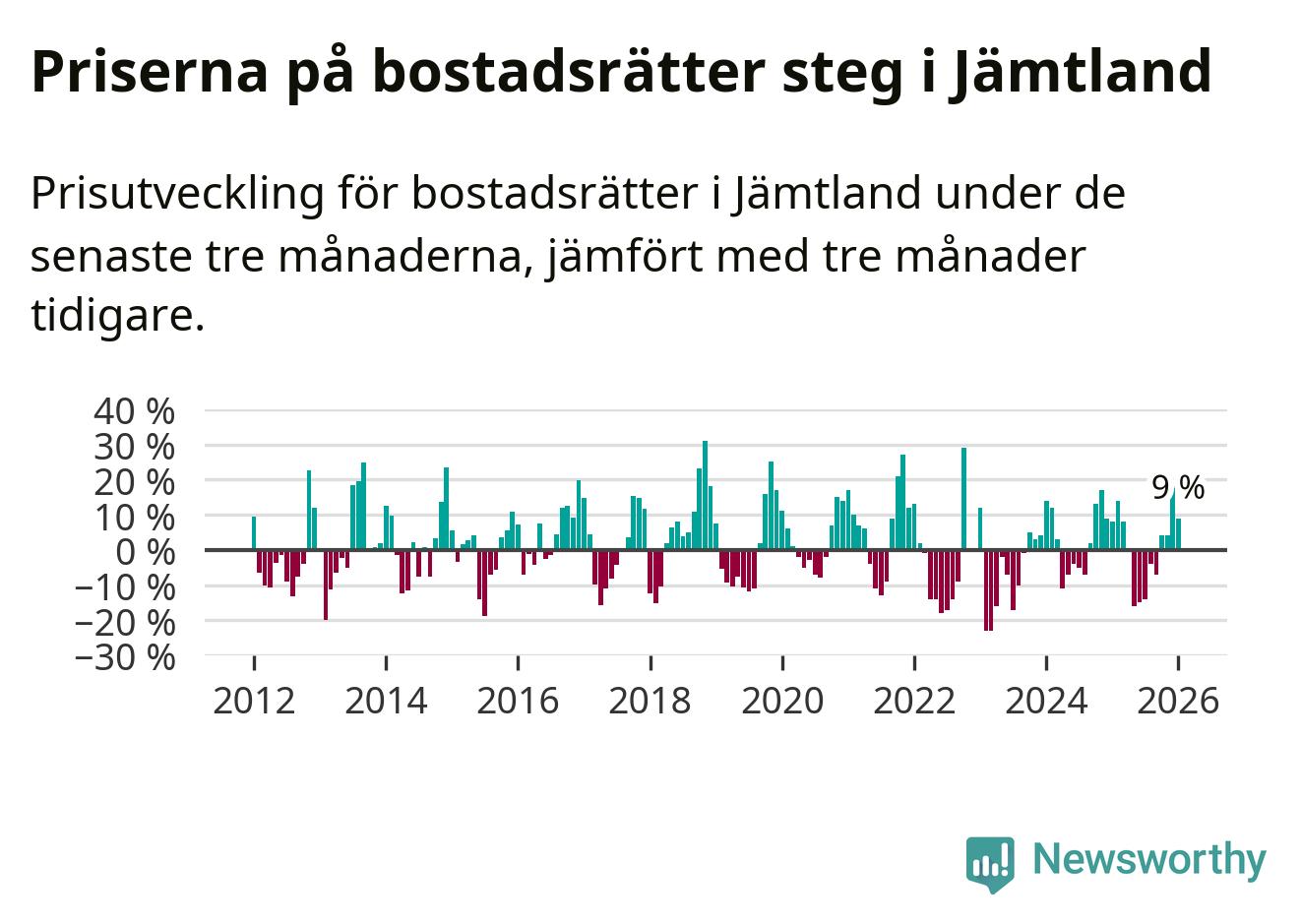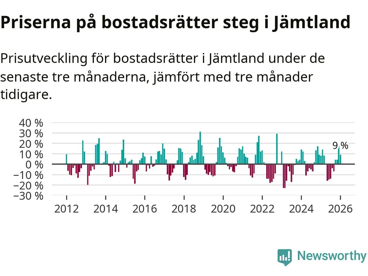 Priserna på bostadsrätter har gått upp i Jämtlands län. Medelpriset på försäljningarna under de senaste tre månaderna visar på en uppgång med 9 procent.