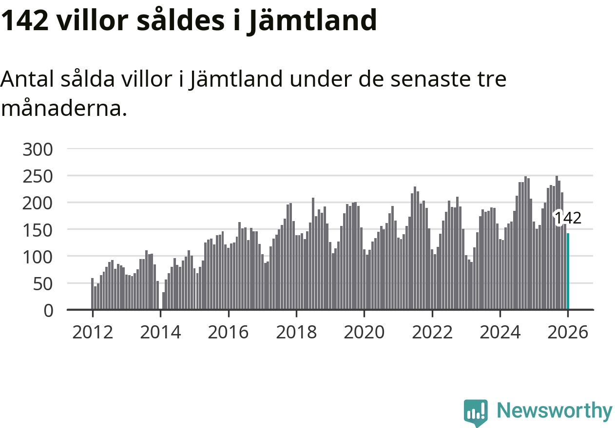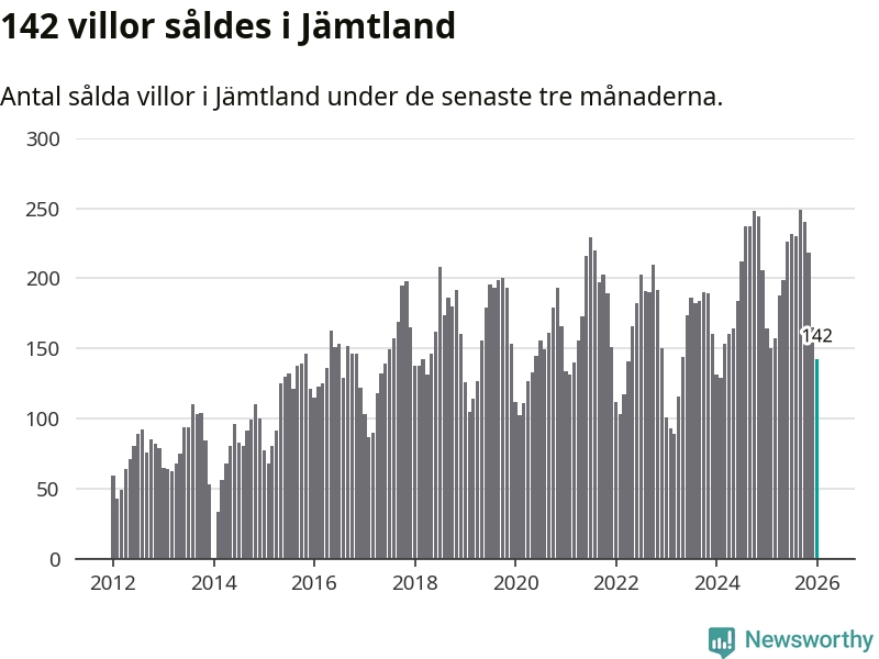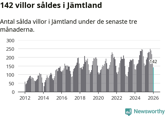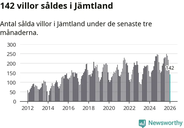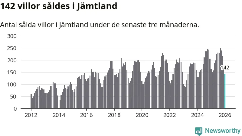 Sammanlagt såldes 142 villor i Jämtlands län mellan november och januari till ett genomsnittligt pris på 3,2 miljoner kronor. I fjol gjordes 164 affärer vid den här tiden på året.