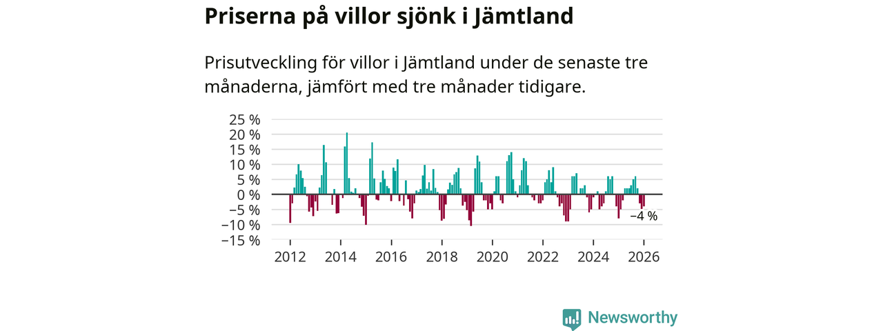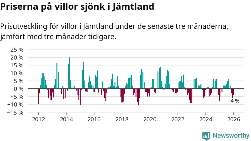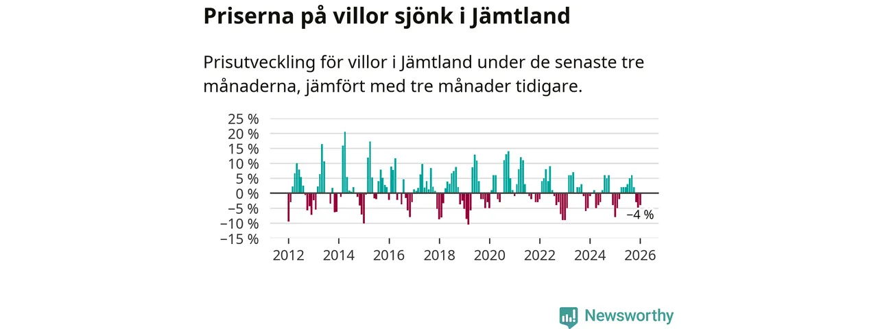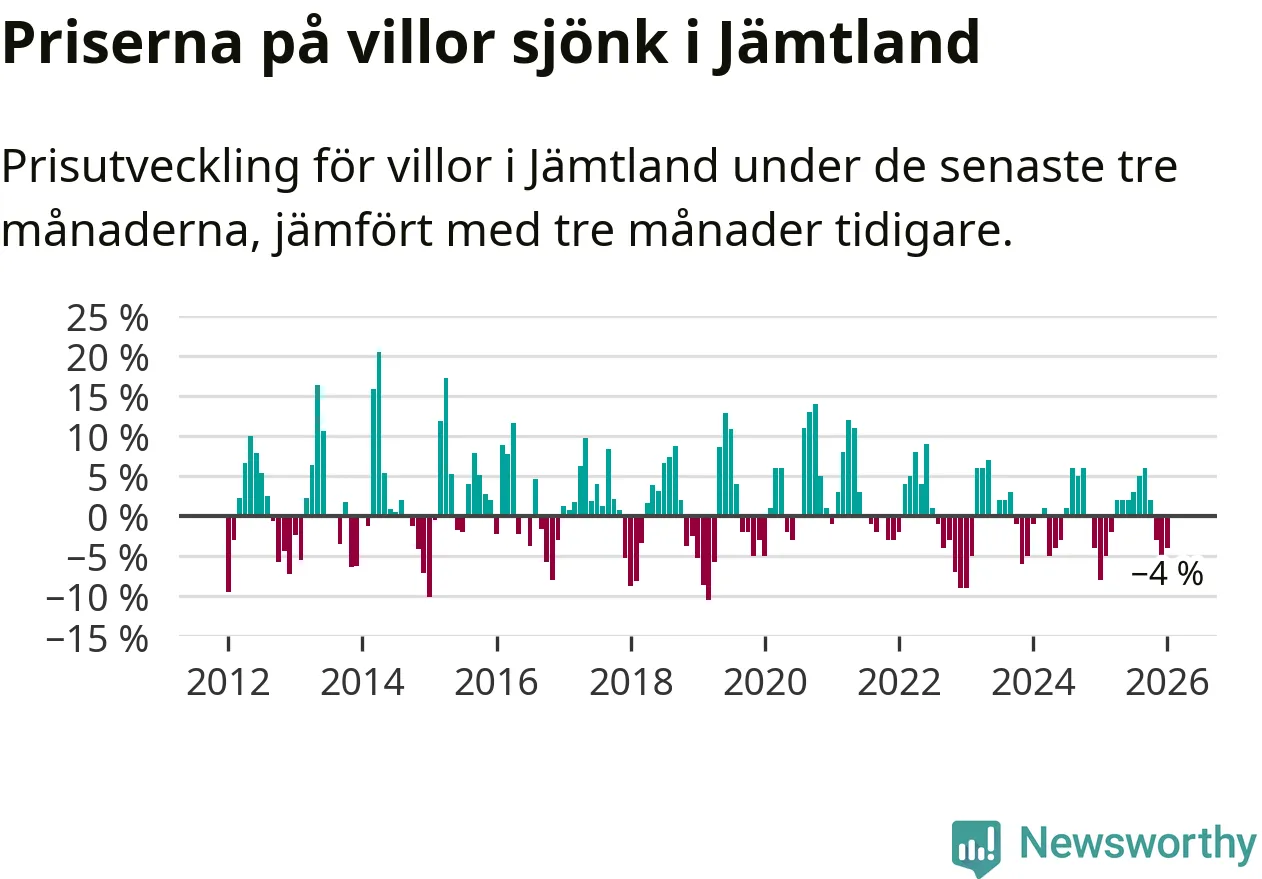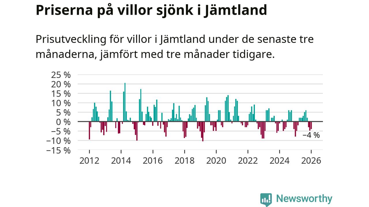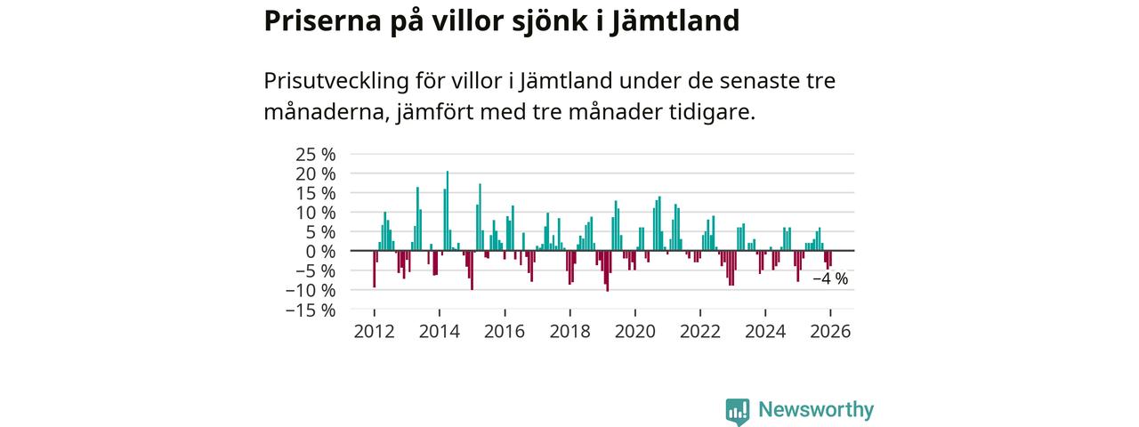 Villapriserna har gått ner i Jämtlands län. Medelpriset på försäljningarna under de senaste tre månaderna visar på en nedgång med 4 procent.
