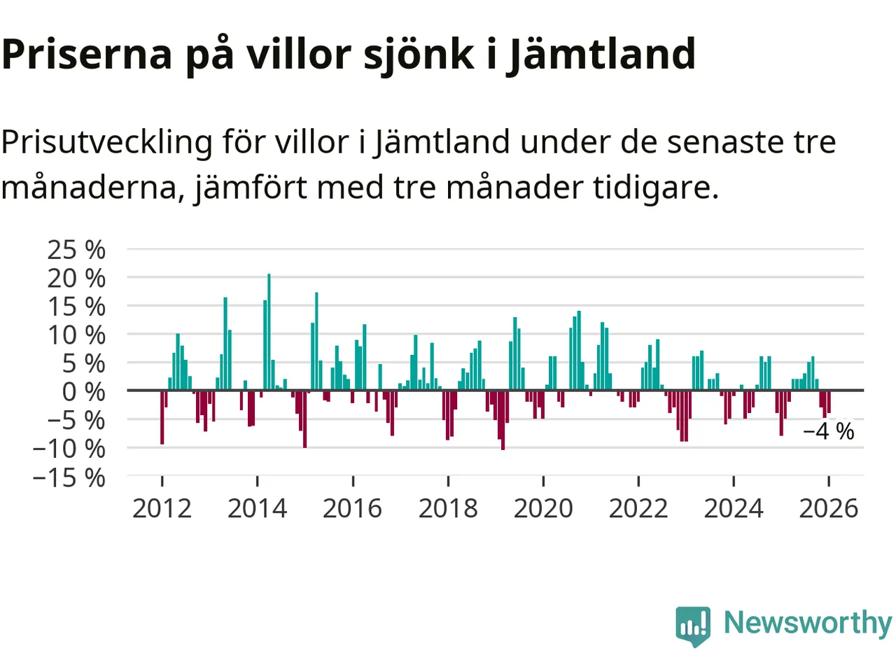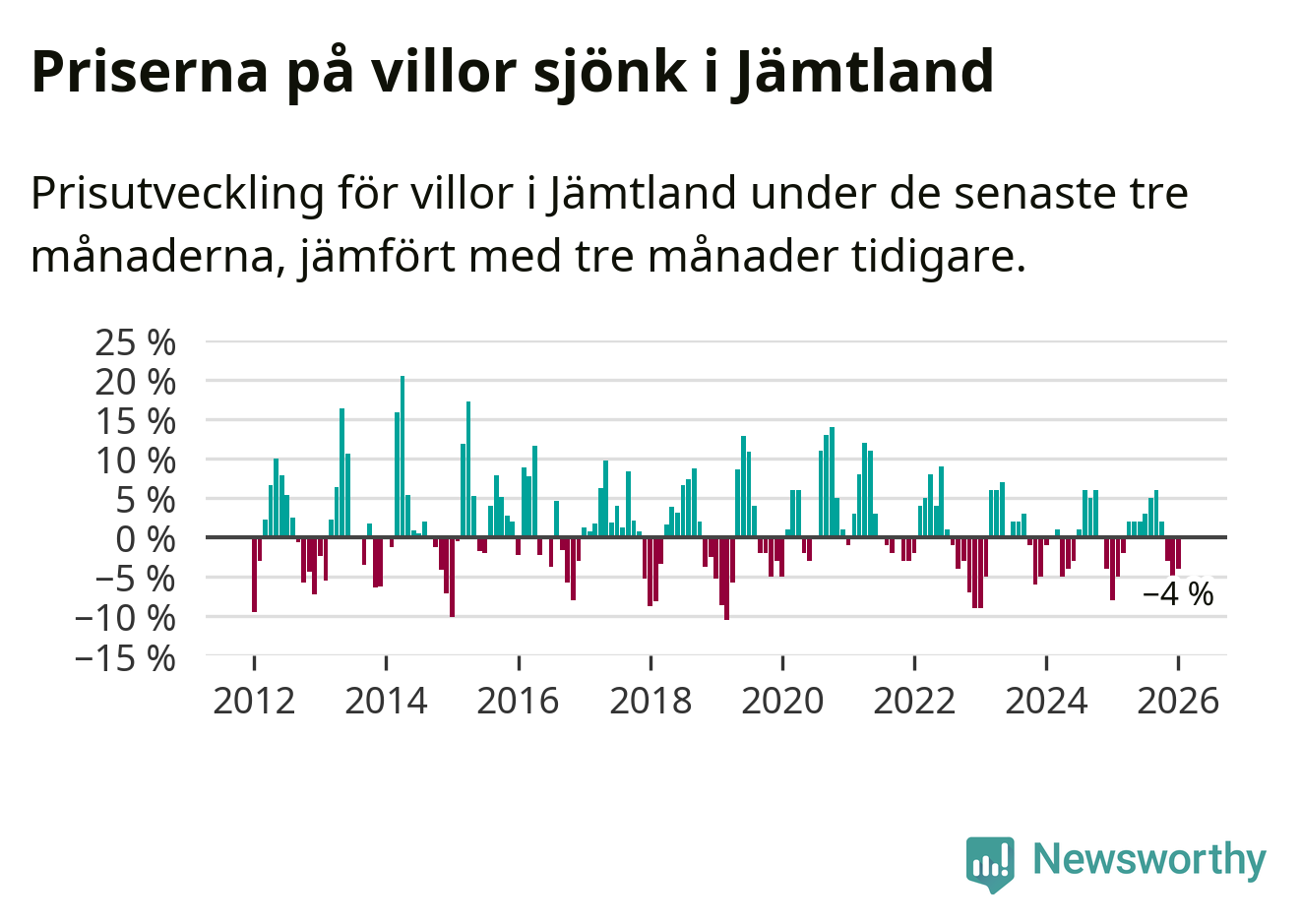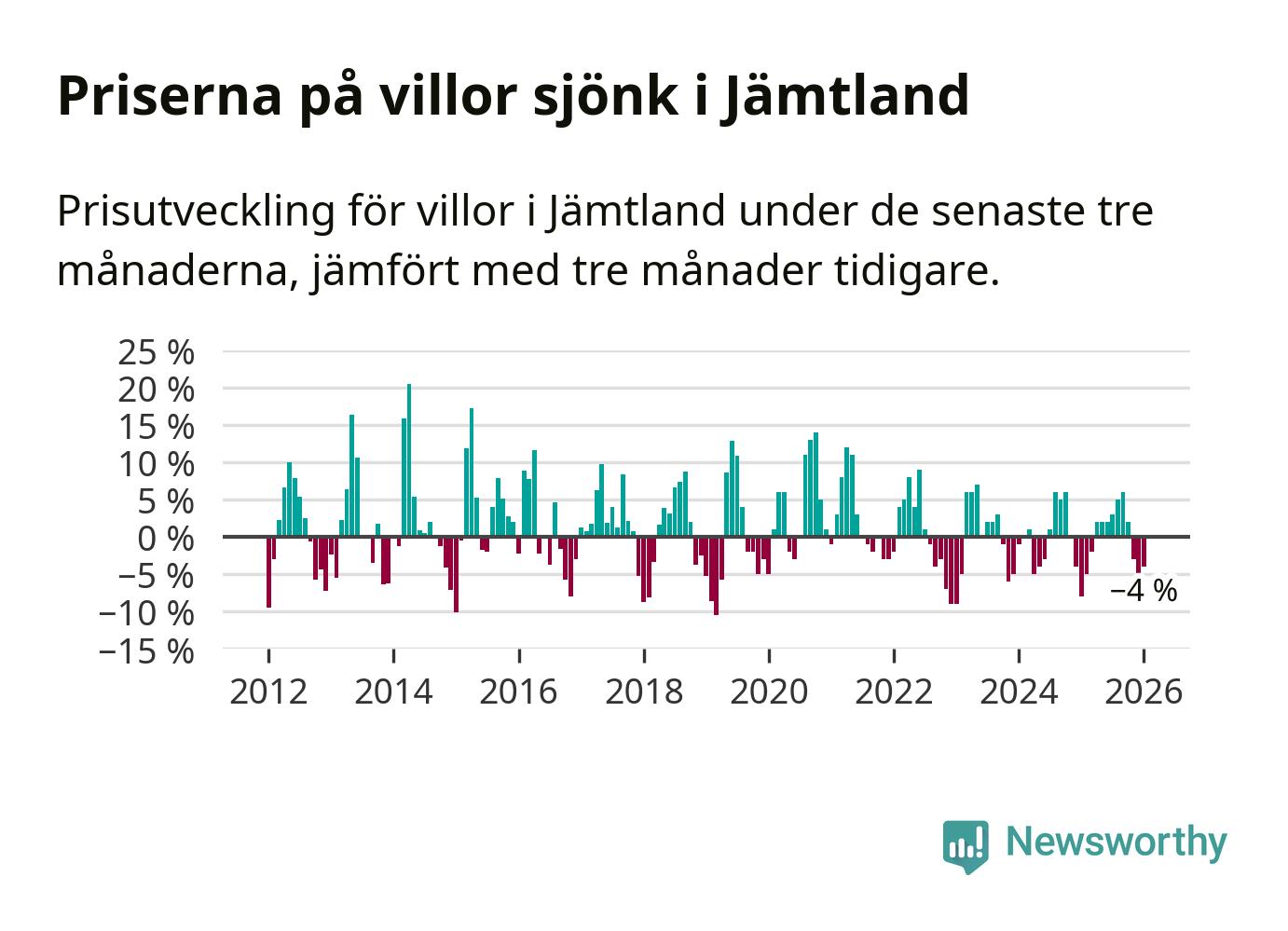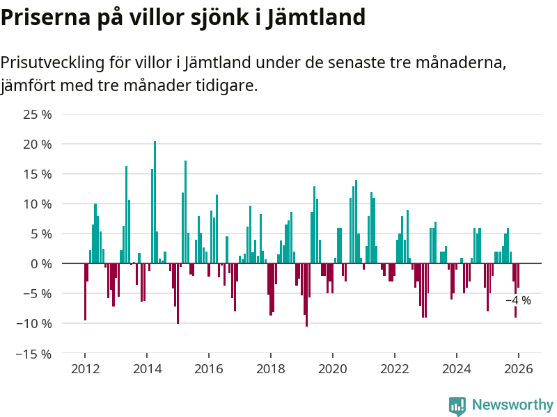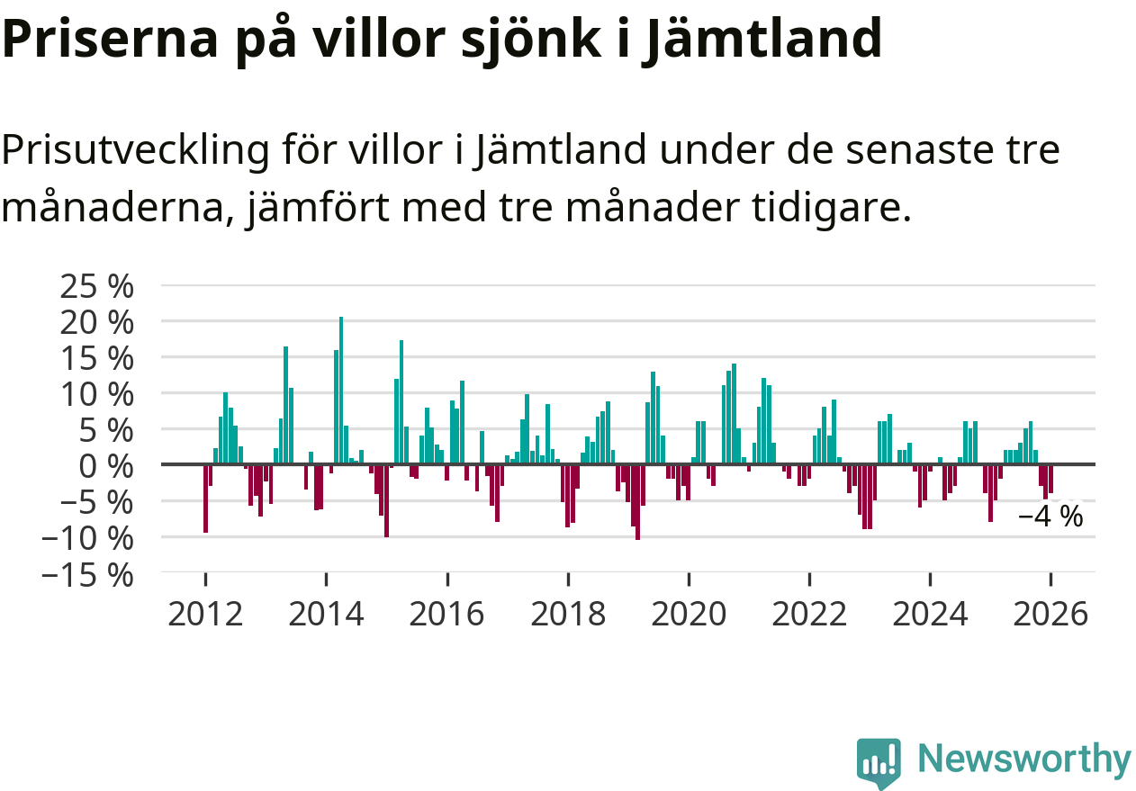 Villapriserna har gått ner i Jämtlands län. Medelpriset på försäljningarna under de senaste tre månaderna visar på en nedgång med 4 procent.