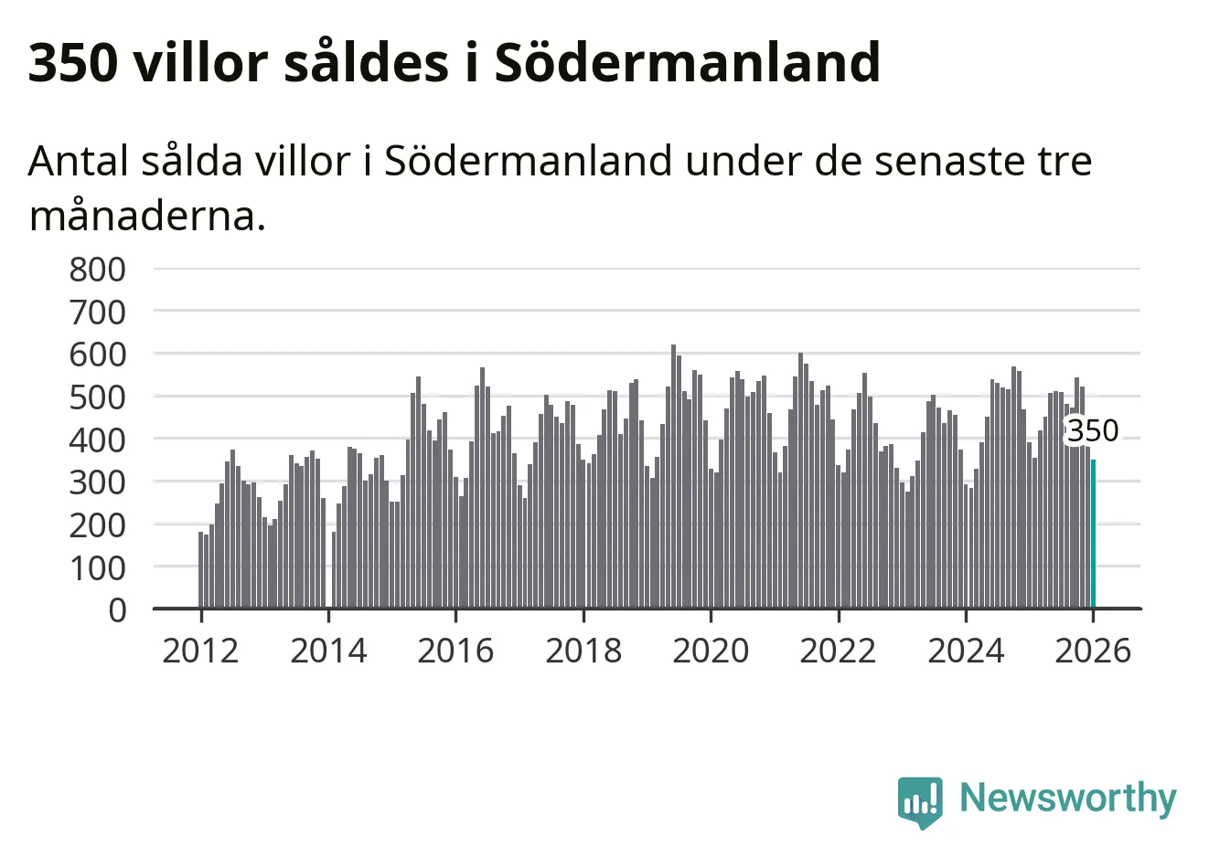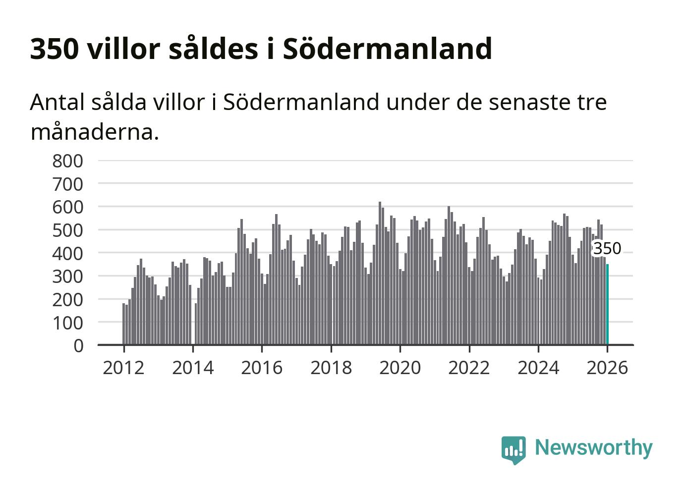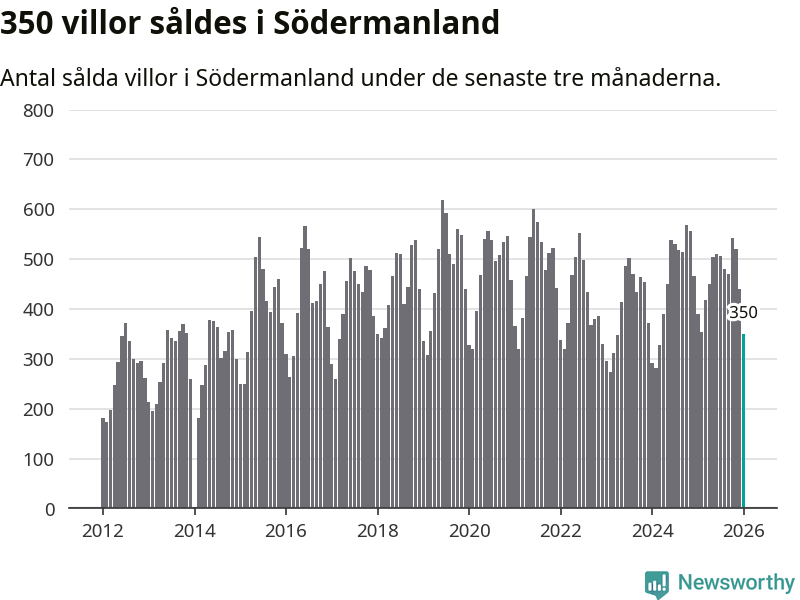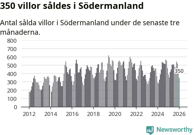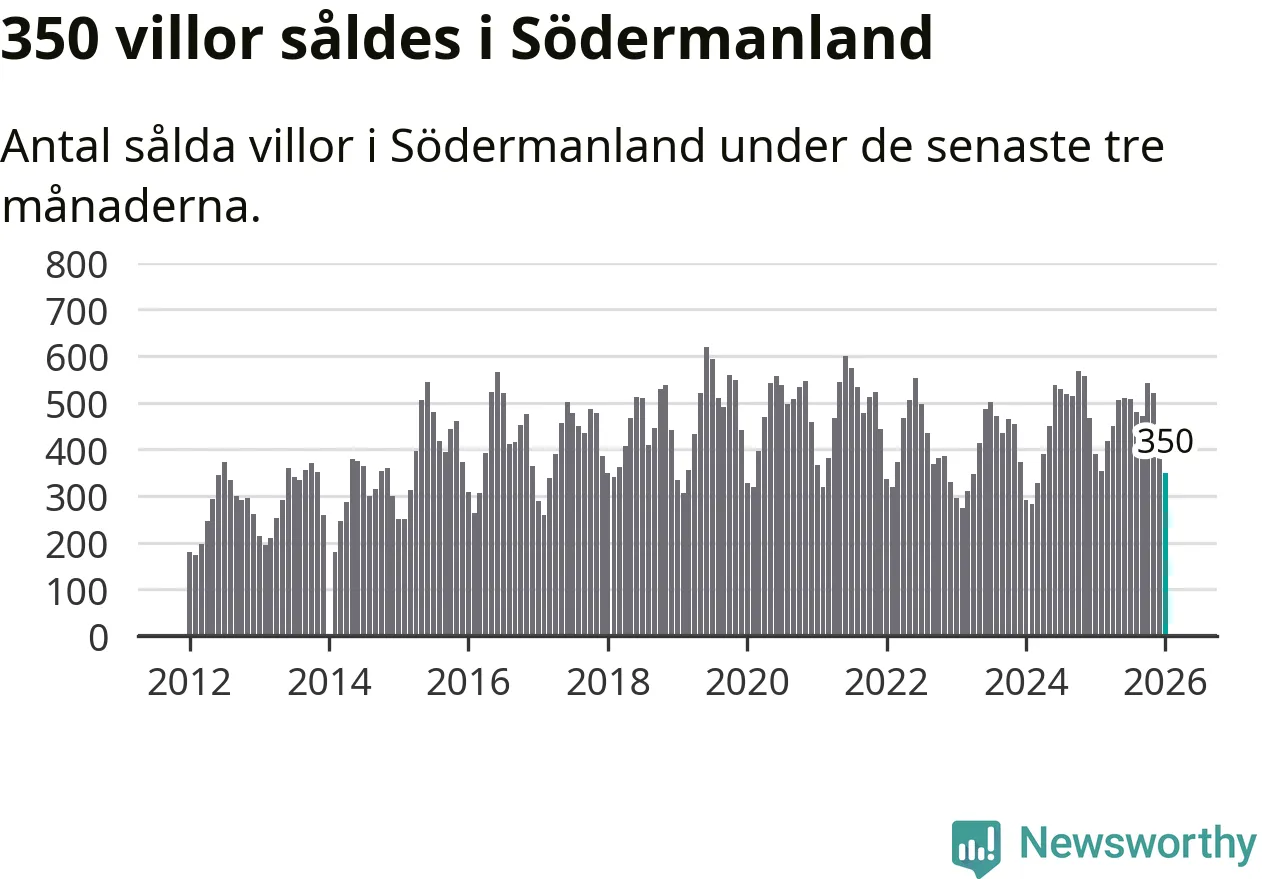 Sammanlagt såldes 350 villor i Södermanlands län mellan november och januari till ett genomsnittligt pris på 3,4 miljoner kronor. I fjol gjordes 391 affärer vid den här tiden på året.