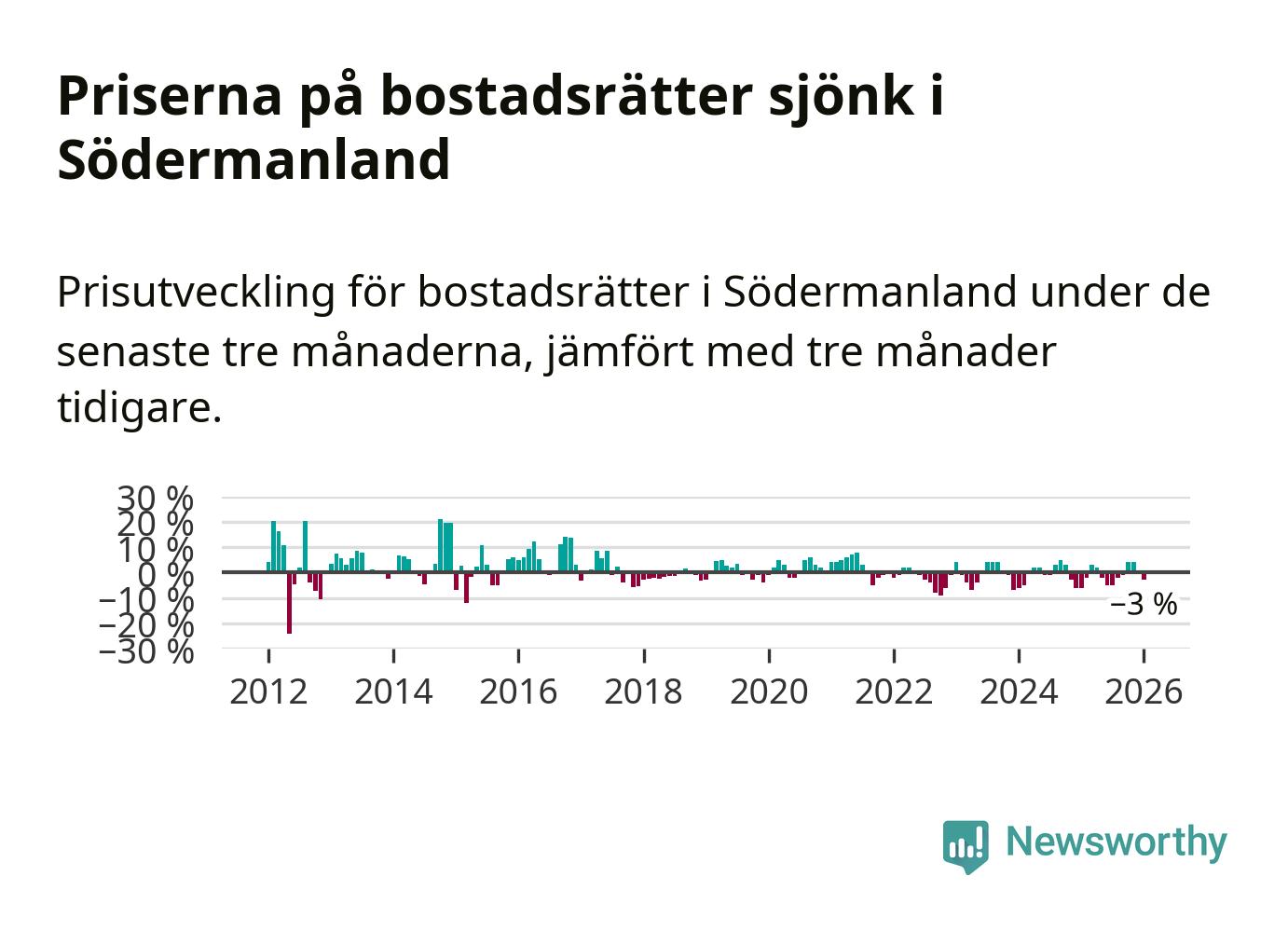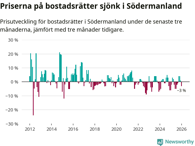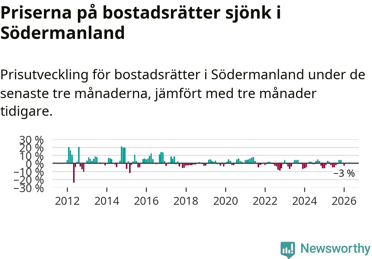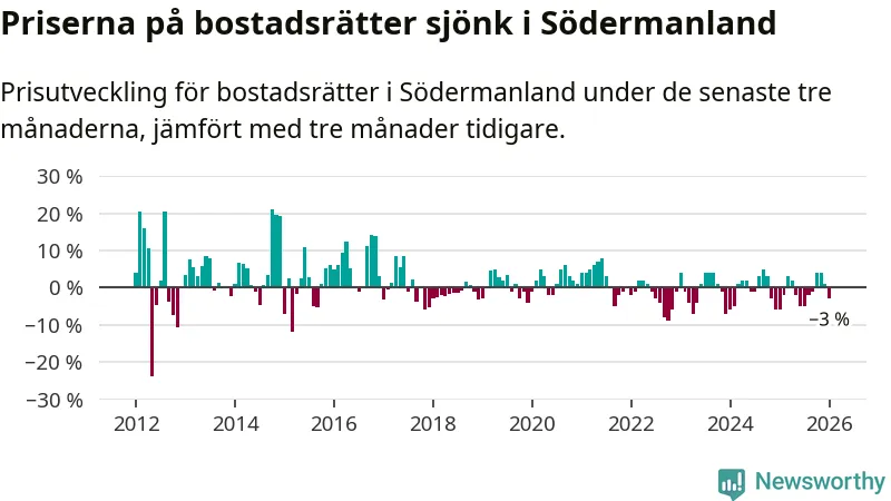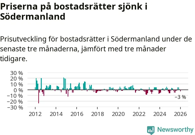 Statistiken visar även på en prisnedgång i Södermanlands län. Medelpriset på försäljningarna av bostadsrätter i länet var 3 procent lägre än för tre månader sedan. Även i hela Sverige sjunker priserna på bostadsrätter. I hela riket noterades en prisnedgång på 1 procent.