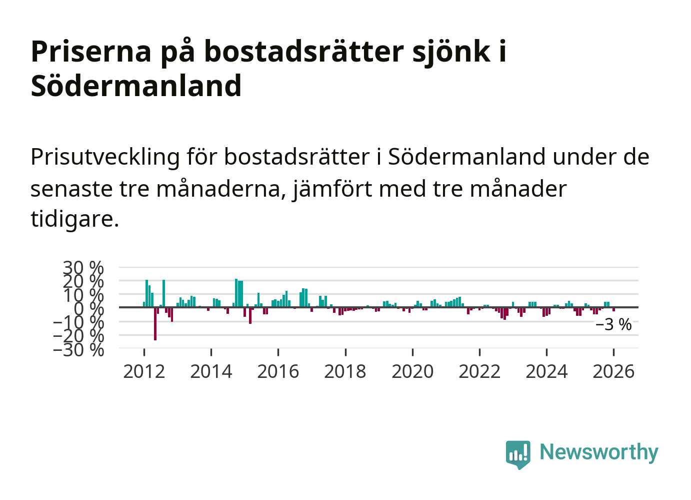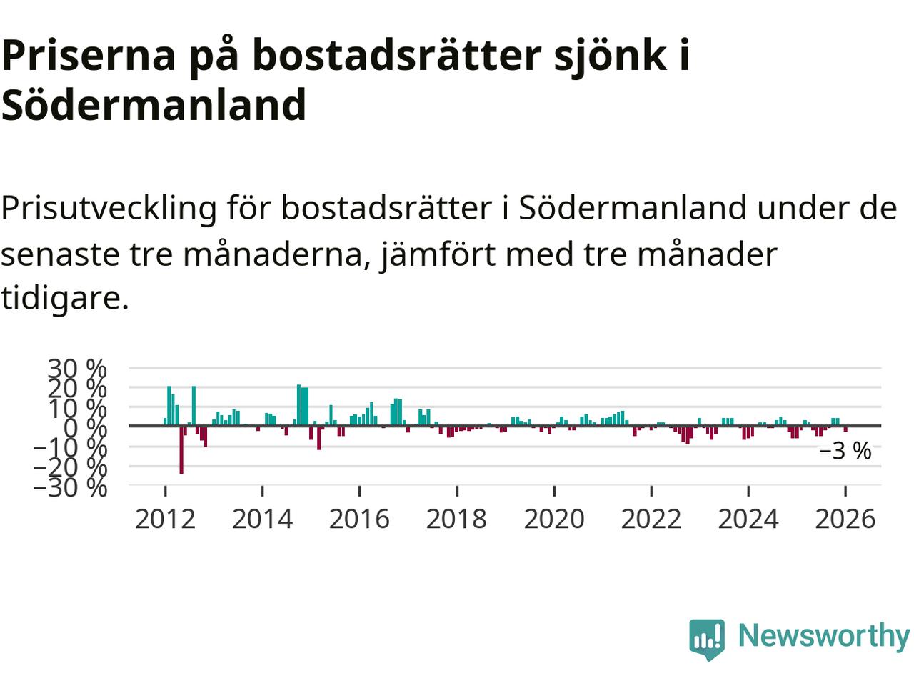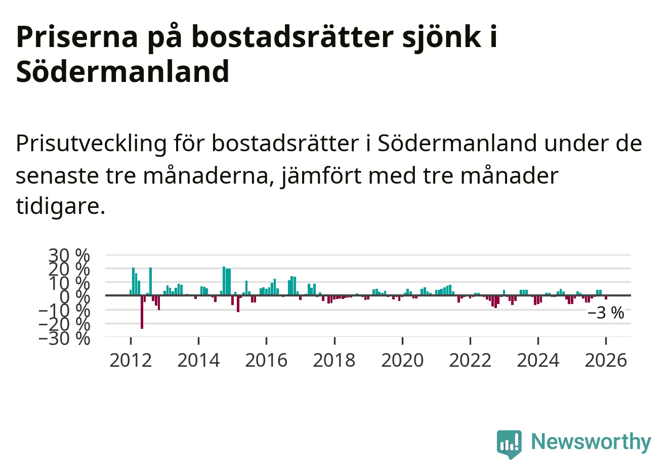 Statistiken visar även på en prisnedgång i Södermanlands län. Medelpriset på försäljningarna av bostadsrätter i länet var 3 procent lägre än för tre månader sedan. Även i hela Sverige sjunker priserna på bostadsrätter. I hela riket noterades en prisnedgång på 1 procent.