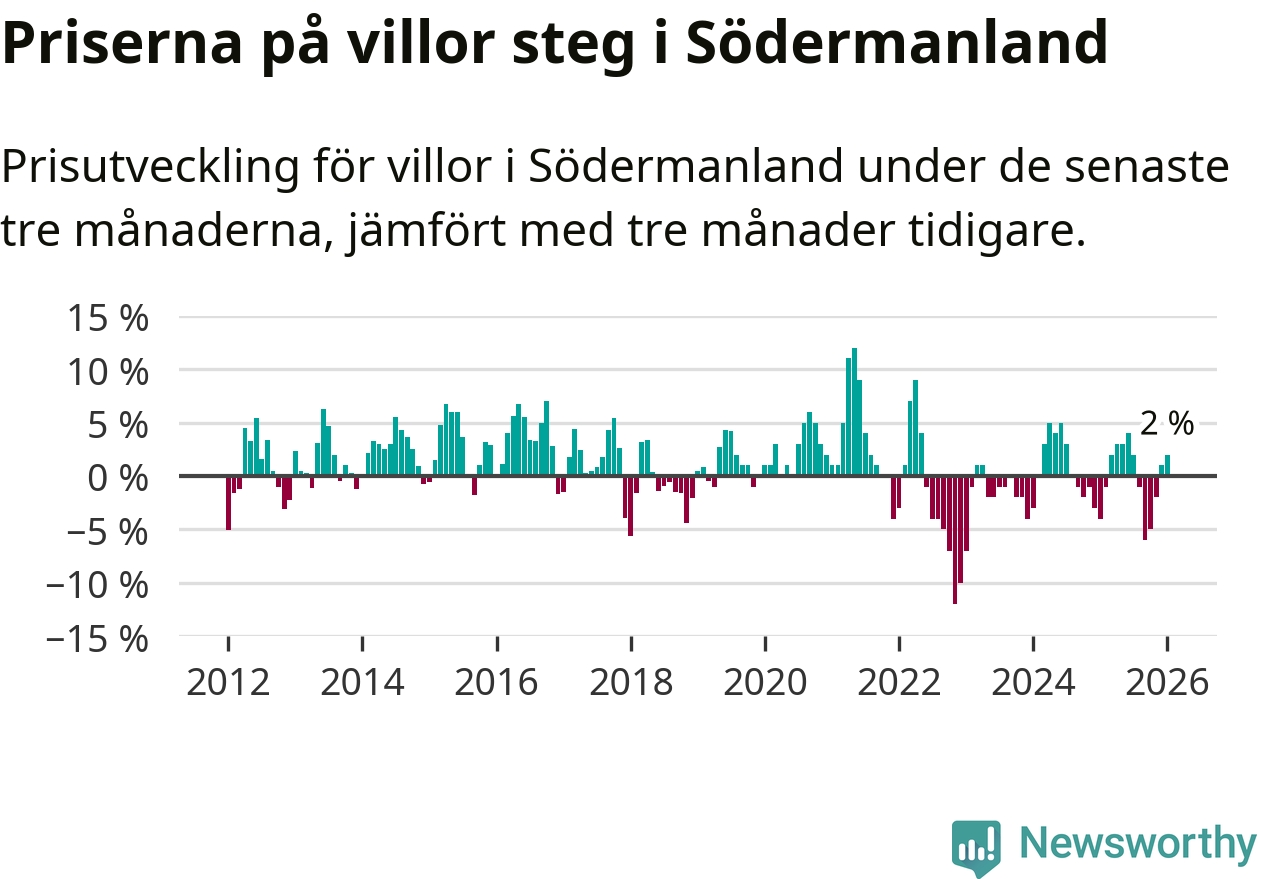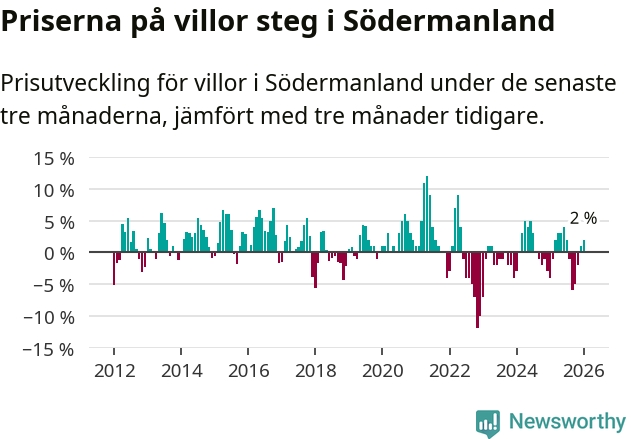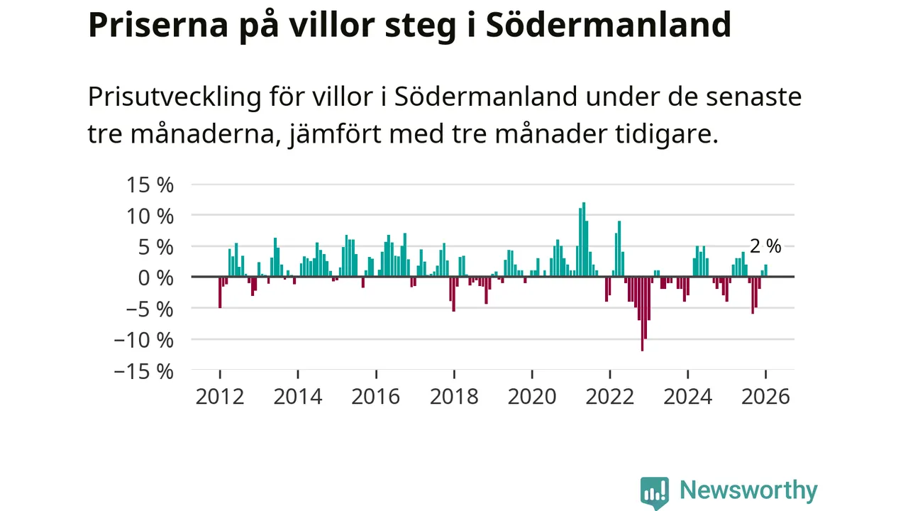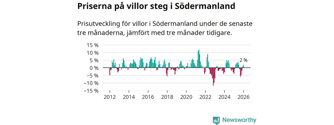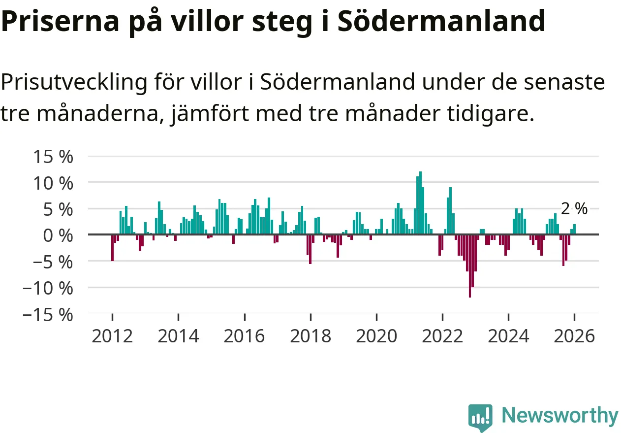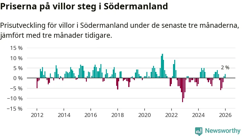 Villapriserna har gått upp i Södermanlands län. Medelpriset på försäljningarna under de senaste tre månaderna visar på en uppgång med 2 procent.