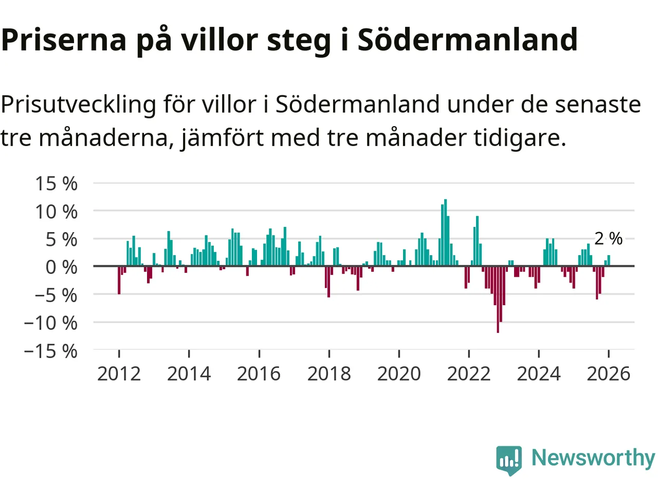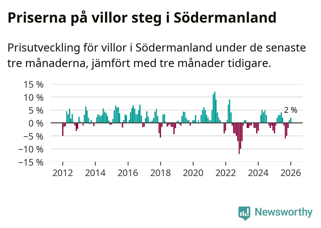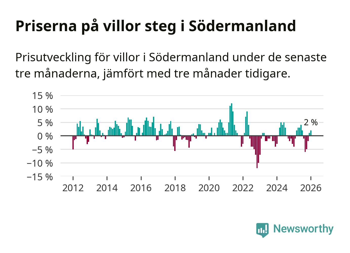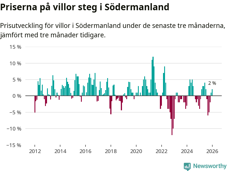 Villapriserna har gått upp i Södermanlands län. Medelpriset på försäljningarna under de senaste tre månaderna visar på en uppgång med 2 procent.