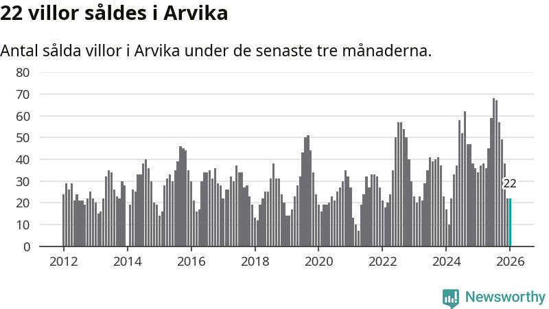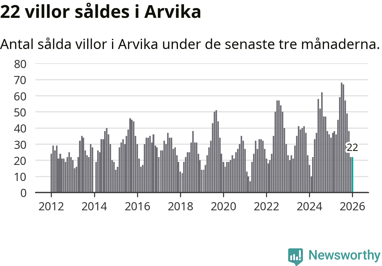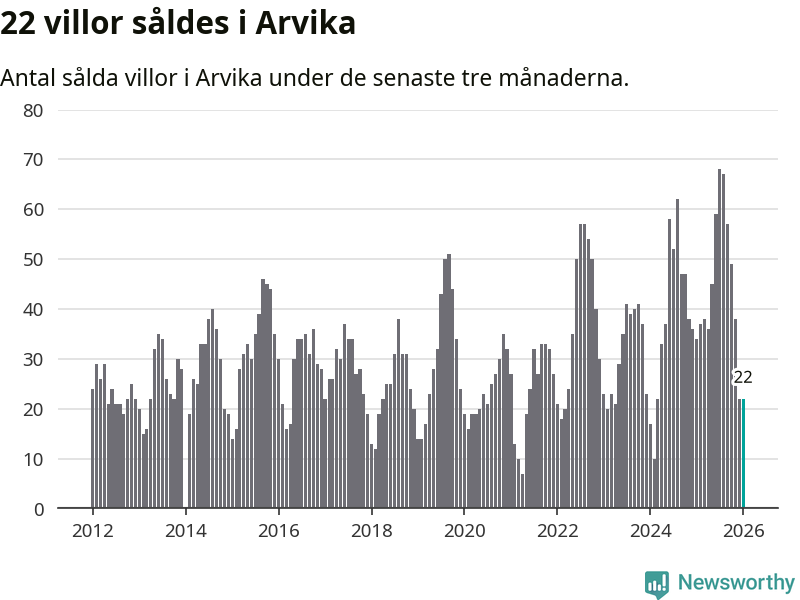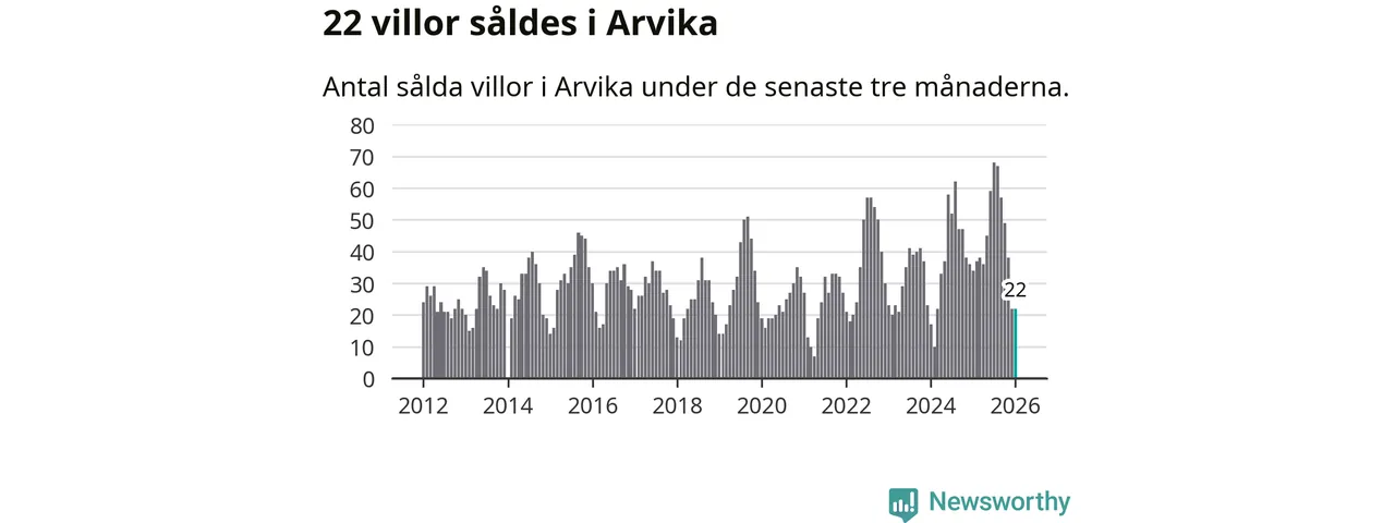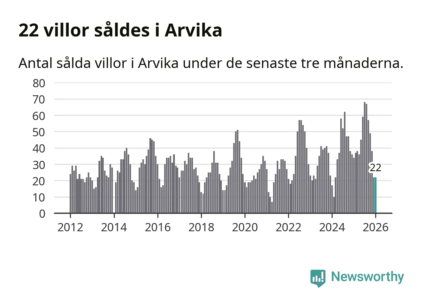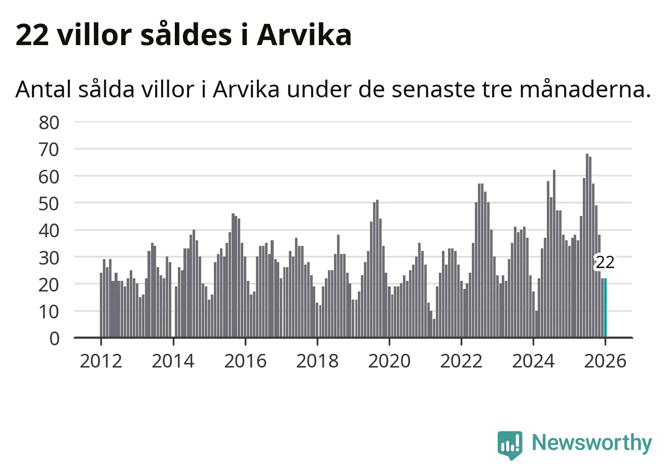 Mellan november och januari såldes 22 villor i Arvika kommun. Det är relativt få sett till aktiviteten på bostadsmarknaden i kommunen under de senaste tolv månaderna, samt det historiska snittet för den här tiden på året.