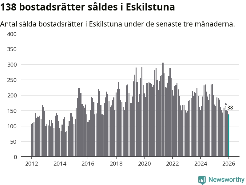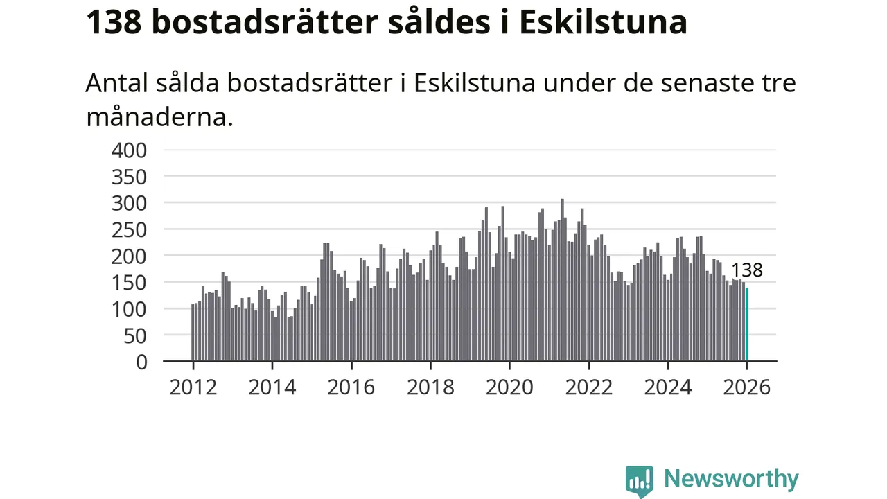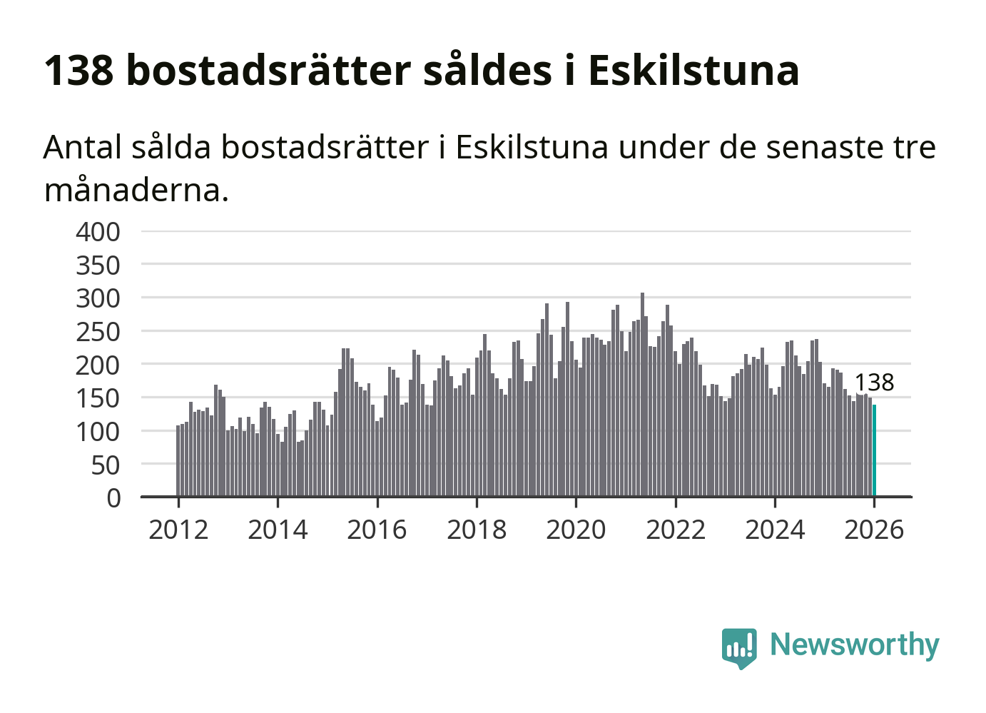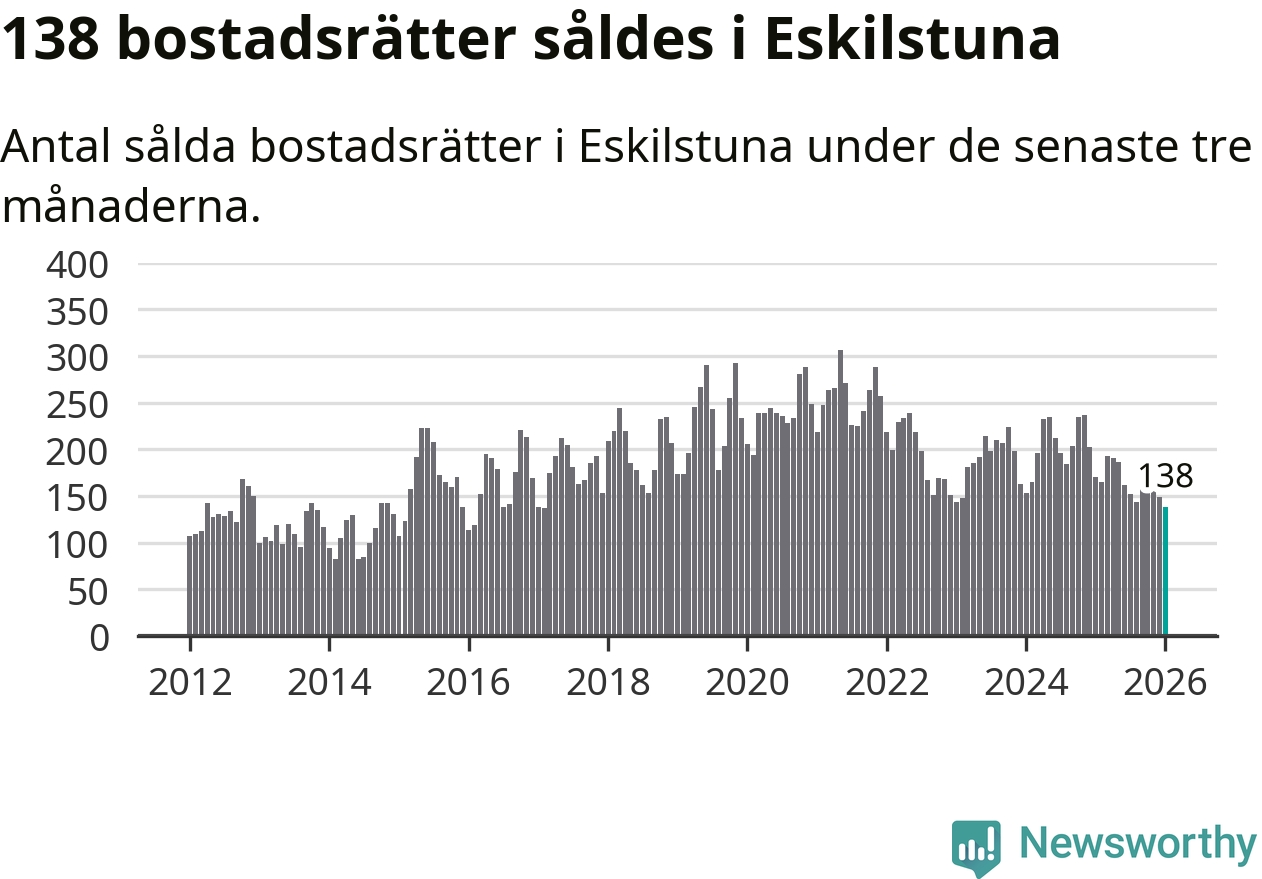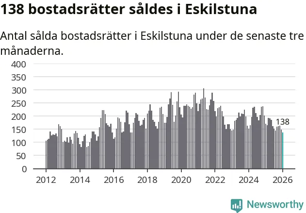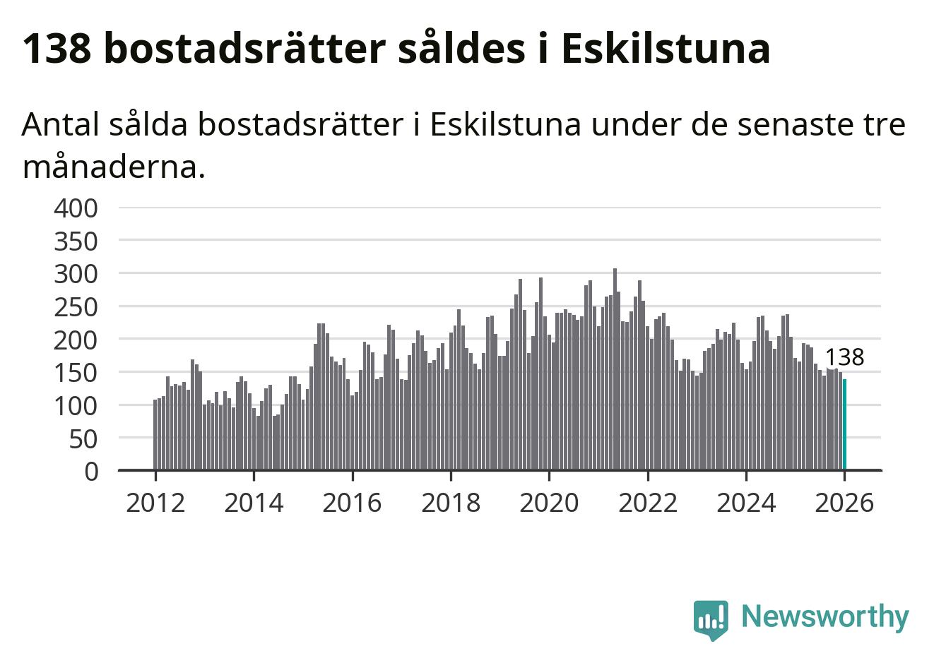 Mellan november och januari såldes 138 bostadsrätter i Eskilstuna kommun. Det är färre än någon tremånadersperiod sedan 2017.