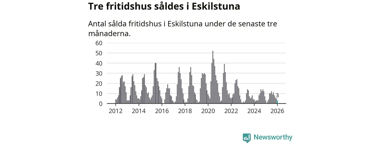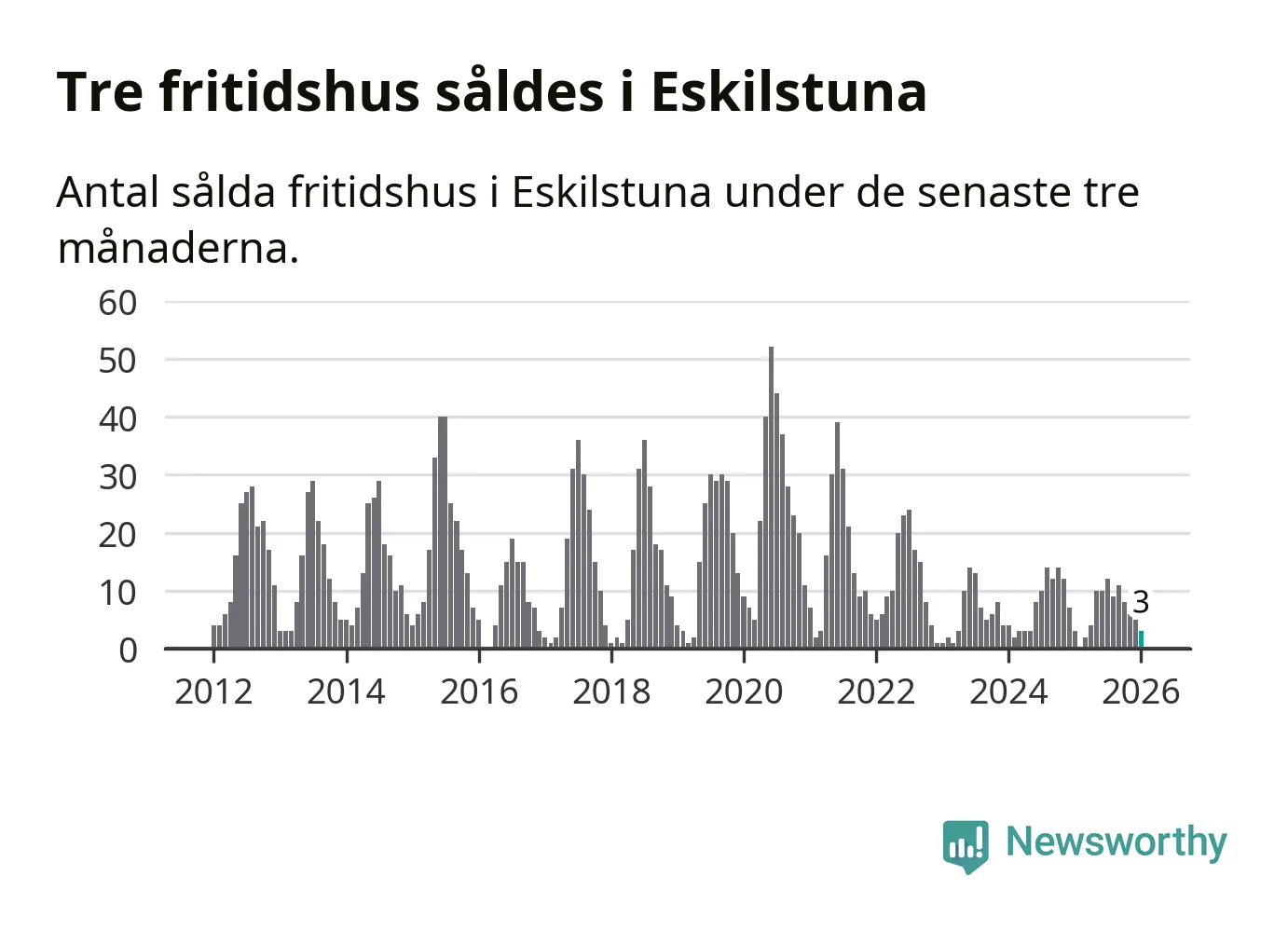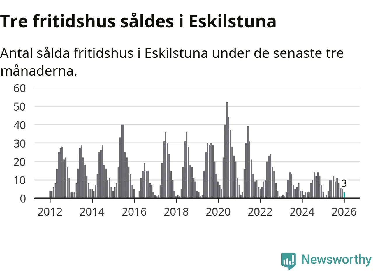 Sammanlagt såldes tre fritidshus i Eskilstuna kommun mellan november 2025 och januari till ett genomsnittligt pris på 1,2 miljoner kronor. I fjol gjordes tre affärer vid den här tiden på året.