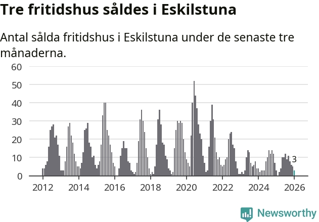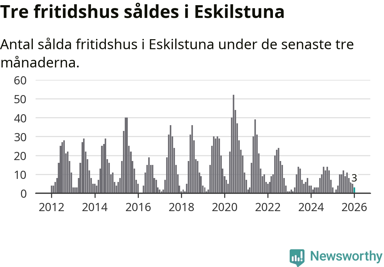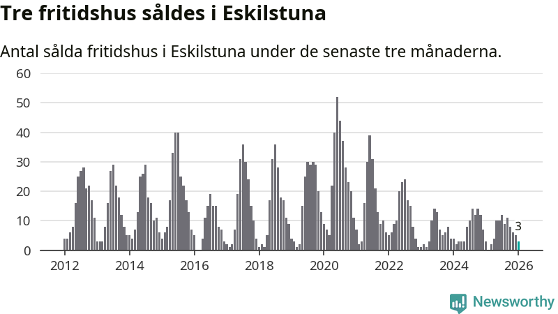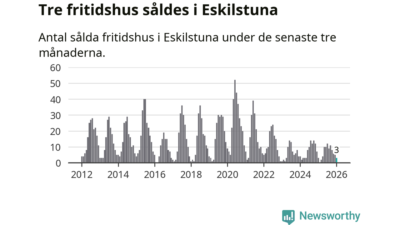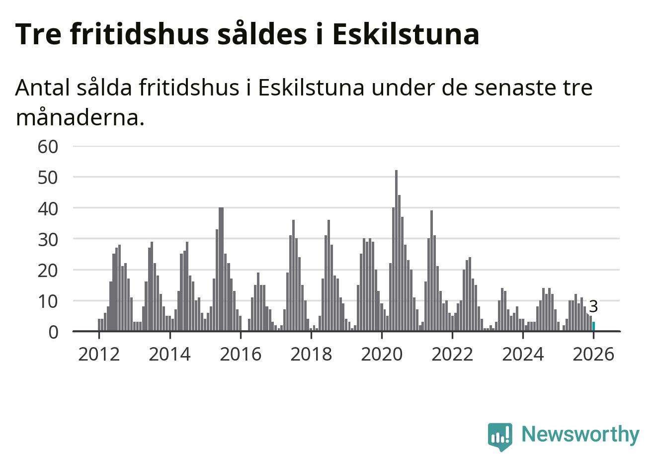 Sammanlagt såldes tre fritidshus i Eskilstuna kommun mellan november 2025 och januari till ett genomsnittligt pris på 1,2 miljoner kronor. I fjol gjordes tre affärer vid den här tiden på året.