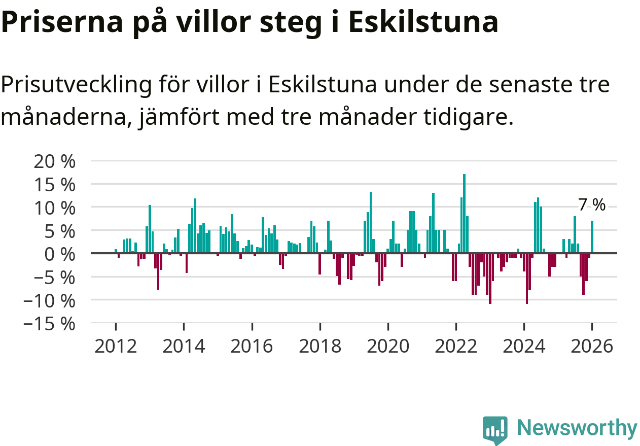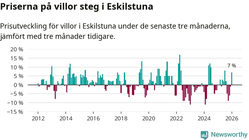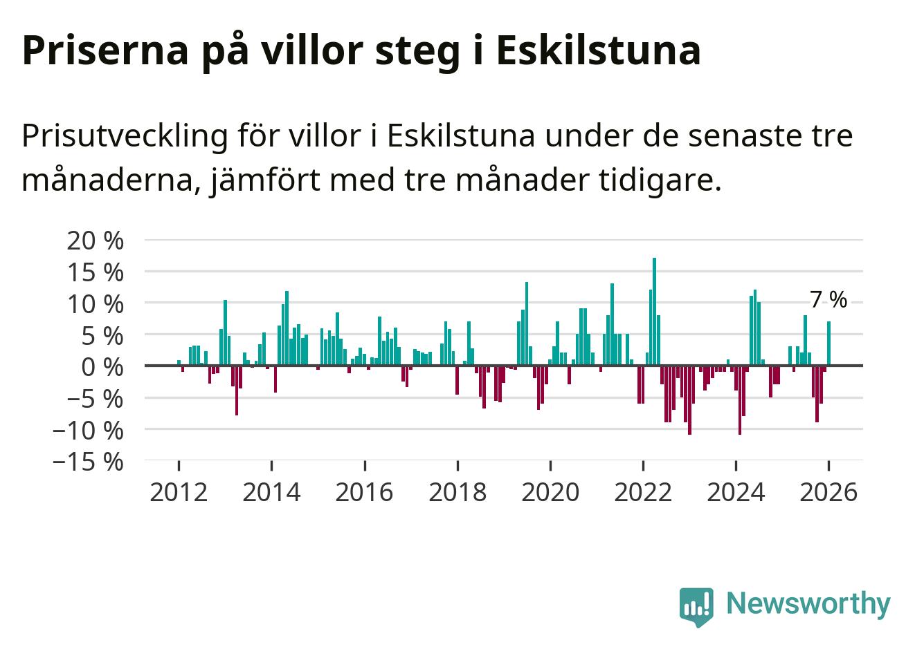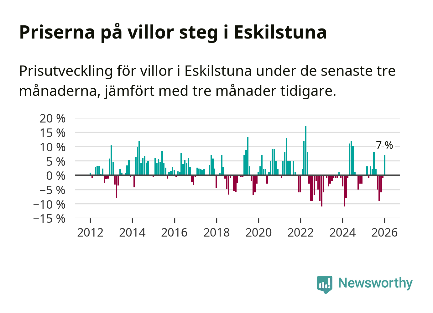 Villapriserna steg mellan november och januari med 7 procent i Eskilstuna kommun. Det är en betydande uppgång jämfört med det gångna året då priserna i snitt stått stilla.