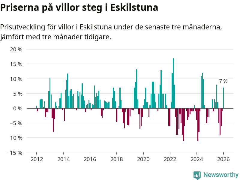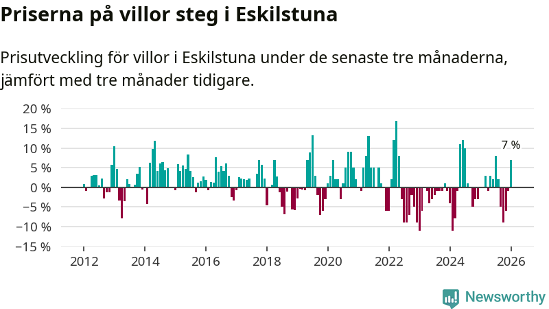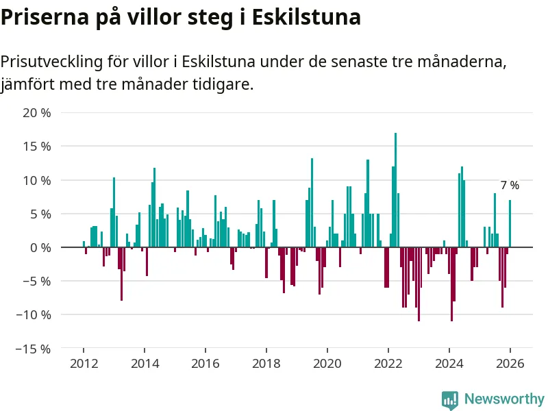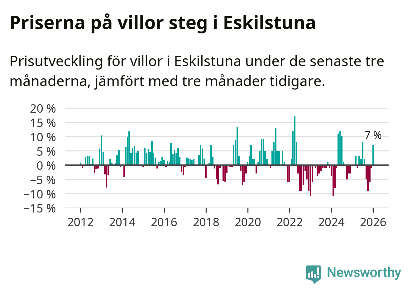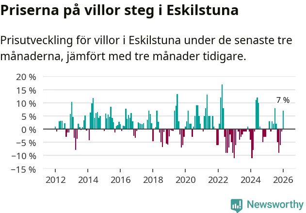 Villapriserna steg mellan november och januari med 7 procent i Eskilstuna kommun. Det är en betydande uppgång jämfört med det gångna året då priserna i snitt stått stilla.