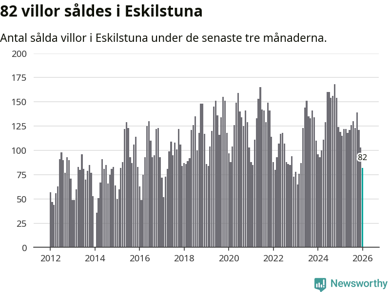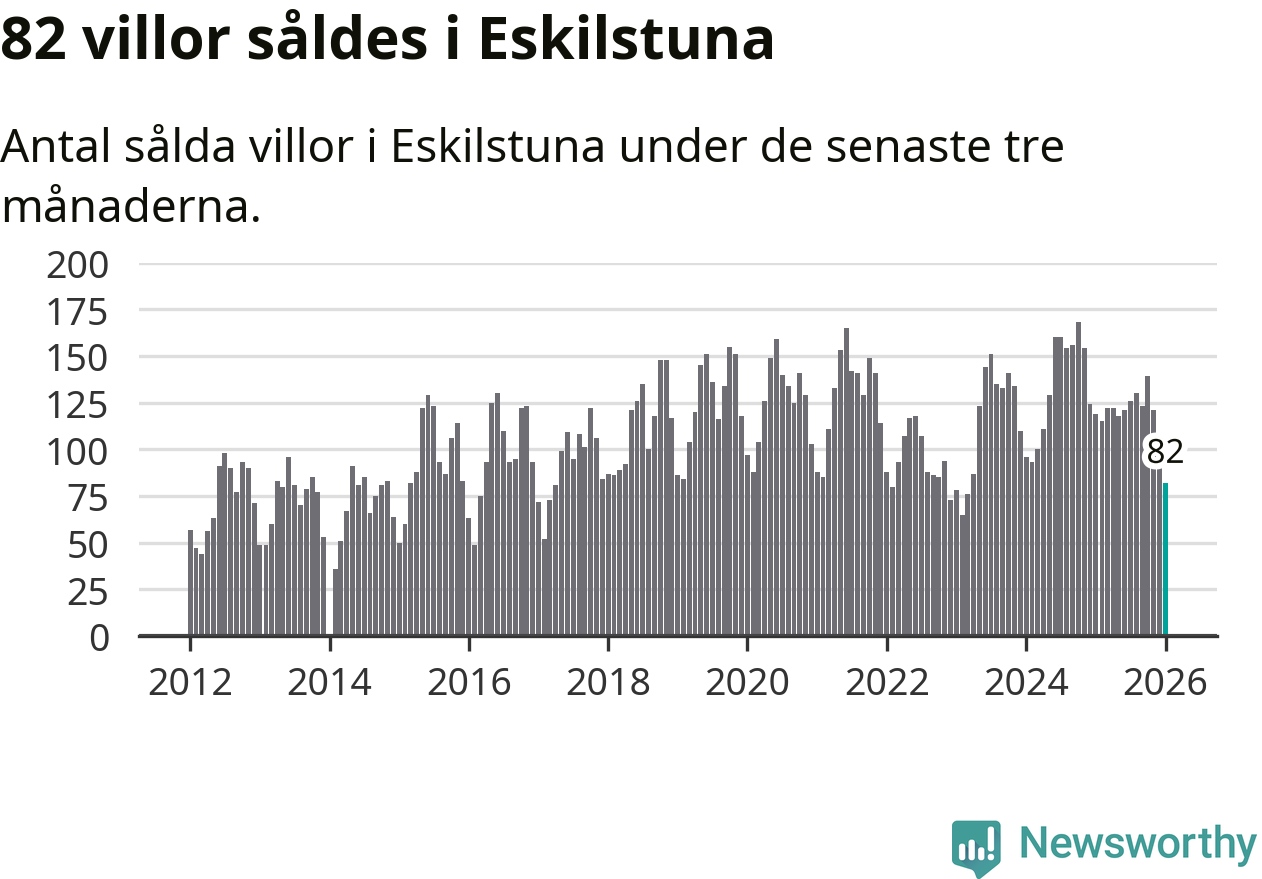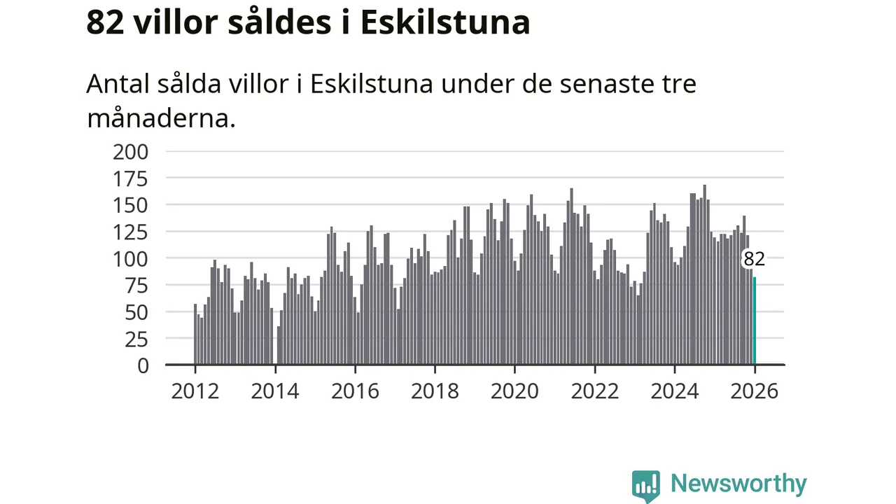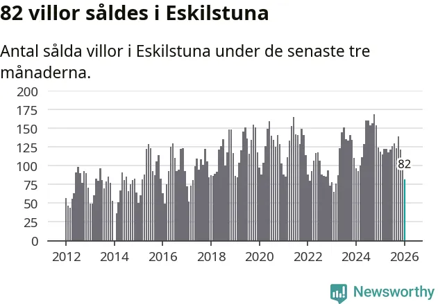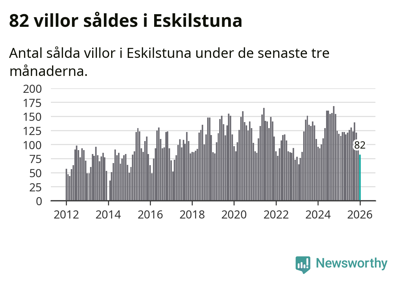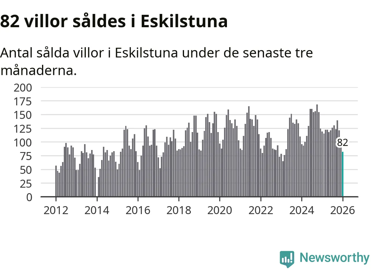 Sammanlagt såldes 82 villor i Eskilstuna kommun mellan november och januari till ett genomsnittligt pris på 3,5 miljoner kronor. I fjol gjordes 119 affärer vid den här tiden på året.