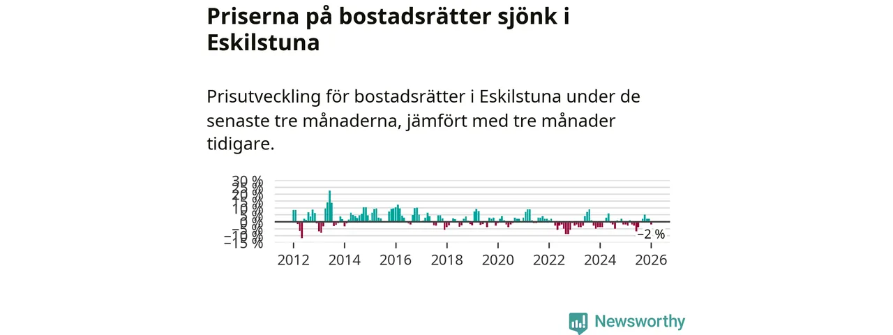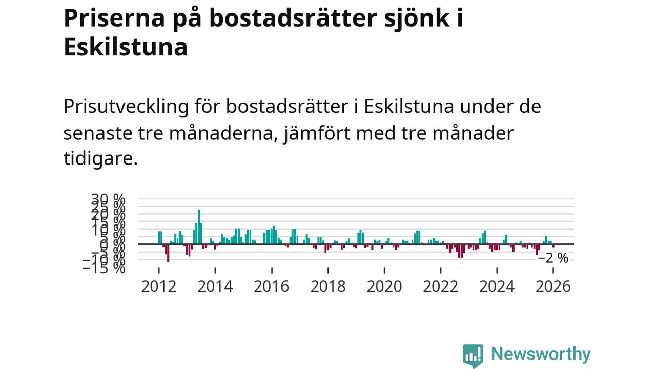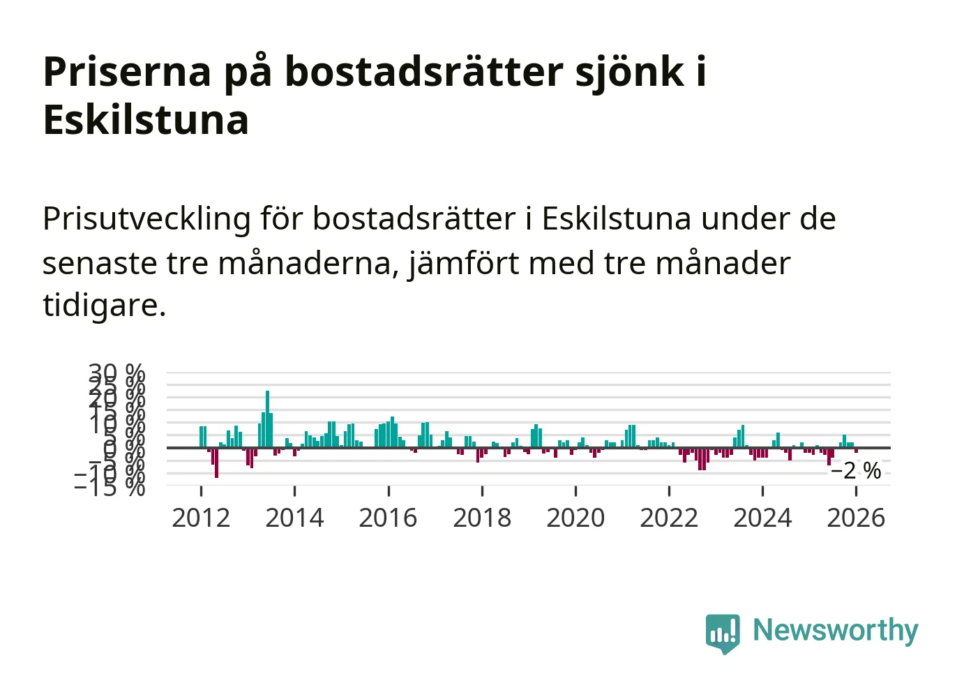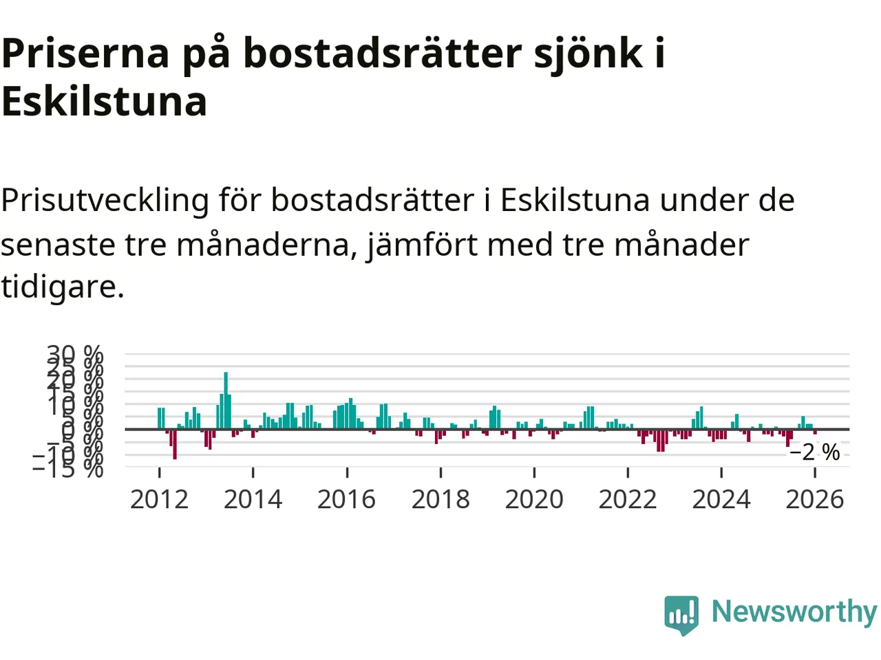 Statistiken visar även på en prisnedgång i Eskilstuna kommun. Medelpriset på försäljningarna av bostadsrätter i kommunen var 2 procent lägre än för tre månader sedan. Även i hela Södermanland sjunker priserna på bostadsrätter. I hela länet noterades en prisnedgång på 3 procent.