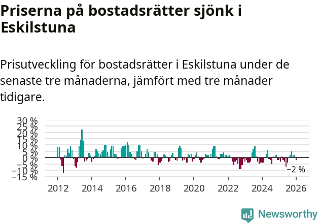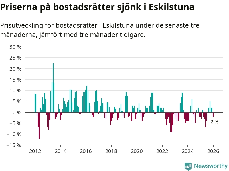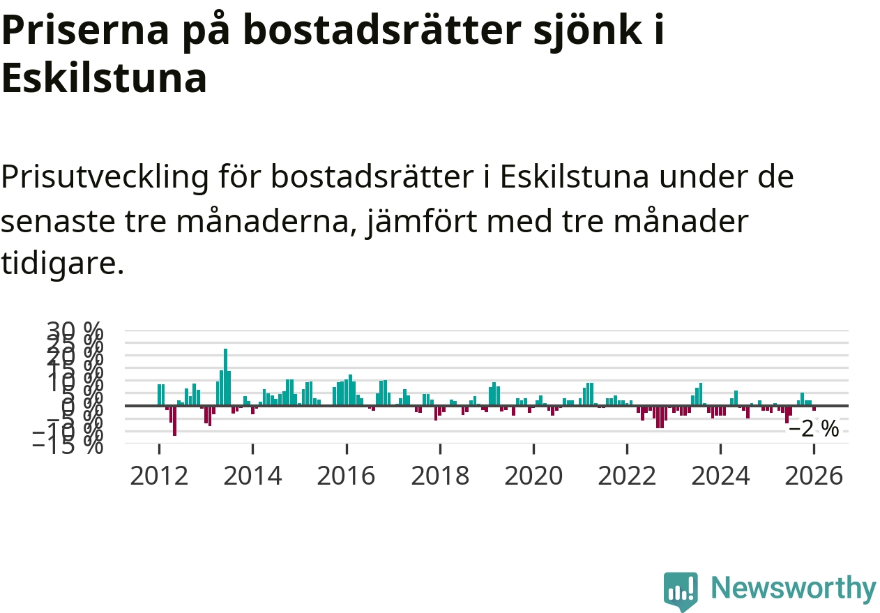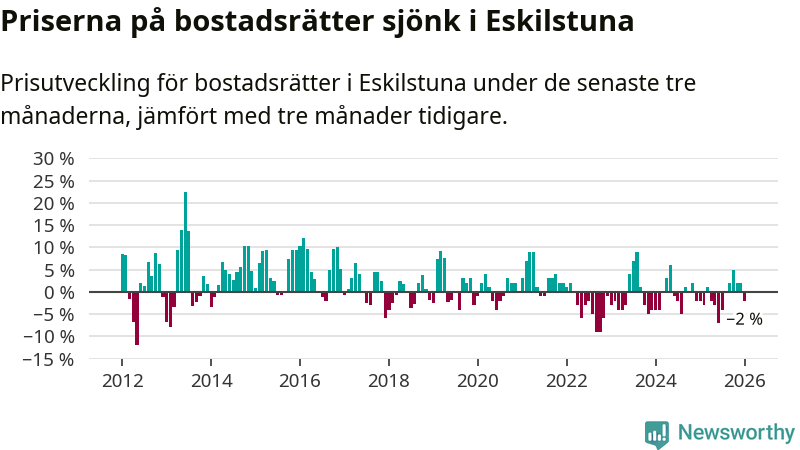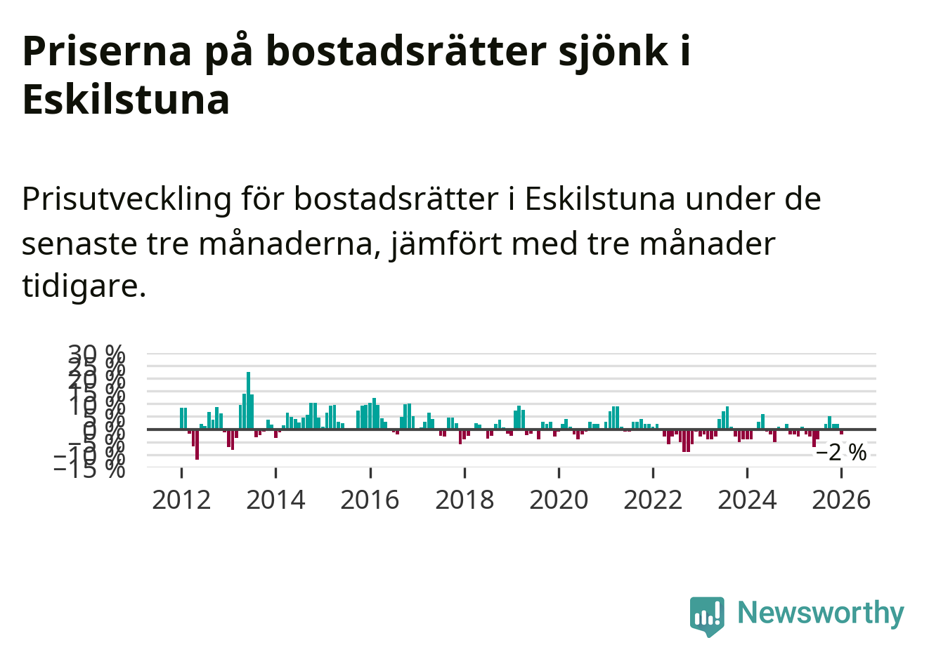 Statistiken visar även på en prisnedgång i Eskilstuna kommun. Medelpriset på försäljningarna av bostadsrätter i kommunen var 2 procent lägre än för tre månader sedan. Även i hela Södermanland sjunker priserna på bostadsrätter. I hela länet noterades en prisnedgång på 3 procent.