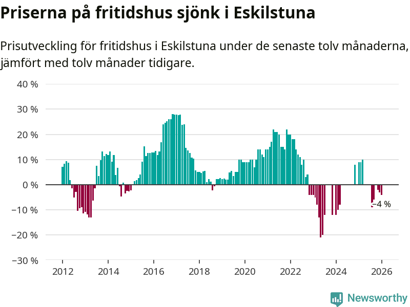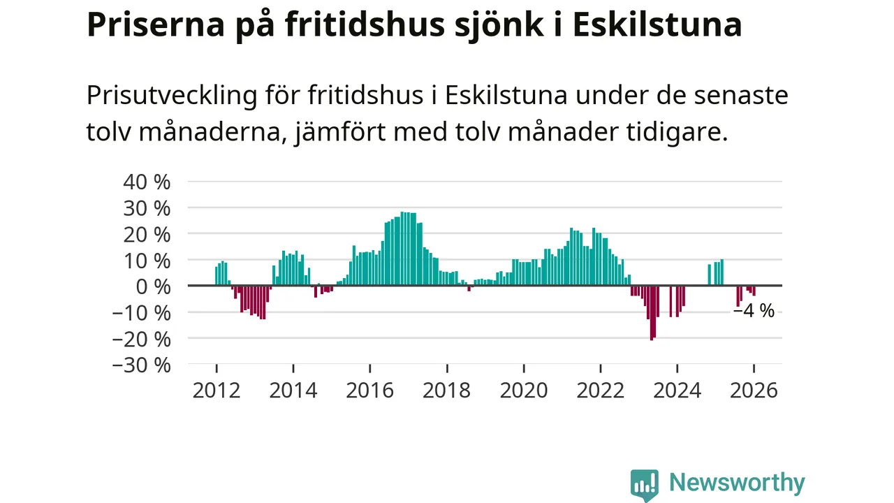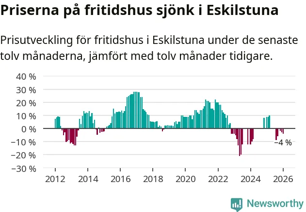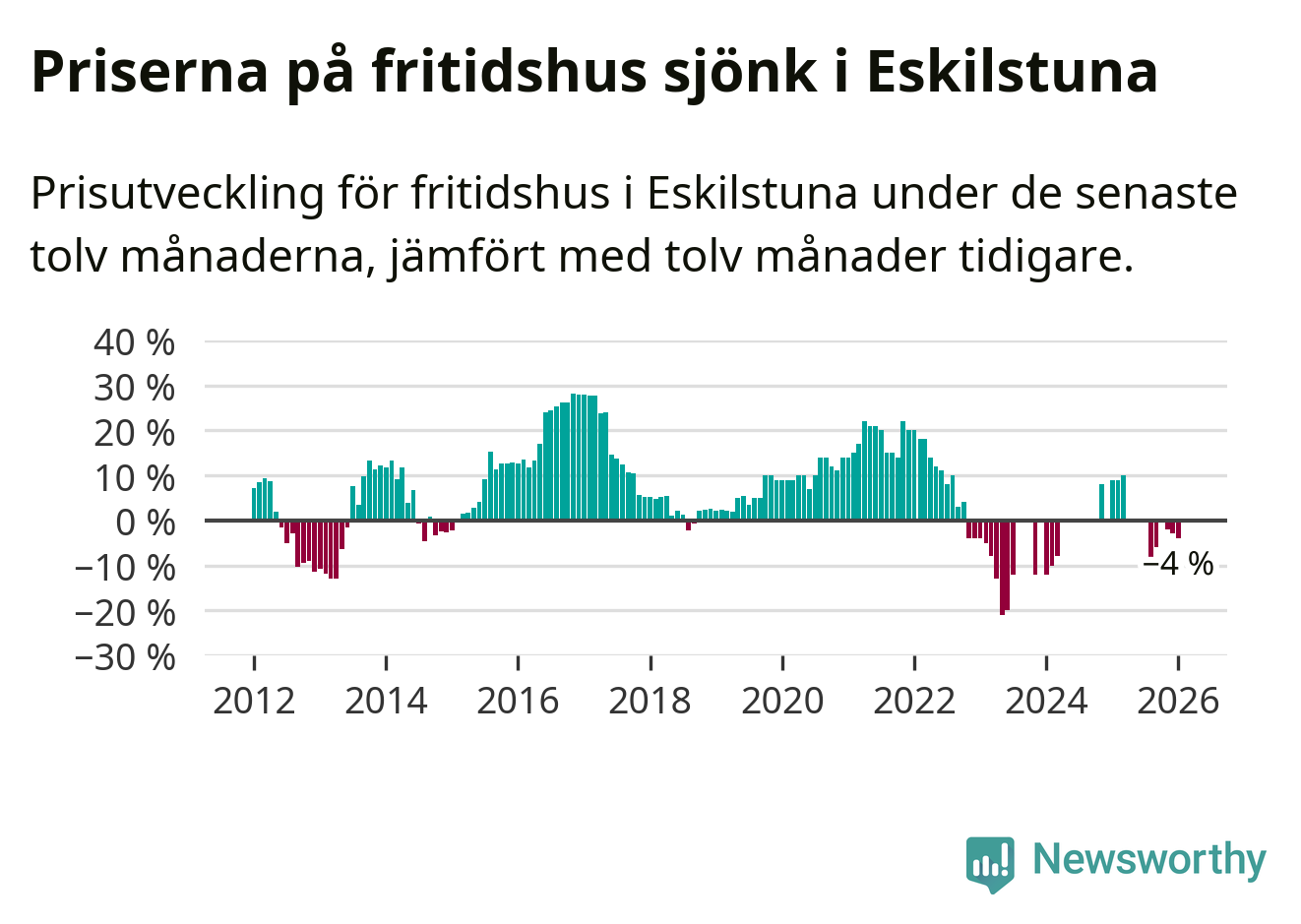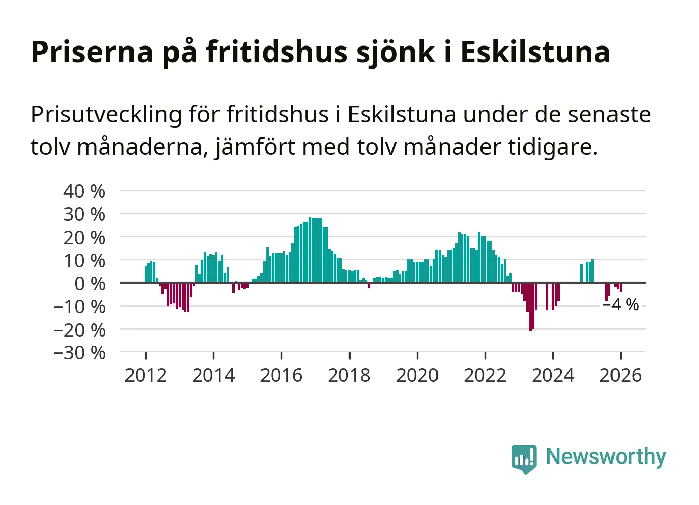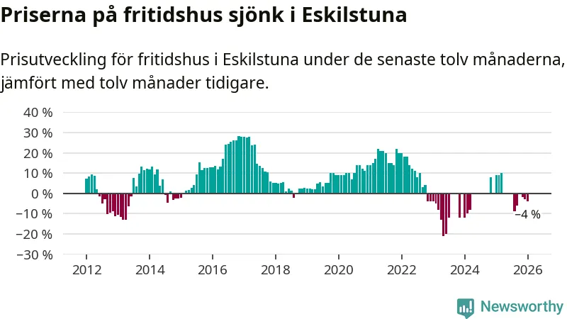 Priserna på fritidshus har gått ner i Eskilstuna kommun. Medelpriset på försäljningarna under de senaste tolv månaderna visar på en nedgång med 4 procent.